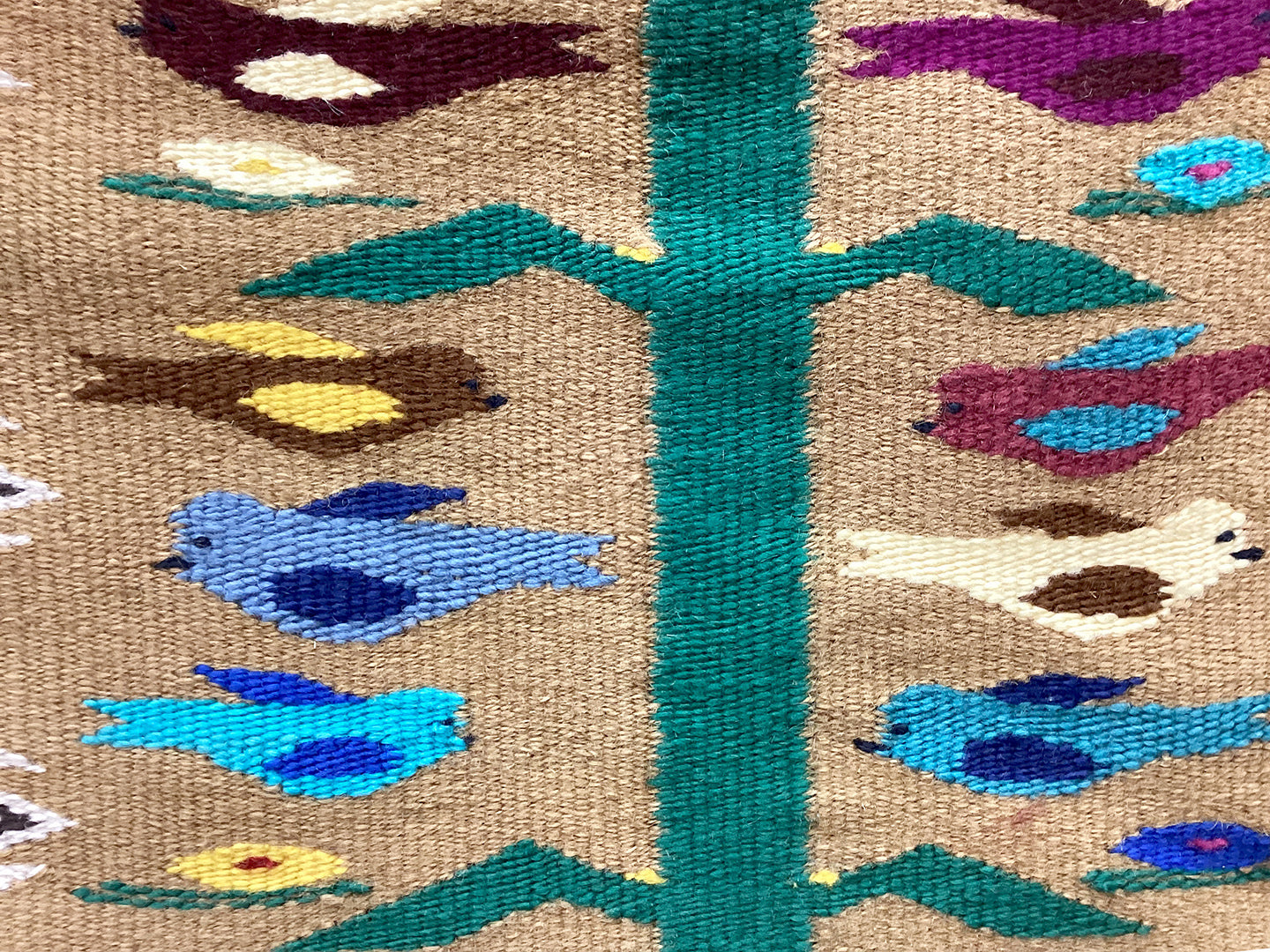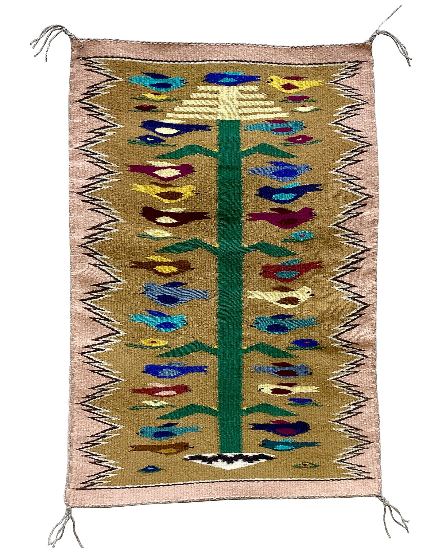 The Navajo Tree of Life is a colorful rug style usually depicting a central corn plant emerging from a Navajo Wedding basket, with birds, feathers and rainbow bars enhancing the design. For the Navajo, corn is sacred, corn is life. “Walking under the corn leaf is the Beauty Way,” a Navajo elder said. Thus everything that is good, life affirming and positive is embodied in a Tree of Life rug.