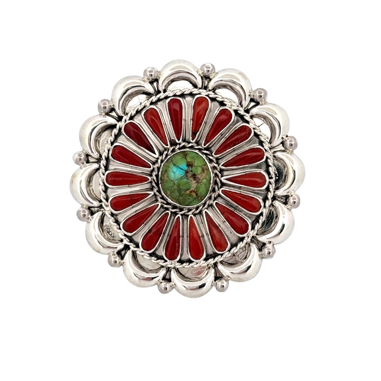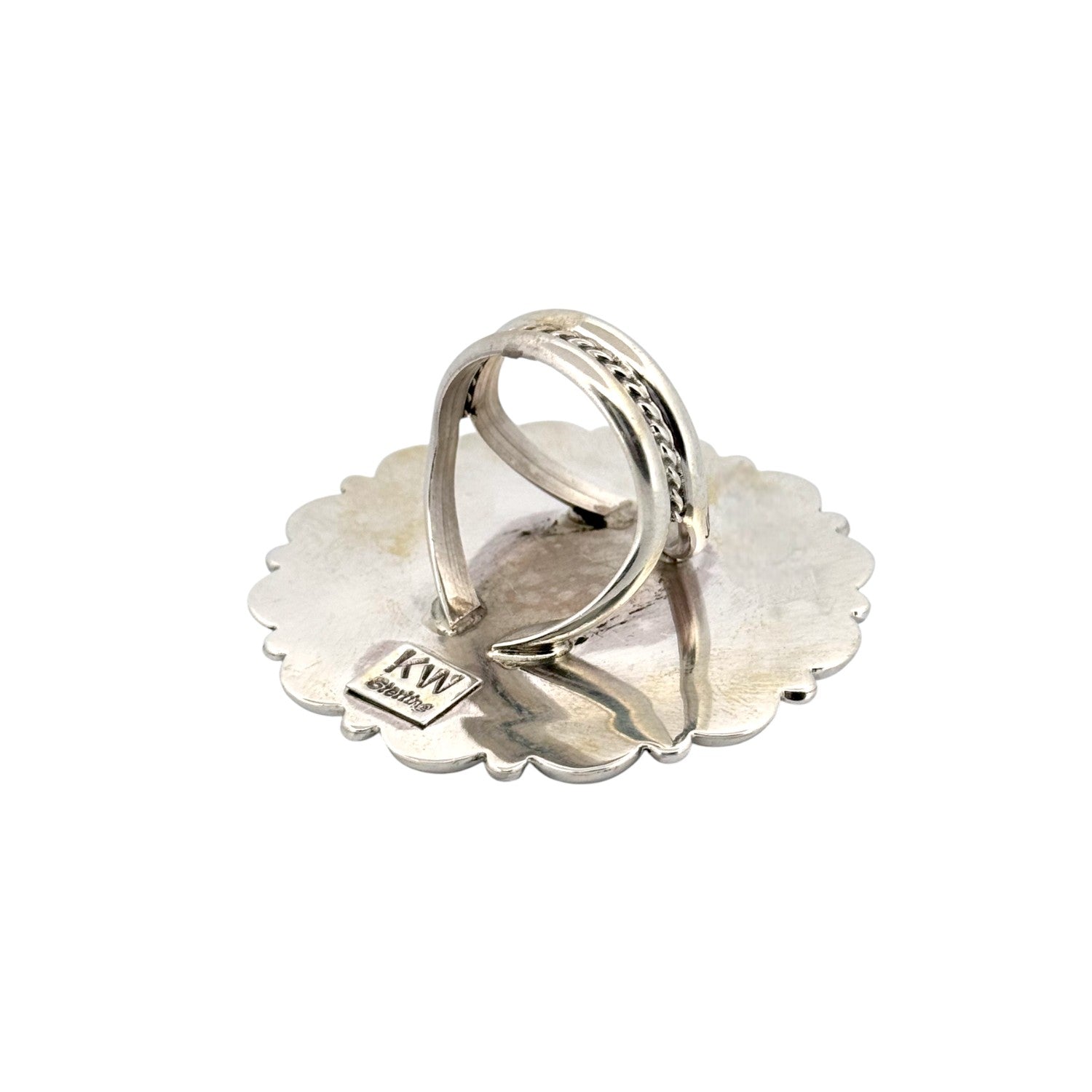 Handcrafted by talented Navajo silversmith Kyle Wilson, this turquoise sterling silver ring is a stunning example of traditional artistry and refined craftsmanship. The design features a vibrant oval turquoise centerpiece, surrounded by meticulous turquoise stones arranged in a radiant sunburst pattern. Each stone is hand-cut and set with precision, creating a seamless flow of color that captures the spirit of the Southwest’s open skies. Framed by detailed scalloped silverwork and twisted rope edging, the piece embodies balance, harmony, and the timeless beauty of Navajo silversmithing. Wilson’s artistry honors generations of tradition while delivering a bold and elegant modern statement.