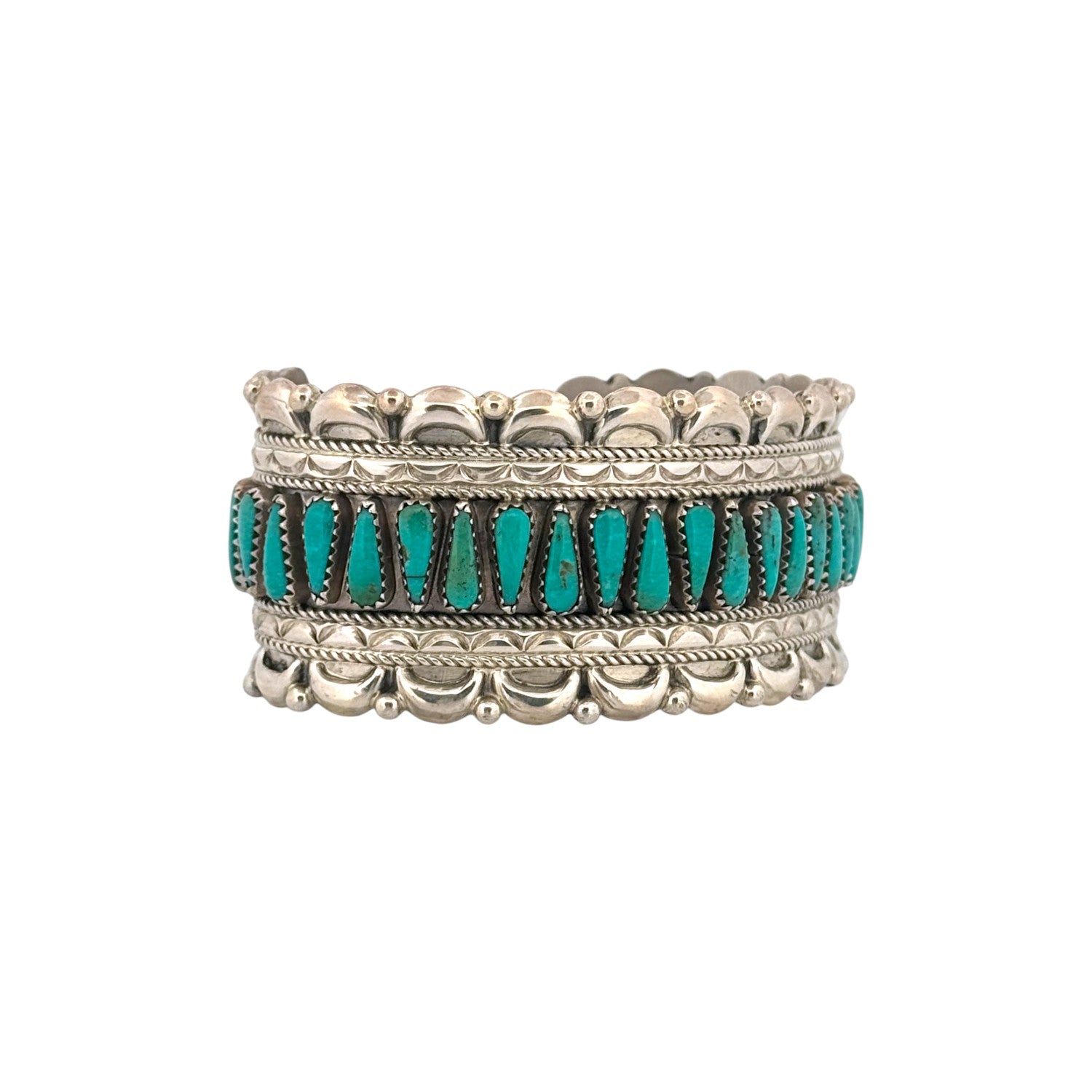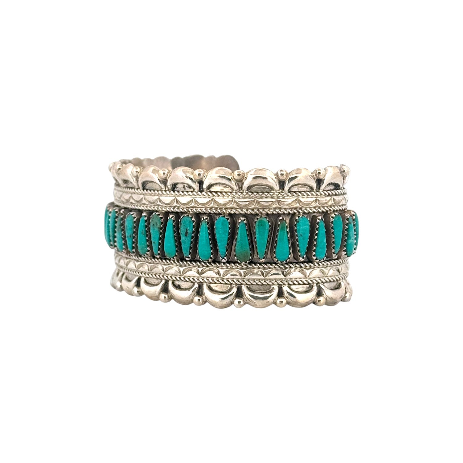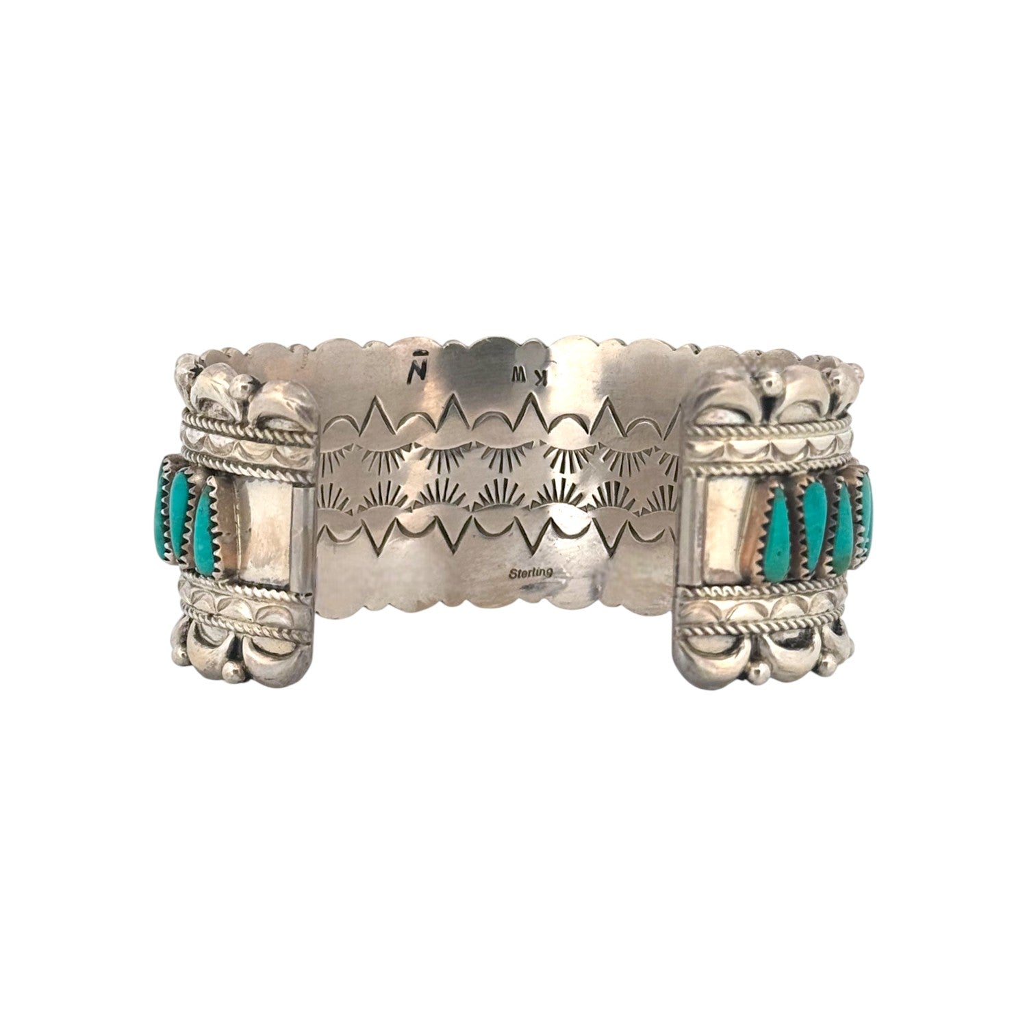 This masterful sterling silver bracelet by Navajo silversmith Kyle Wilson is a striking showcase of Green Kingman turquoise. Each hand-cut stone is set in finely serrated bezels, arranged in a bold row that highlights the rich green hues and natural character unique to this celebrated turquoise mine. Framed by twisted silver rope and bordered with intricate stamp work, the bracelet carries depth, texture, and balance throughout its design. Ornamental silver appliqué and beadwork further enhance its elegance, giving the piece dimension and a refined artistry. Handmade with care, it reflects the enduring traditions of Navajo silversmithing, where precision and cultural heritage unite in wearable art.