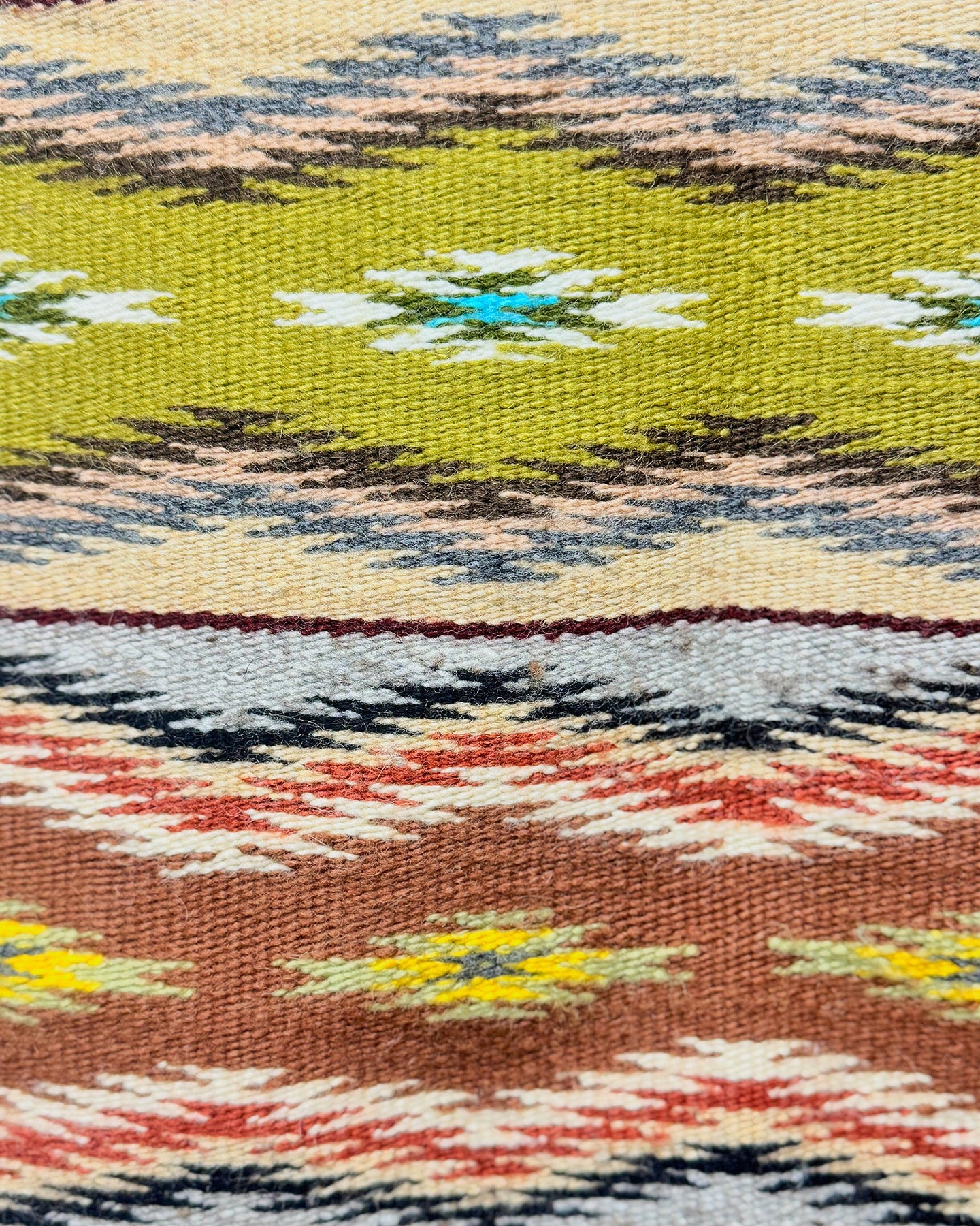 Traders like JB Moore would be one of the first to introduce the art of the Navajo to collectors back east, rugs not silver. He put together a catalog of different weavings that would be sold in large quantities. Wide Ruins, Arizona had a trading post where vegetal dyes were encouraged in rugs. That, along with the demand for excellence in the weaving has led many collectors to desire these fine rugs. Navajo weaver Jean Wilson wove this stunning branded rug. It reflects the awesome colors of the Wide Ruins area, enjoy. Before the trains started coming to this part of the world and businesses like the Fred Harvey Company started selling Navajo jewelry to the masses, most people back east didn't know anything of the Navajo.