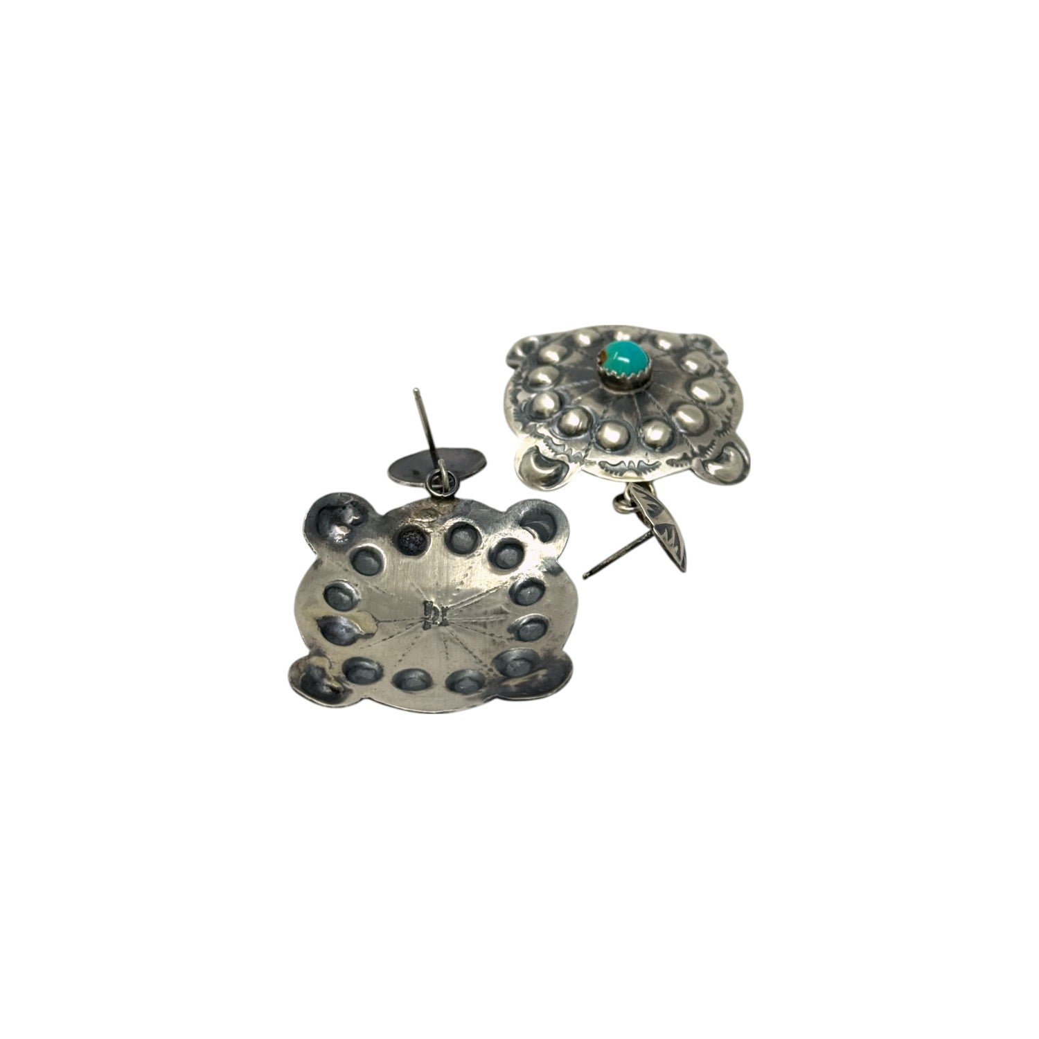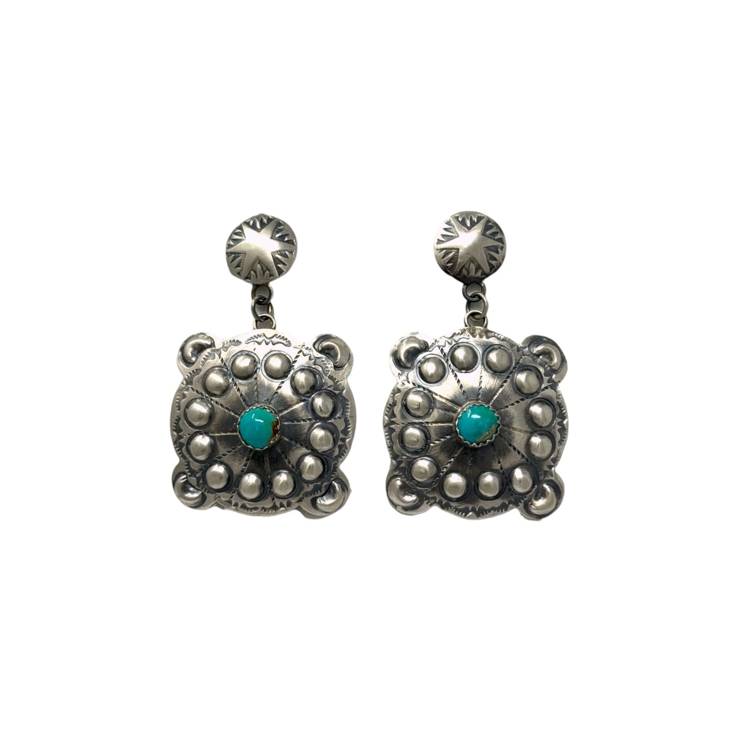 Handmade by Navajo silversmith Rolanda Yazzie, these striking earrings are a bold tribute to tradition and craftsmanship. Each sterling silver earring is adorned with a central Kingman turquoise stone, its vivid blue hue radiating against the deeply stamped and domed silver design. The circular drop features intricate repousse work, accented by starburst stampings and bordered with scalloped edges for added dimension. Suspended from hand stamped silver studs, the earrings are designed to move with grace, catching light and attention with every turn.
