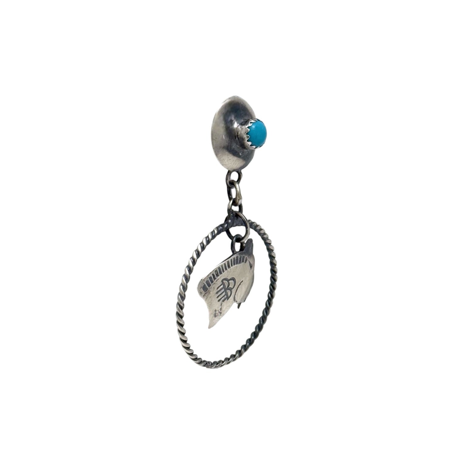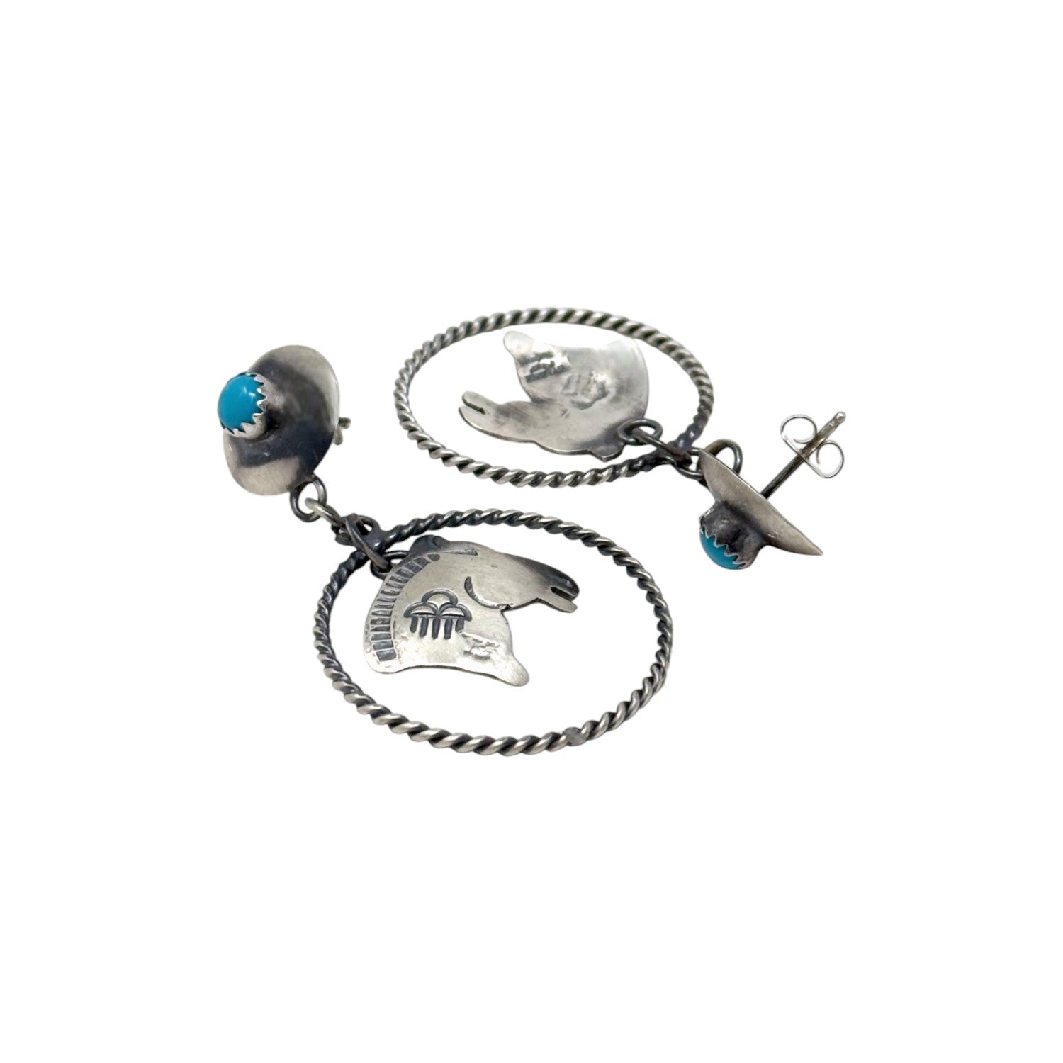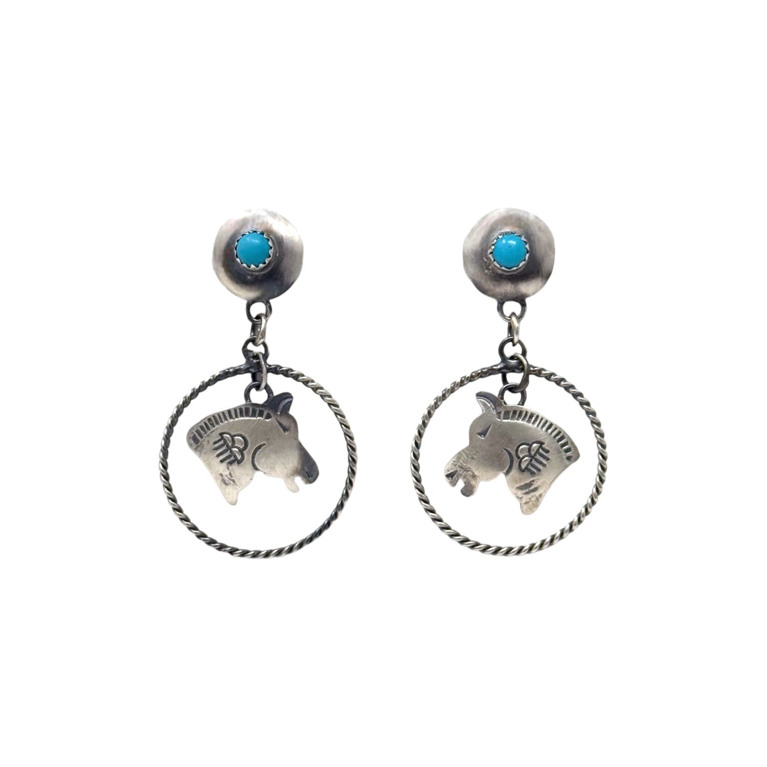 These sterling silver earrings by Navajo silversmith Gabrielle Yazzie are a stunning blend of cultural storytelling and refined artistry. Each earring features a bezel-set Sleeping Beauty turquoise stone at the top, prized for its clear sky-blue hue and timeless elegance. Dangling below, a finely stamped horse head design rests inside a twisted silver hoop, symbolizing strength, freedom, and connection to the land. The oxidized detailing adds depth and contrast, enhancing the precision of Yazzie’s craftsmanship. Lightweight yet full of presence, these earrings move gracefully with the wearer, making them equally suited for daily wear or special occasions.