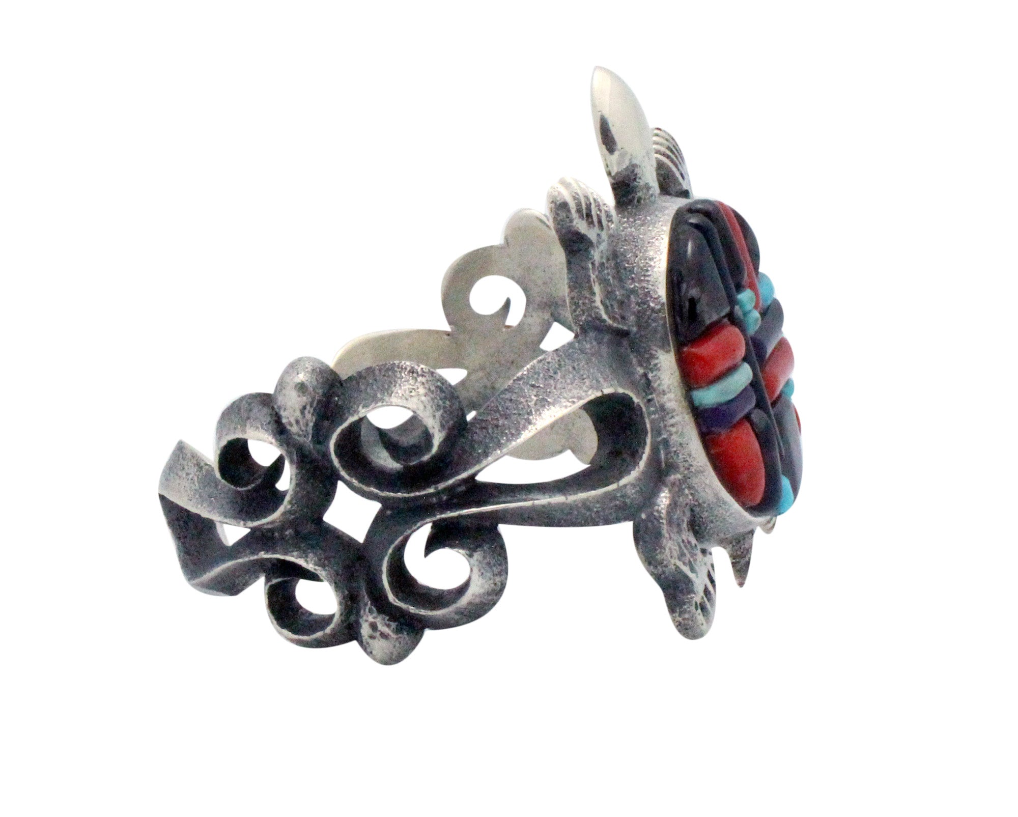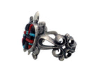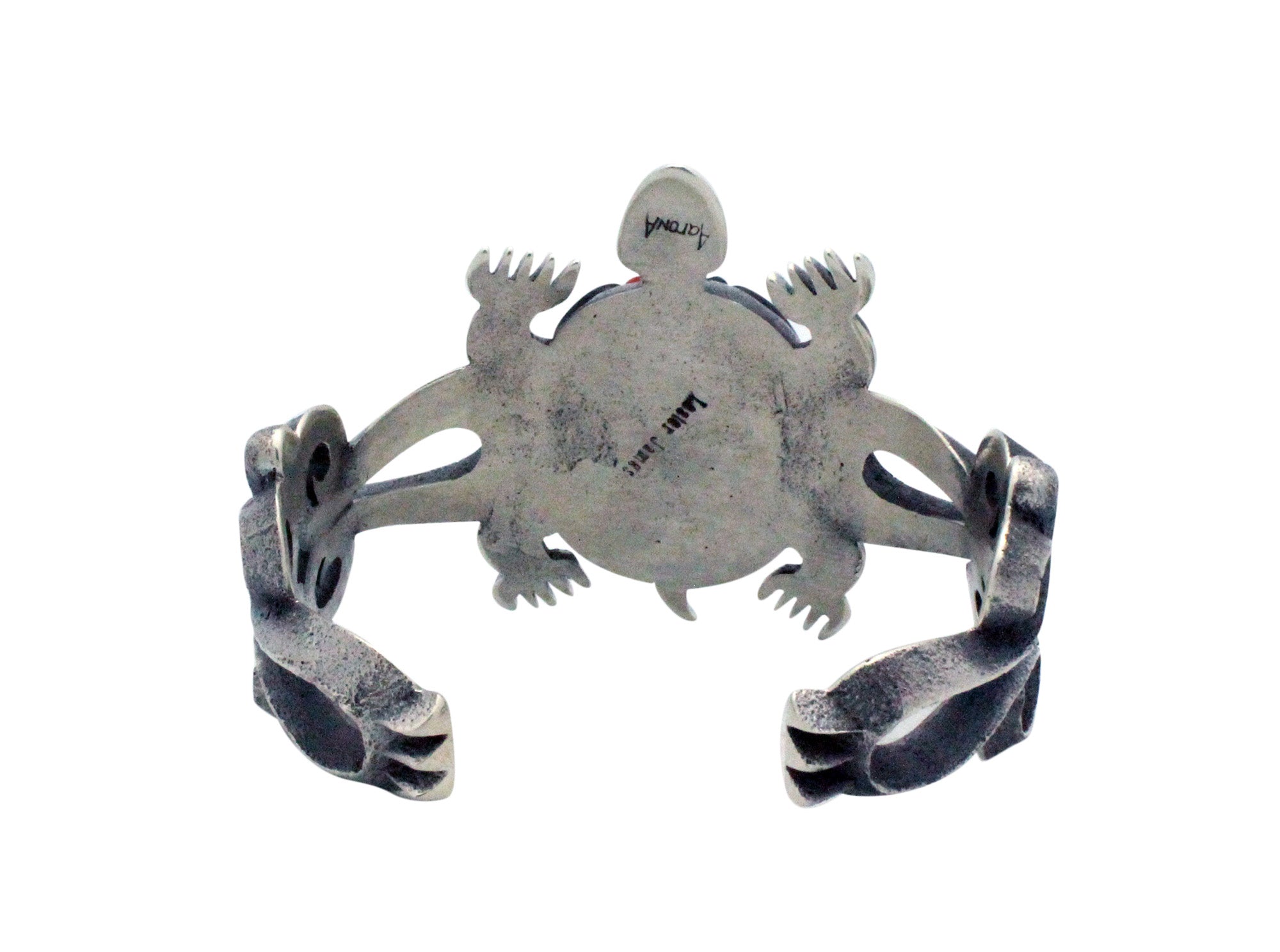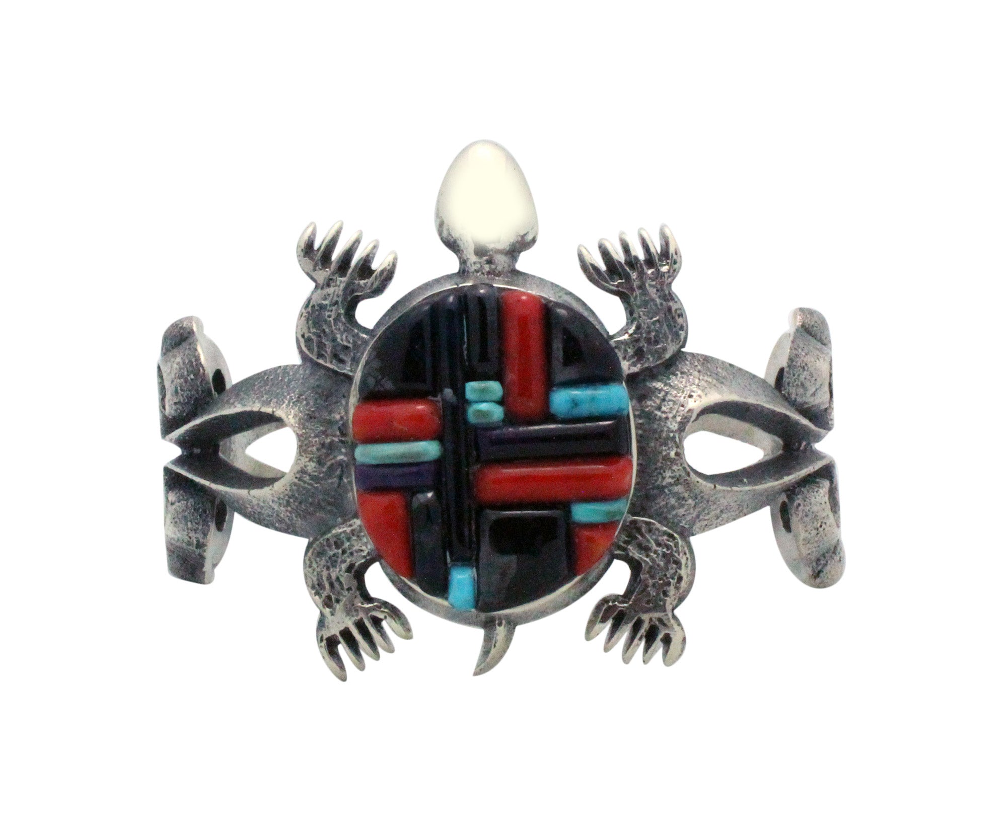 Imagine a sandy beach at night with the moon and stars creating a magical nightglow. A sea turtle comes to shore and makes the evening magical. Navajo award-winning artist Aaron Anderson celebrates the magnificent sea turtle with this tufa cast bracelet. The natural texture of the tufa reveals the sandy beach, curves of the silver waves crashing in, and the light and dark polishes of the silver reveal the glowing night. You will find in the center of the large sea turtle filled with an explosion of inlaid stone colors that include purple sugilite, red coral and blue turquoise. If you are attracted to sea turtles this will make the perfect piece of wearable art to match the passion.