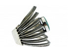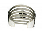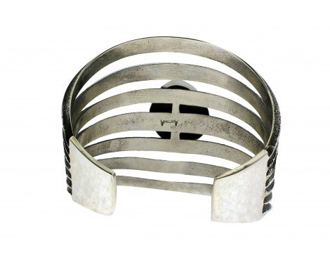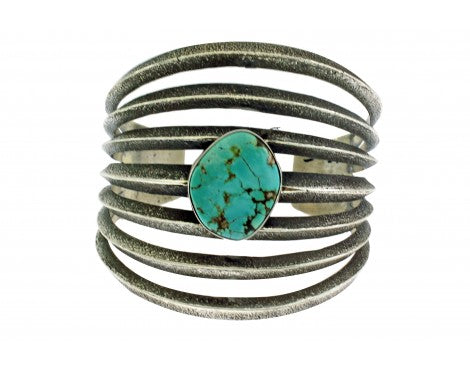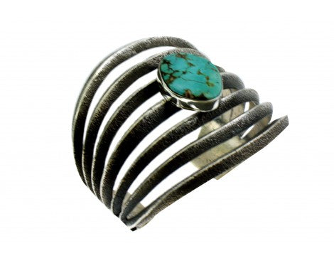Legendary artist Kenneth Begay was known for making some very modern looks. At the time Kenneth began making the open design it was a very contemporary look. They style has been redone by a number of artists, each given the open design their own interpretation. This time Navajo artist Aaron Anderson has made on. He has an incredible talent that allows him to turn stone and liquid silver into amazing pieces of wearable art. His studio is the perfect place to work, very calming colors along with a great open space. Plus, just like Kenneth, Aaron draws on tradition, which inspires many of his modern creations. You will find a piece of beautiful Royal Blue Royston Turquoise set in the center of the seven-wire bracelet. You will find a combination of textured and smooth finished silver on this amazing piece.