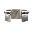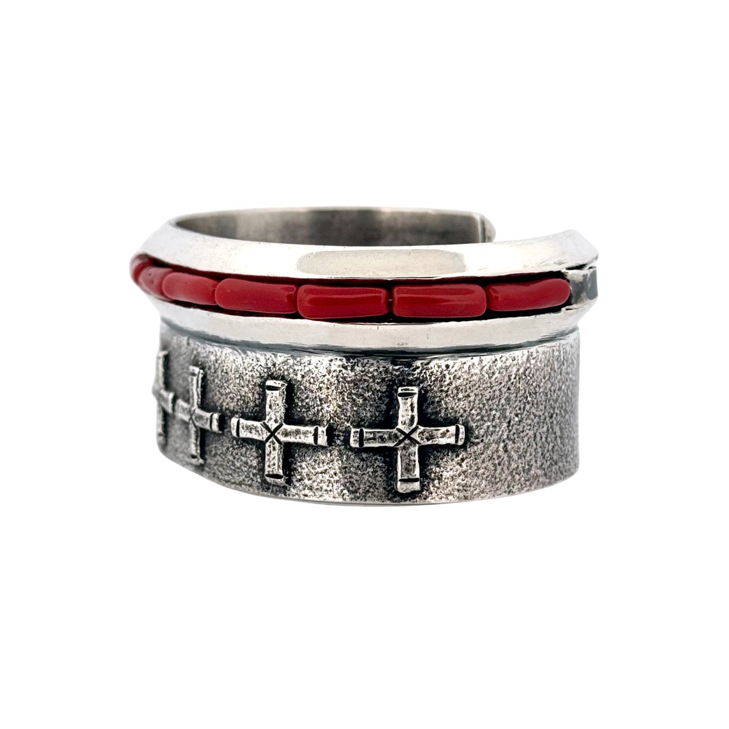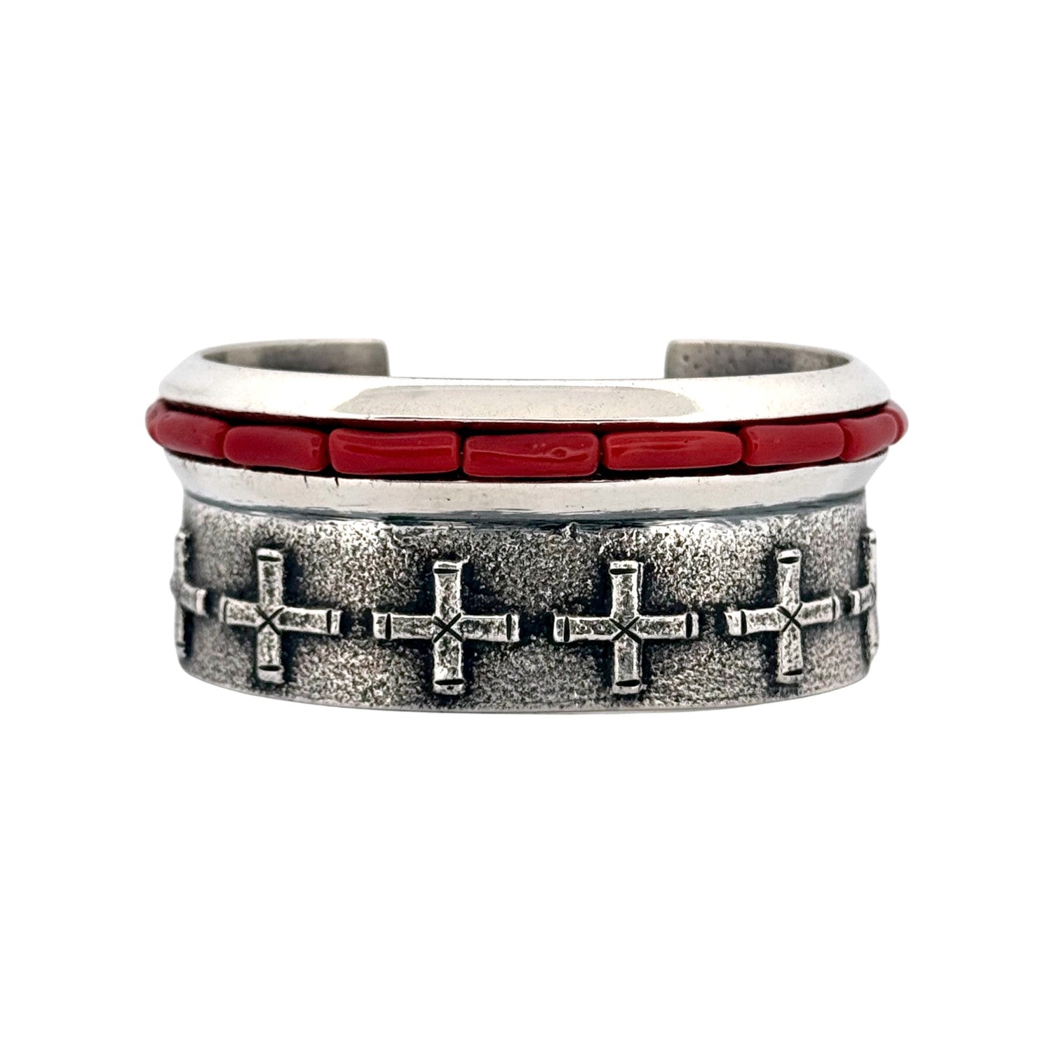 This powerful Navajo handmade bracelet by master silversmith Aaron Anderson features striking Coral inlay set in bold sterling silver. Crafted using the traditional tufa cast technique, the bracelet showcases Anderson’s renowned textural style with finely detailed cross motifs along the band. The deep red coral adds a vivid contrast to the matte silver surface, symbolizing strength, vitality, and life. Each element of this cuff reflects Anderson’s exceptional craftsmanship and contemporary Navajo artistry.