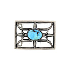 This sterling silver buckle by renowned Navajo silversmith Aaron Anderson features a striking Golden Hills turquoise centerpiece. The vivid blue stone, with its natural brown matrix, is framed in a hand-twisted silver bezel that enhances its beauty and character. Surrounding the turquoise is an intricate openwork design with finely stamped detailing, giving the piece both depth and balance. The rectangular frame is bold yet refined, showcasing Anderson’s mastery of traditional Navajo tufa casting and silversmithing techniques. The contrast between the polished stone and the oxidized silverwork highlights the craftsmanship and artistry poured into this piece. Strong and durable, this buckle is both a functional accessory and a wearable work of art.