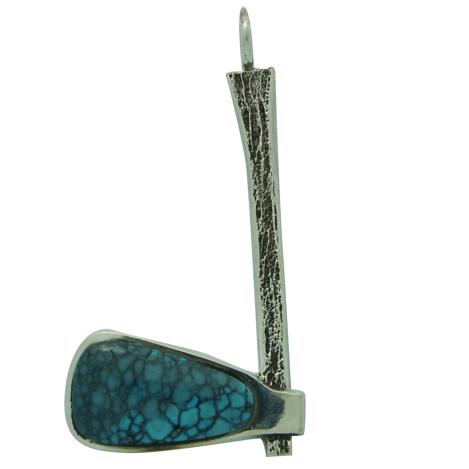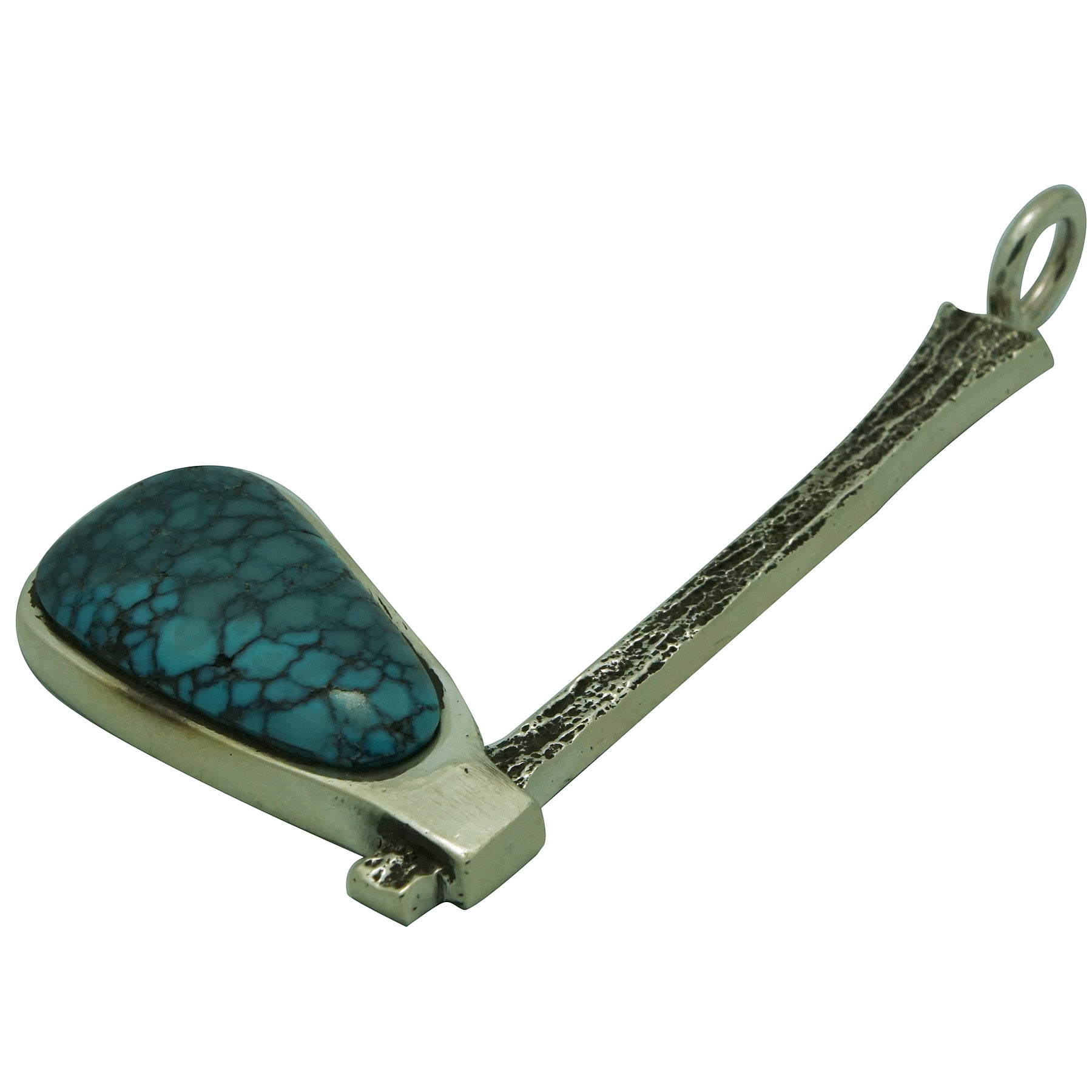We think of the tomahawk as a weapon, but this versatile creation was a very important tool for the Native American. It was used for many things including the important task of hunting. Navajo silversmith Aaron Anderson crafted this pendant out of tufa rock, a fascinating tomahawk design. The top of the tomahawk displays a beautiful piece of Chinese turquoise that reveals a a deep blue color that is filled with a spider web matrix. You will appreciate the detail of wooden (silver) handle. A large bail finishes the pendant, something that will allow you to wear this with many different style necklaces.
