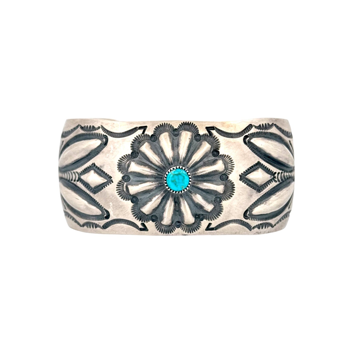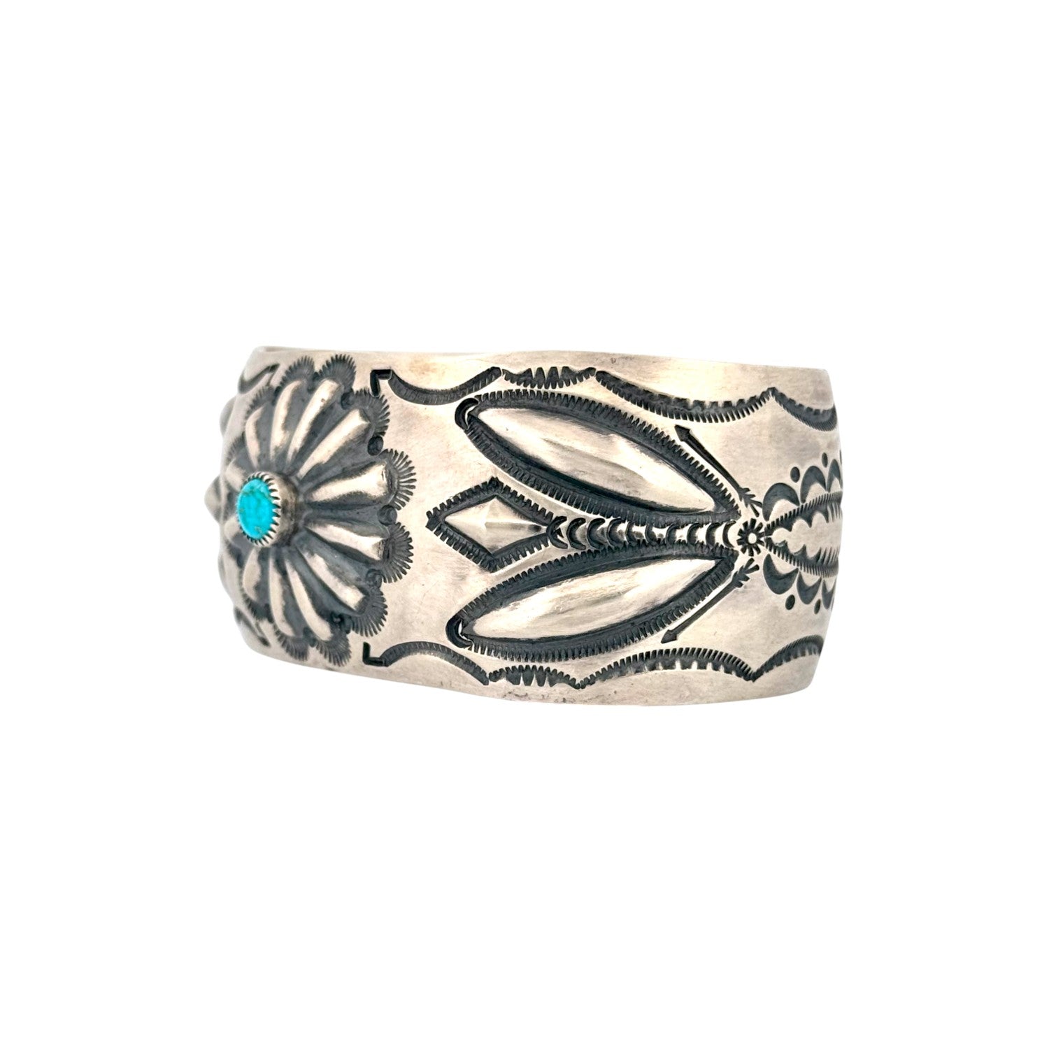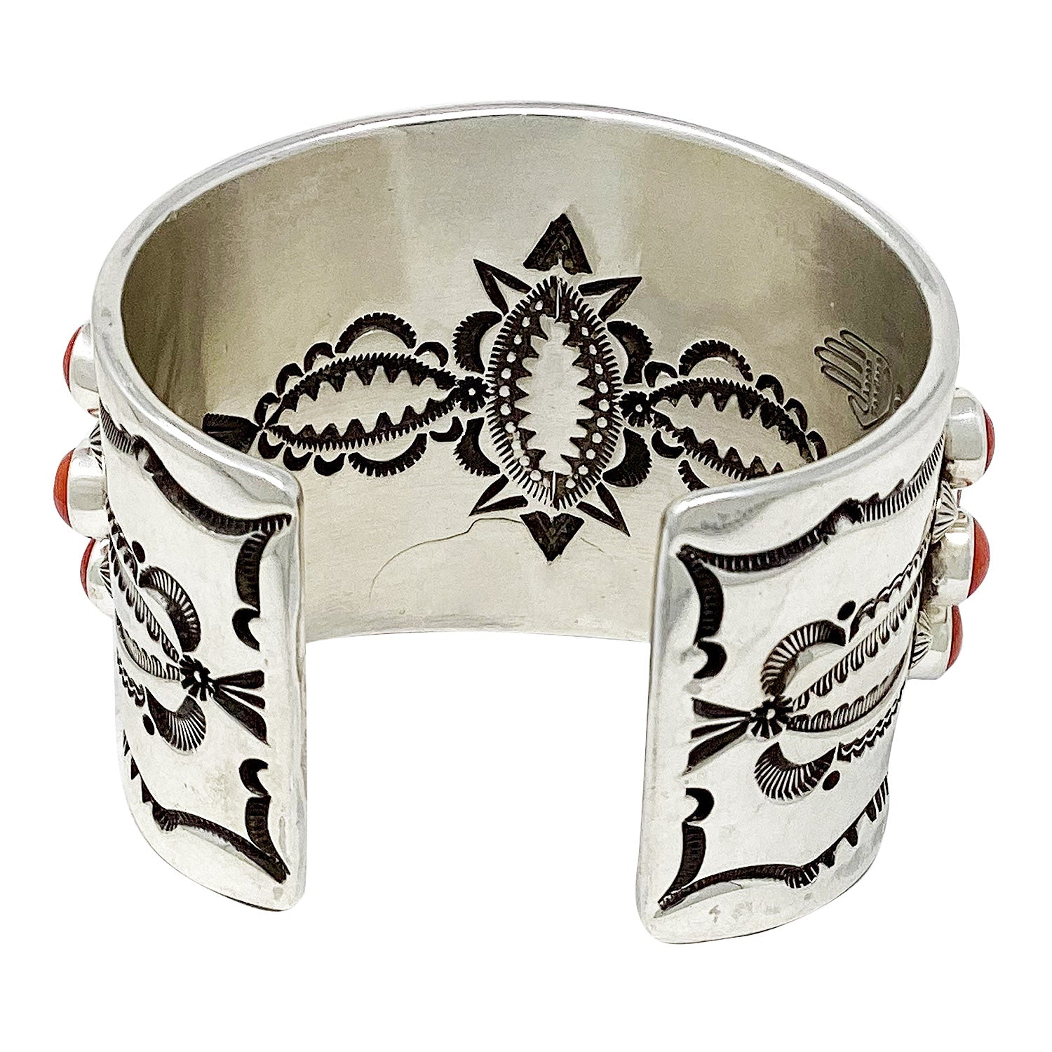 Creation is perhaps the single word that best describes the talent of Aaron Toadlena. He and Eve, his wife of twenty-one years and their two daughters, two sons, and grandson, live with the four sacred mountains of his people the Dine' in the southwest highlands of Arizona.Aaron, understands that his talent is a blessing from the Holy People, with this gift he has sustained the livelihood of his family. All of the jewelry made by Aaron are stamped with a hand print, which is symbolic of the creators five finger clan. The ideas and creation of his jewelry evolve when his mind, heart, eyes and hands work in concert.The stones and shells which he works with have a very special meaning. Just as his progenies have done, his people continue to make their offerings of white shell, turquoise, abalone shell, and jet near the natural streams for goodness of life.With the same thought in mind the precious stones and shells are complemented with silver and gold. Aaron creates the melody of fine craftsmanship in the late evening or early dawn, when the ideas echo from the well of his soul. In the language of his people Toadlena translates into "where the streams come together."