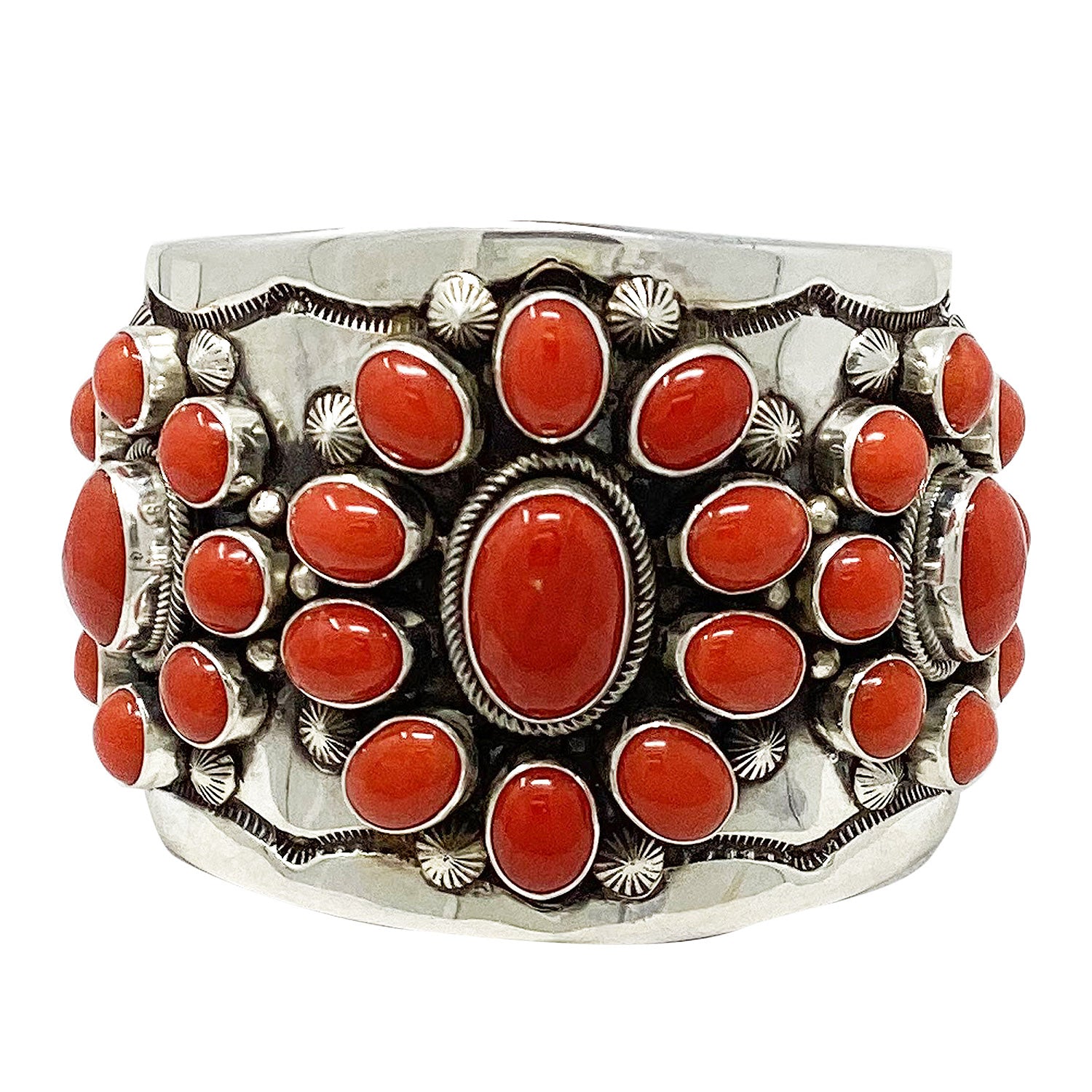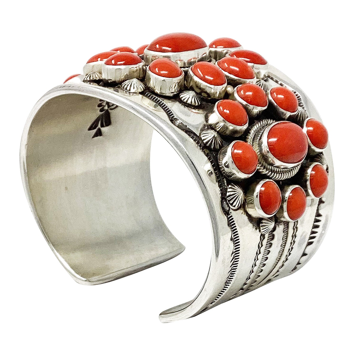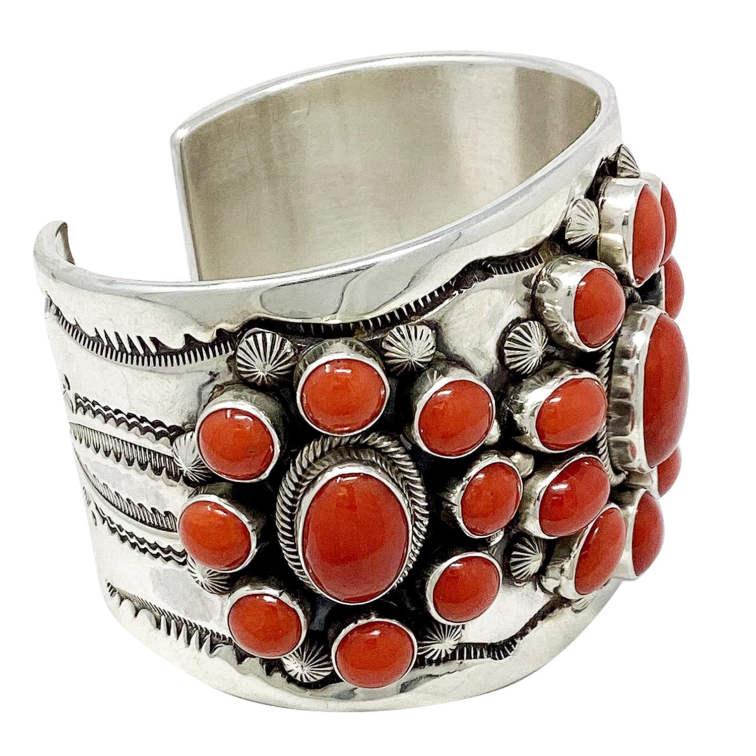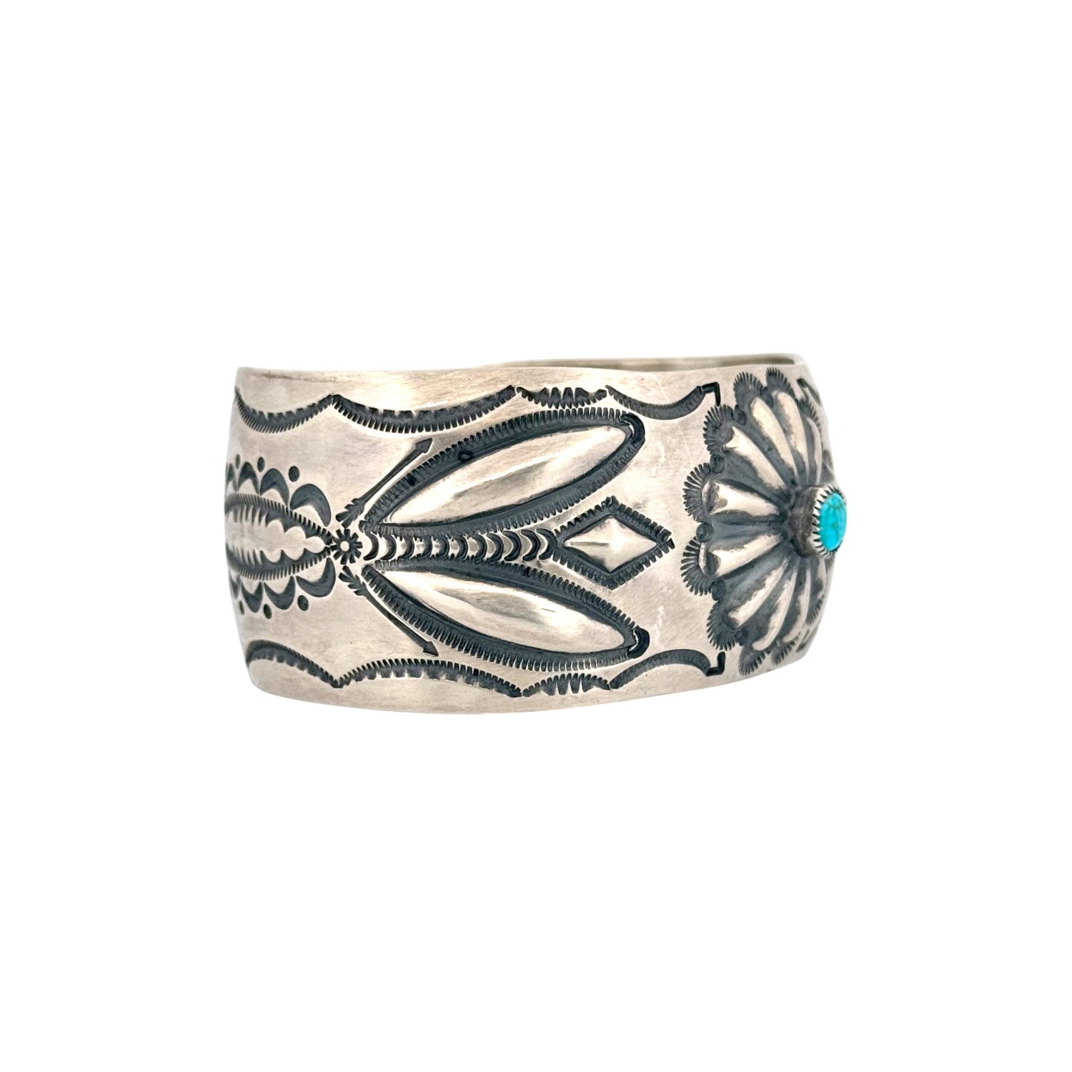 Creation is perhaps the single word that best describes the talent of Aaron Toadlena. He and Eve, his wife of twenty-one years and their two daughters, two sons, and grandson, live with the four sacred mountains of his people the Dine' in the southwest highlands of Arizona.Aaron, understands that his talent is a blessing from the Holy People, with this gift he has sustained the livelihood of his family. All of the jewelry made by Aaron are stamped with a hand print, which is symbolic of the creators five finger clan. The ideas and creation of his jewelry evolve when his mind, heart, eyes and hands work in concert.The stones and shells which he works with have a very special meaning. Just as his progenies have done, his people continue to make their offerings of white shell, turquoise, abalone shell, and jet near the natural streams for goodness of life.With the same thought in mind the precious stones and shells are complemented with silver and gold. Aaron creates the melody of fine craftsmanship in the late evening or early dawn, when the ideas echo from the well of his soul. In the language of his people Toadlena translates into "where the streams come together."