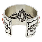 This cluster deep red Mediterranean Coral stones will remind you of your favorite red hots candy, except they are a little bigger. These are the darkest pieces of red coral you may have ever seen, amazing pieces. Navajo silversmith Aaron Toadlena has set the stones in a classic cluster pattern. Each stone is a perfect match and highlighted by twisted wire and styled drops. Aaron has used an old style stamped cuff that is a very thick piece of silver with a mirror shine. This is one of those impressive wearing cuffs that shouts Navajo silver and stone. Aaron is known for his deep stamp designs and this cuff is filled with them, enjoy your newest piece of Navajo treasure.
