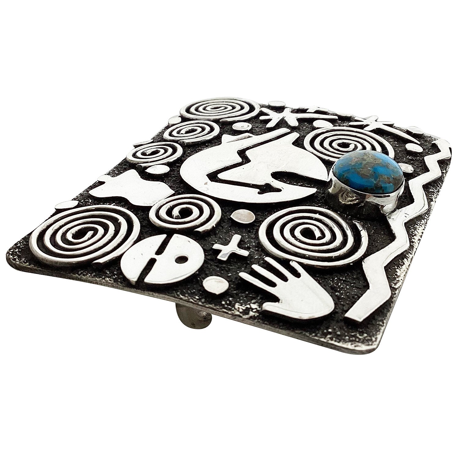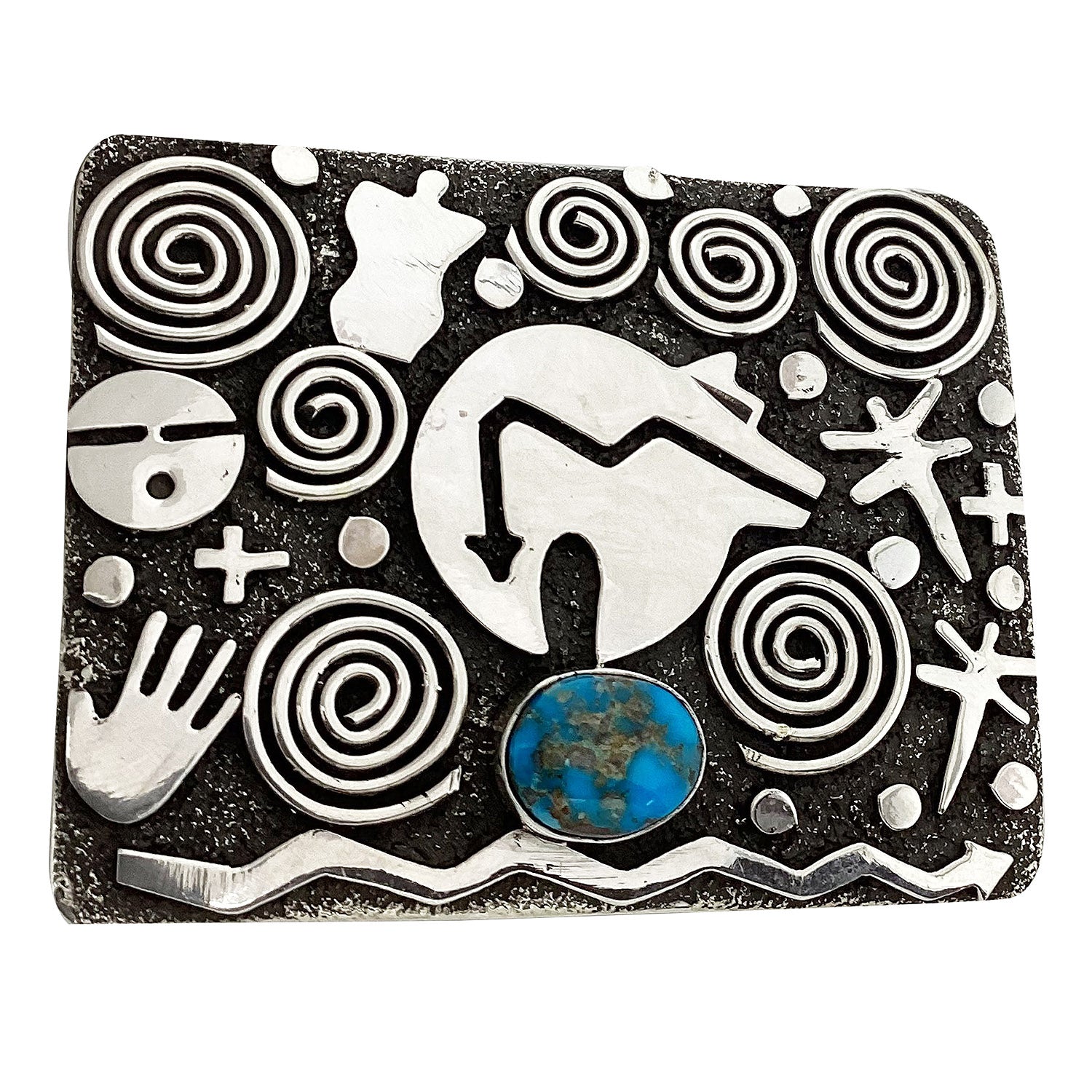 Alex Sanchez, Belt Buckle, Kingman Turquoise, Petroglyphs, Navajo Made, 1 1/2"
