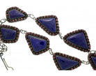Navajo silversmith Anthony Skeets made this magnificent cluster necklace. You are going to be blown away by the size and all of the beautiful stones. Anthony has used amazing pieces of deep blue lapis along with small round cuts of purple spiny oyster shell to create the cluster. Anthony is known for his cluster work, a skill he learned in the workshop of the late Kirk Smith. This necklace has seven large cuts of lapis and 163 spiny oyster shells. The cluster is done in a classic presentation with twisted wire and silver drops that highlight the stones. Finished with a handmade chain and rustic brushed finish for a true Southwest look.