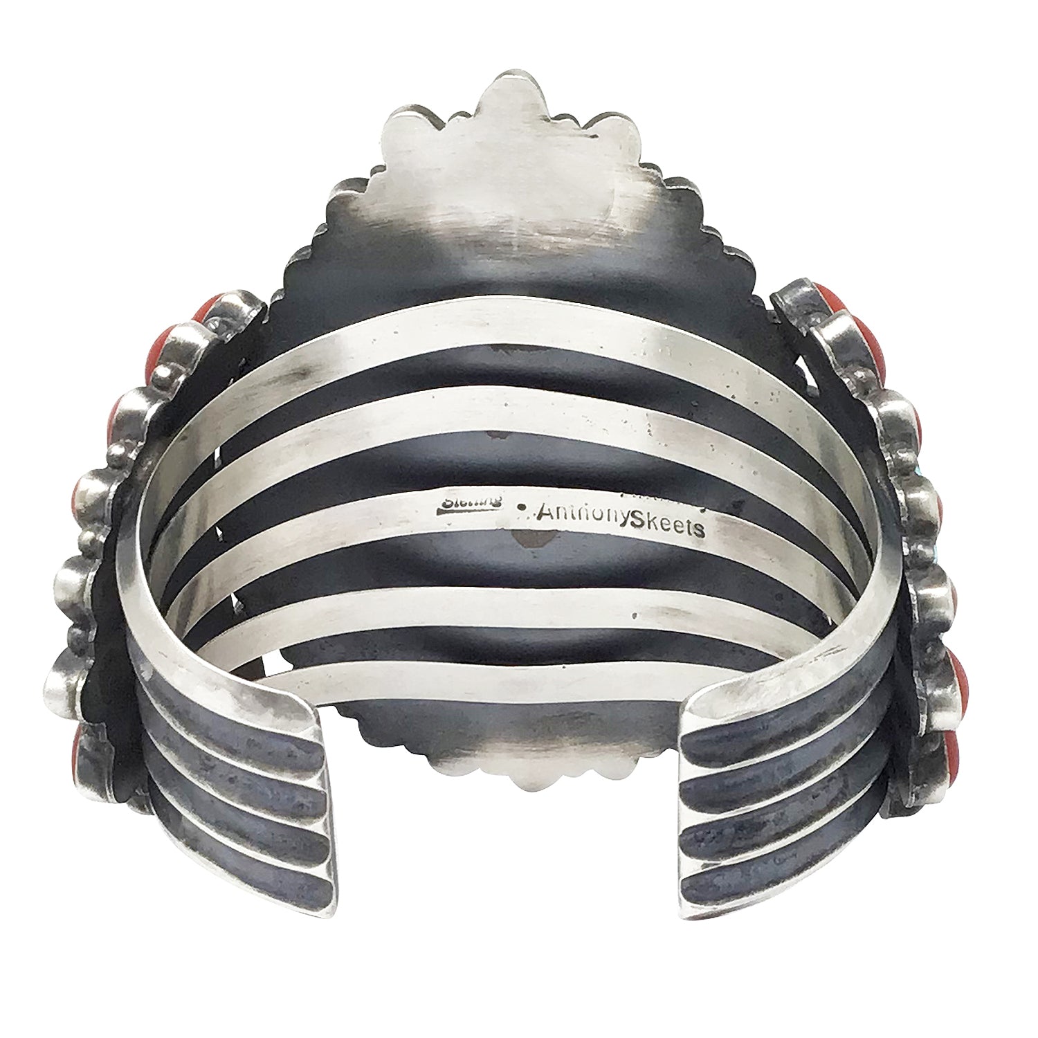 Navajo silversmith Anthony Skeets gets his hands on some great rocks. You couldn't ask for a better combination than this cuff. This bracelet starts with three big cuts of Kingman Turquoise that reveals a sky blue color with a swirling matrix. Surrounding those three rocks is an explosion of deep red Mediterranean Coral stones. Anthony uses twisted wire and silver drops to finish the decoration on top of the cuff and uses an easy wearing five-wire bracelet shank. All of the silver has been finished with a rustic brushed antique look that will make this one of your favorites. We have a variety of Anthony’s pieces in the Trading Post if you are looking to make a very impressive cluster set.