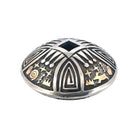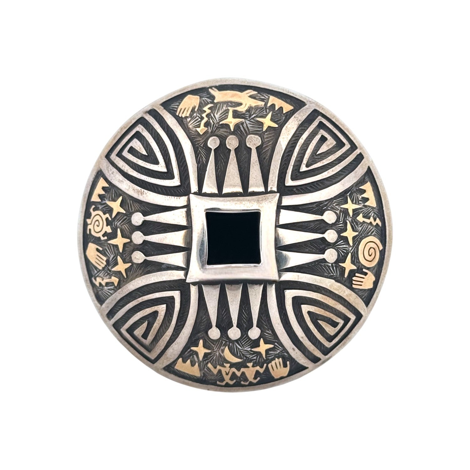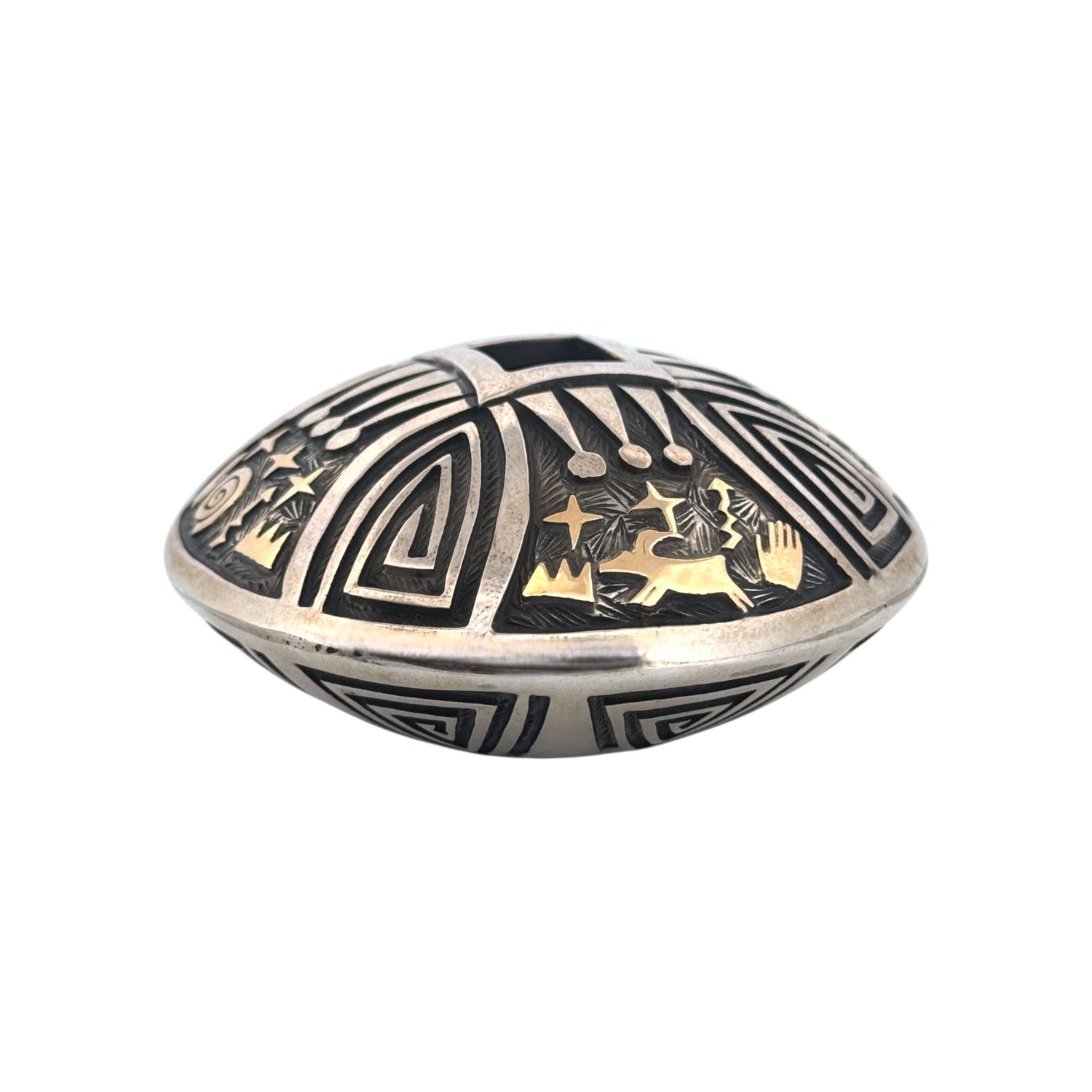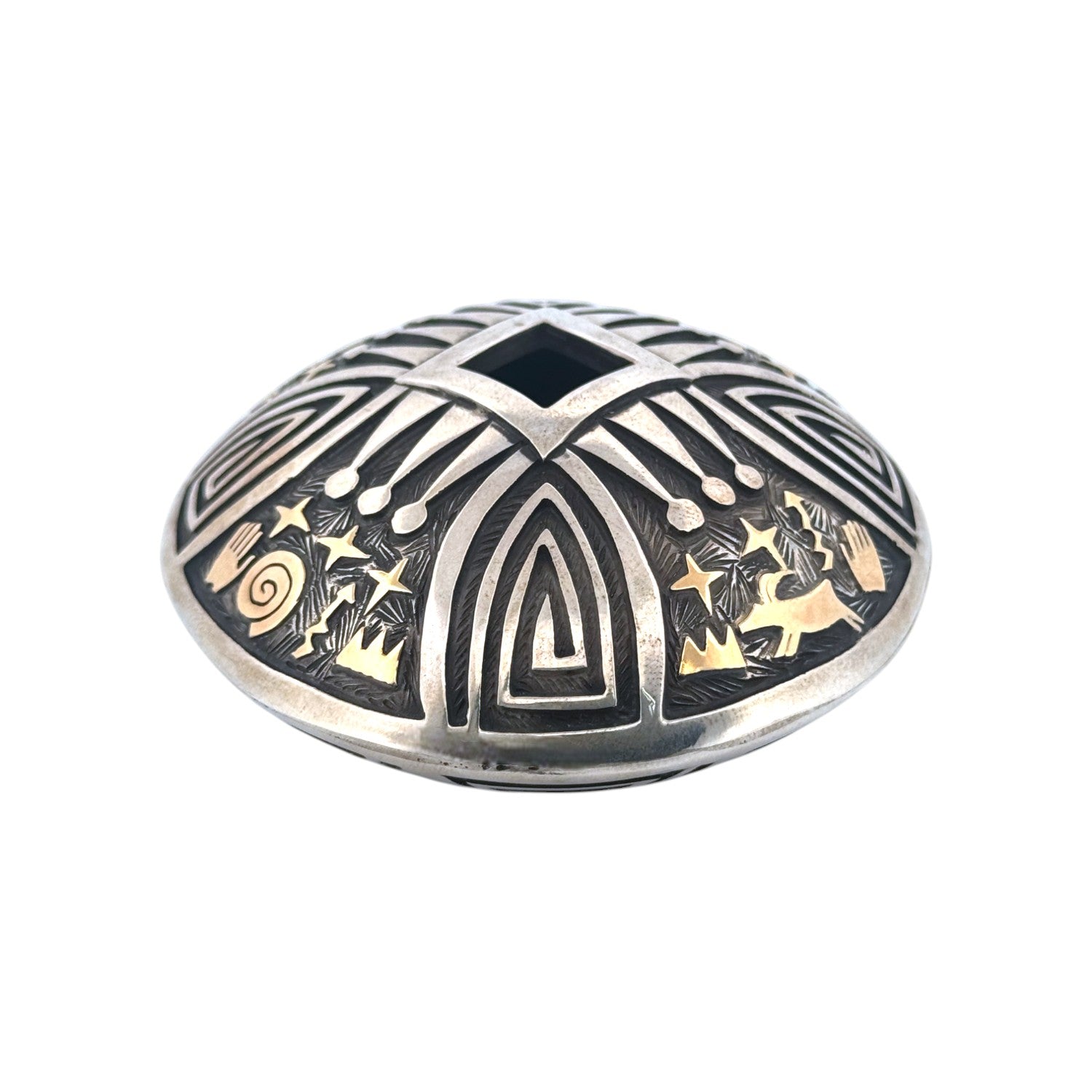 This exceptional Navajo handmade container by Ben Arland is a powerful expression of cultural reverence and elevated craftsmanship. Meticulously crafted from sterling silver and accented with 14k gold overlays, the lid features a radiant design that speaks to sacred geometry and Navajo cosmology. A central square opening draws the eye, surrounded by radiating lines symbolizing spiritual energy, emergence, and direction. Intricate gold imagery—including hands, stars, lightning bolts, spirals, and birds—evokes themes of protection, harmony, and ancestral guidance. Each hand-stamped detail is deeply intentional, bridging contemporary silversmithing with timeless tradition. The overall composition conveys both movement and balance, like a ceremonial shield or sunburst.