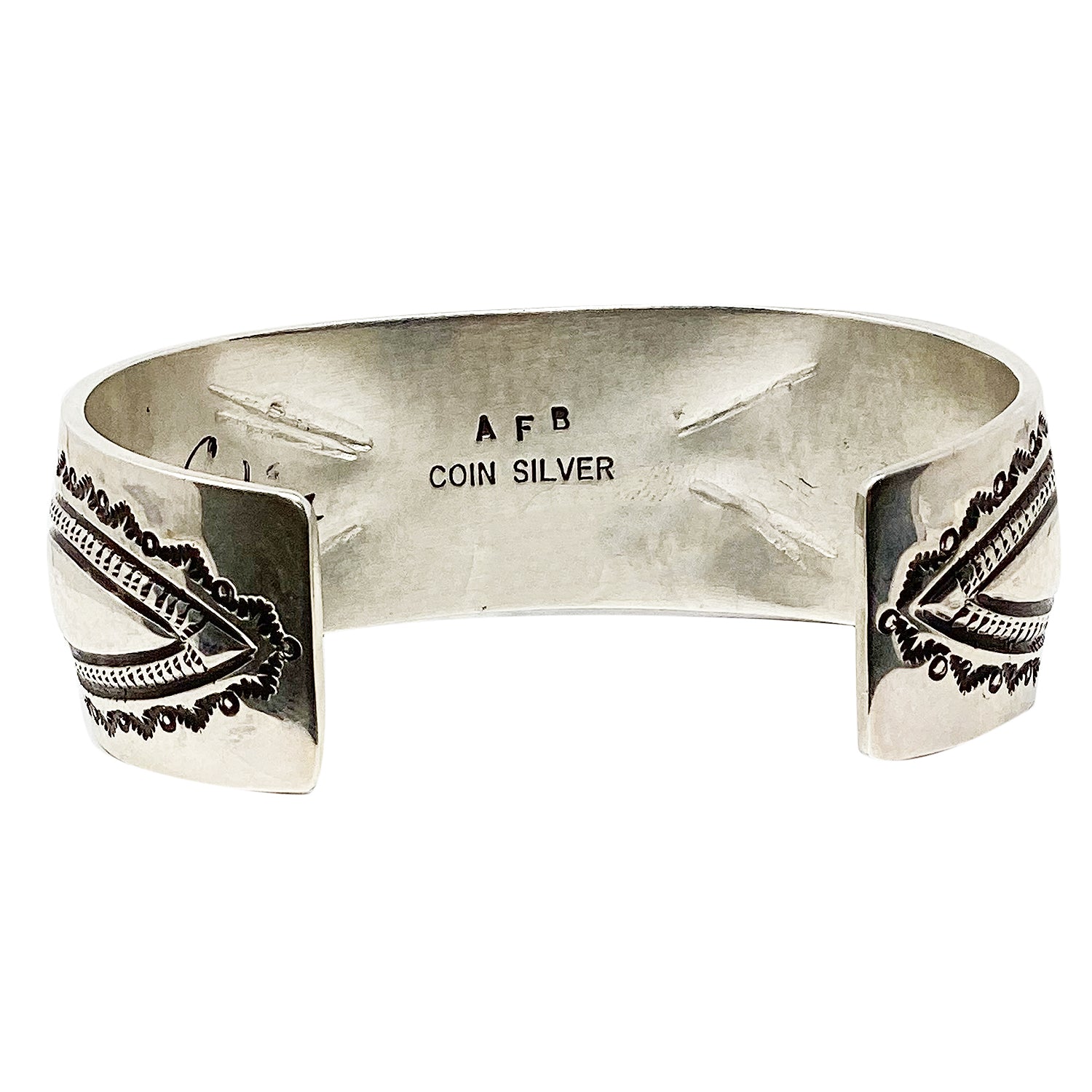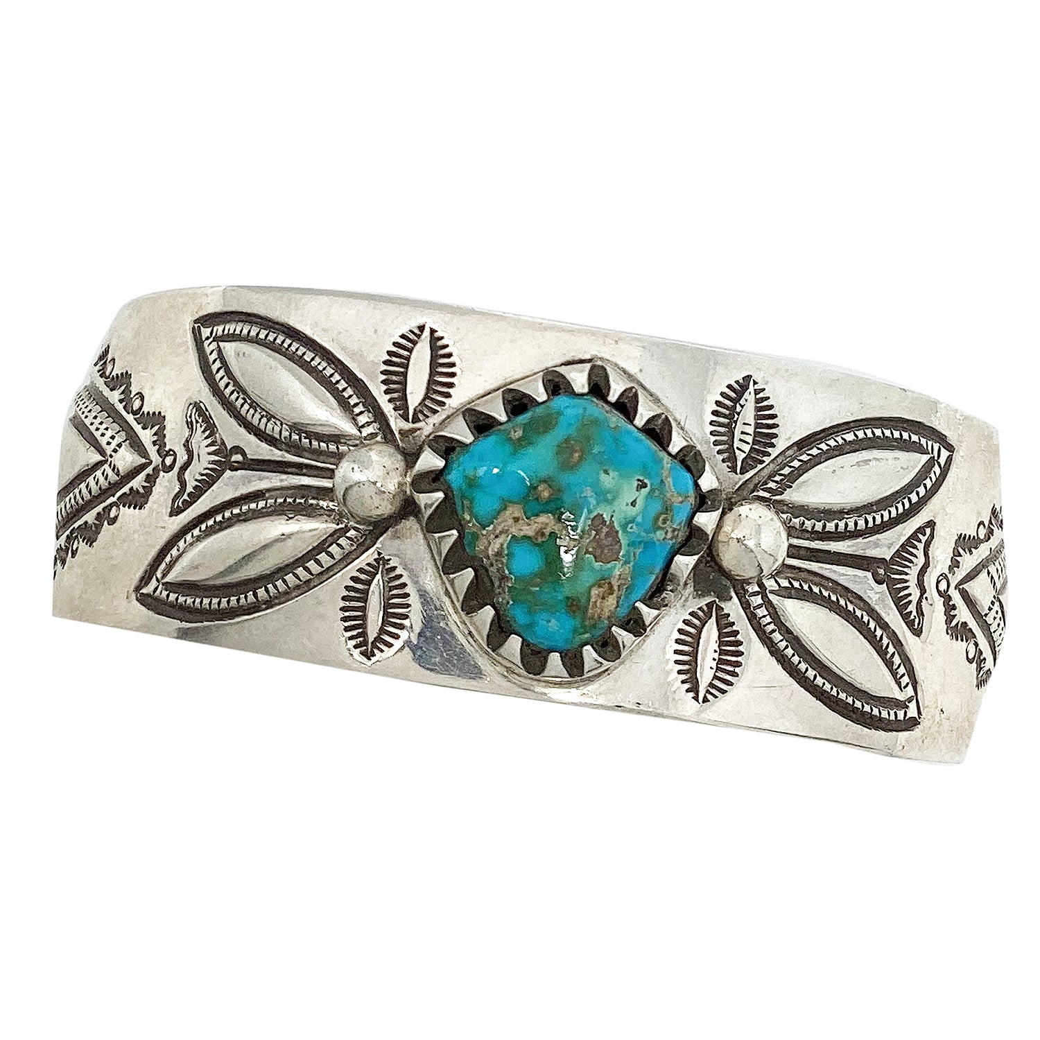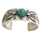 Navajo silversmith Arland Ben can't leave the Trading Post without seeing what new stamps we have since his last visit. He can spend a significant amount of time looking through these essential silversmith tools. I can't imagine how much time he takes planning out his design and which of his hundreds of stamps he will use for the creation. This revival bracelet is made from coin silver and a number of his stamping tools have decided the design. When you turn the bracelet over you will notice that he uses old techniques to give his designs a bump out look. All of this traditional Navajo stamp work surrounds a stunning piece of Stone Cabin Turquoise (Lander County Turquoise). You will find the rock showing off green and blues that looks right at home in the heavy bezel.