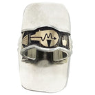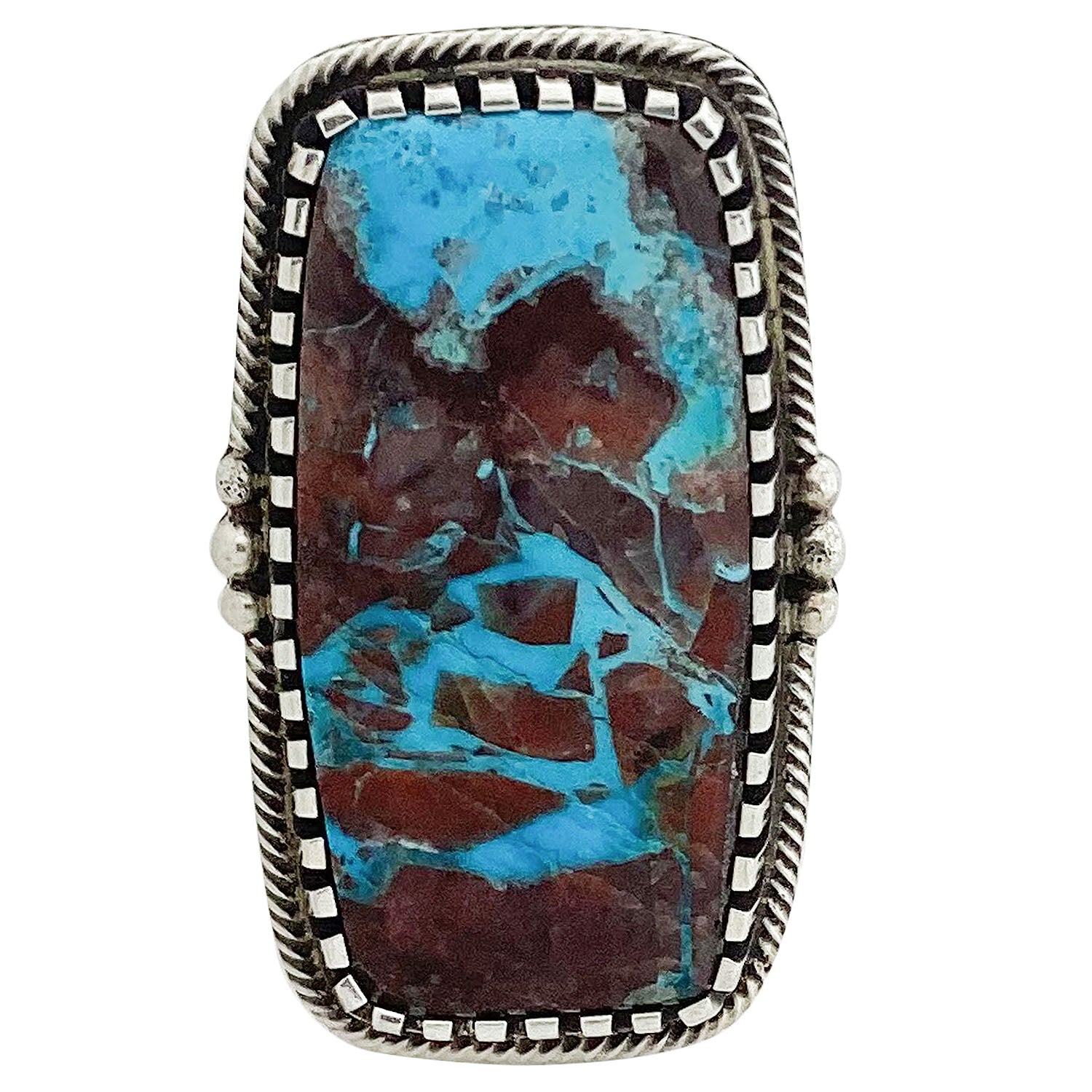Deep in the southern part of Arizona is a legendary mining town, Bisbee. It is a town that has had flavor ever since its beginning in 1880. Native American jewelry collectors have always been fond of the turquoise that comes from this area. Bisbee blue with a thick chocolate matrix is a favorite of many. Navajo artist Arland Ben got his hands on amazing cut of the collectible rock and turned it into finger art. You will find a universe symbol inside a turtle, Thunderbird, bear with a heartline, a hand representing the human race, Navajo Mountain, along with stars, lightning and a moon. Each symbol has been designed from 14k gold and sits on top of stamped textured sterling silver. The ring is a heavy piece that is meant to be worn. This will make an impressive addition to your Native American art collection, always nice to have culture inspired pieces.