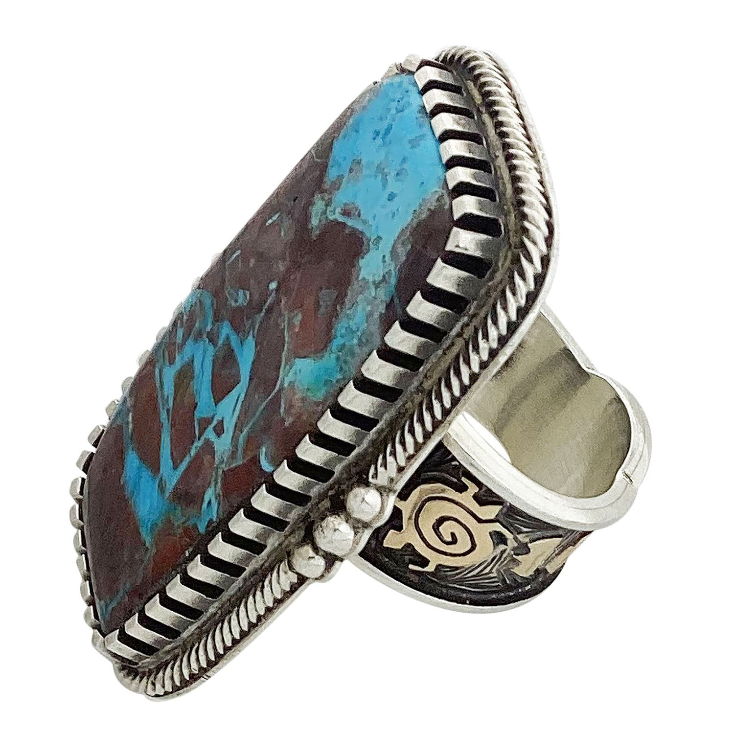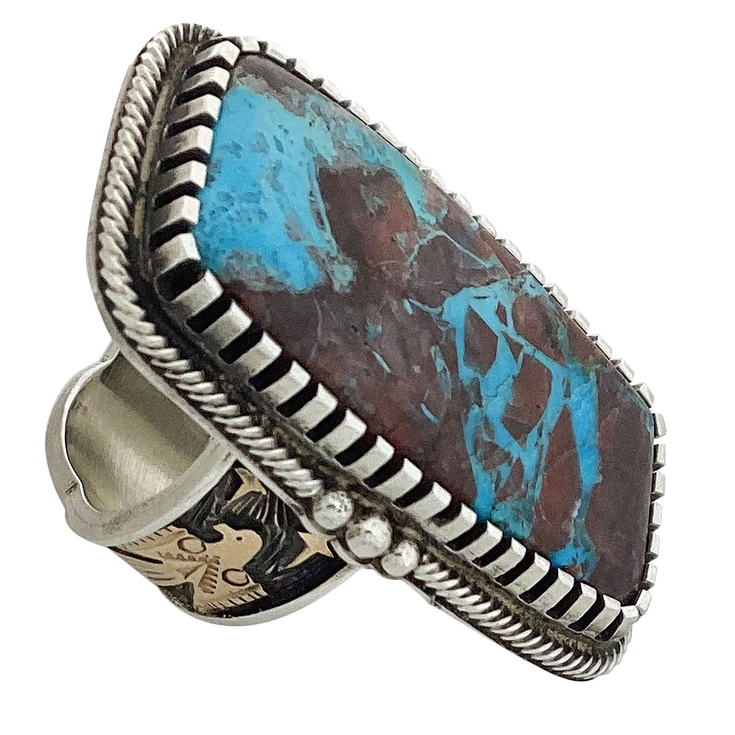 Arland Ben, Ring, 14k Gold, Silver, Bisbee Turquoise, Petroglyph, Navajo, 8 1/2