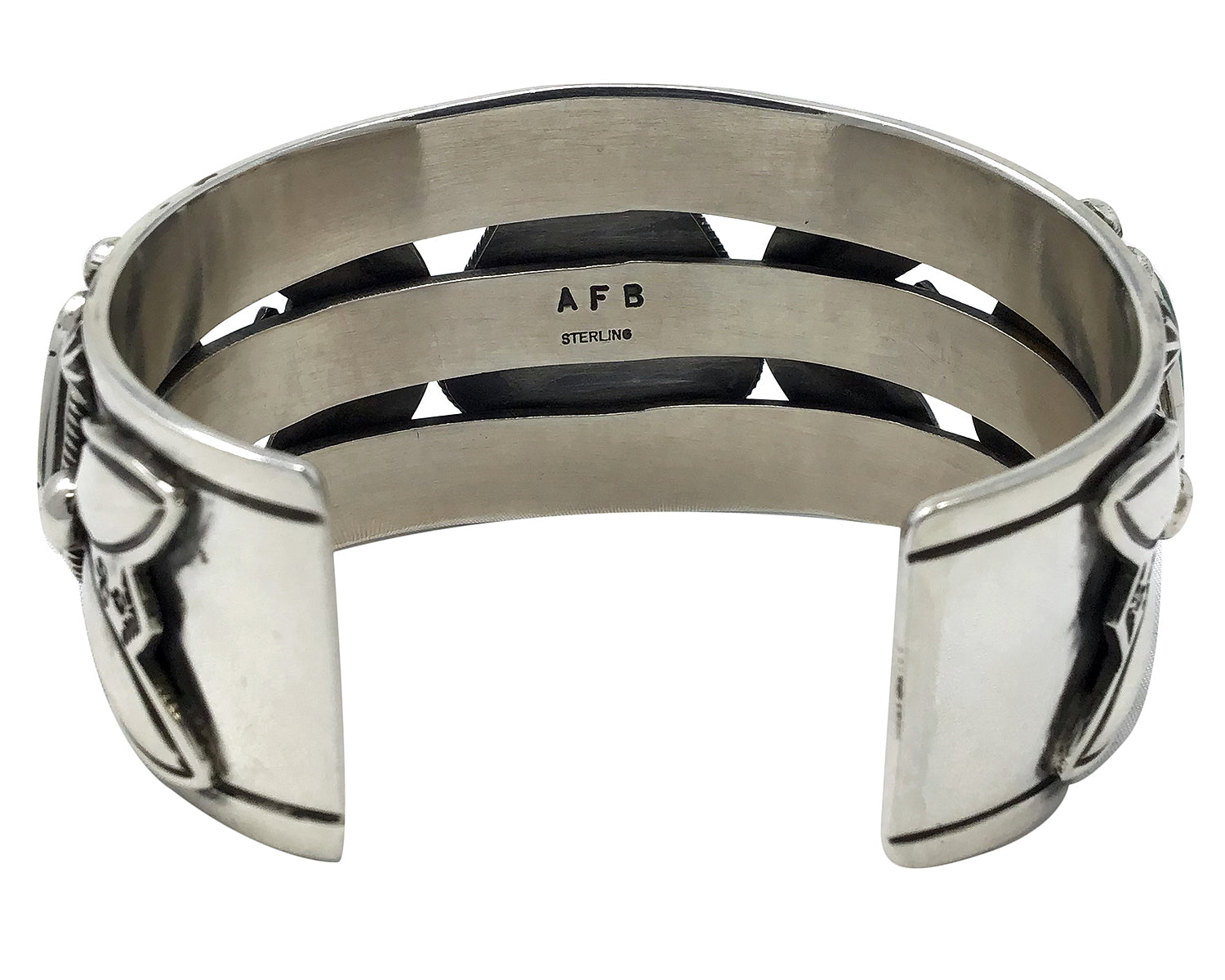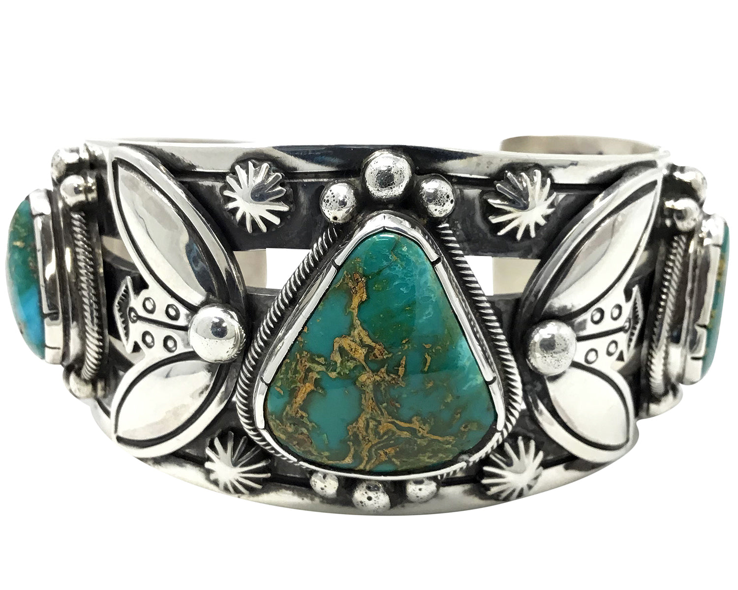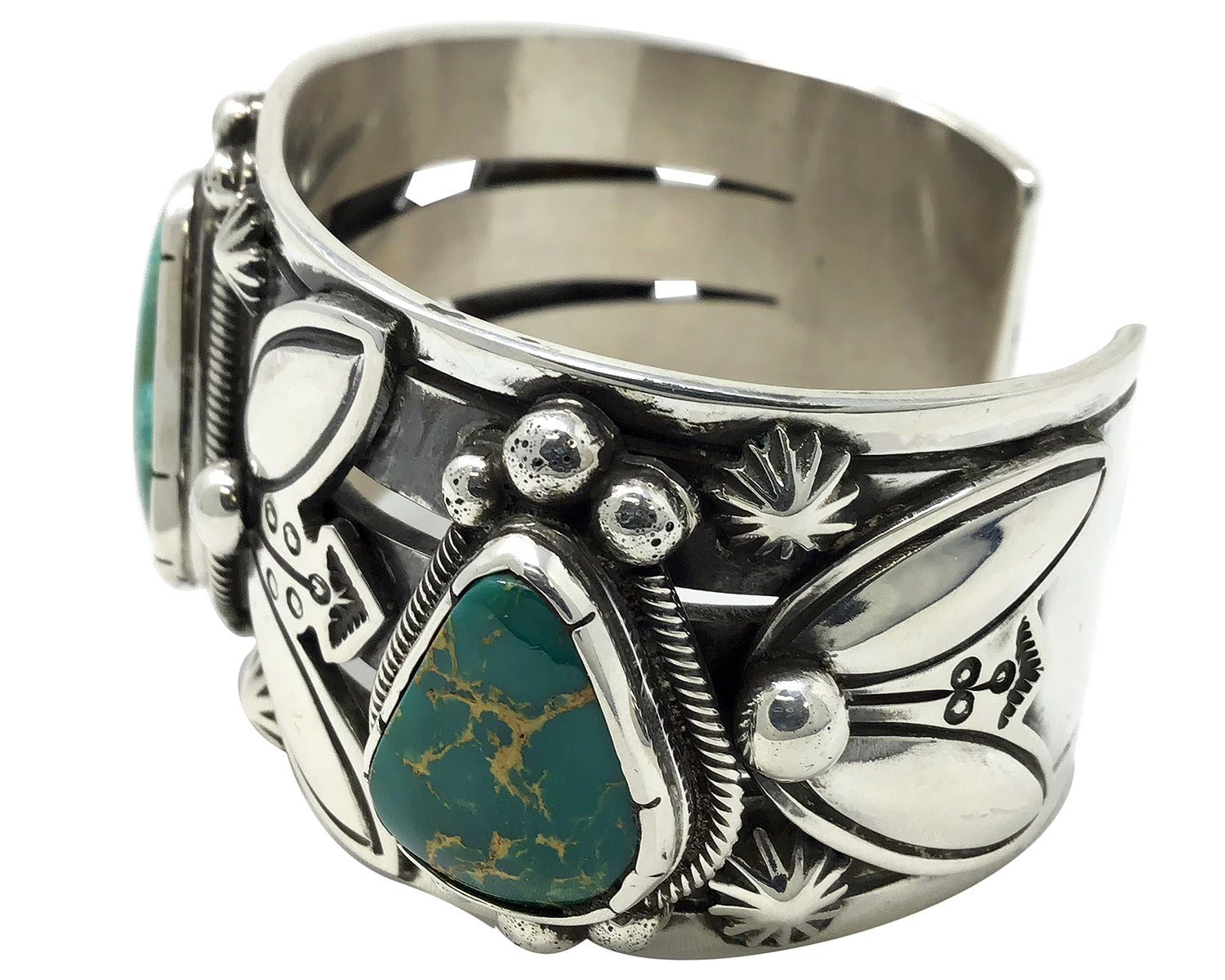 Only a handful of Navajo silversmiths can get this amazing revival look. It is a combination of things that gets this result. First, you have classic pieces of American turquoise with that right cut. These pieces of Stone Cabin Turquoise show off a deep green color with a flowing copper colored matrix. All three Nevada rocks are sitting on a heavy piece of silver, the next important attribute to getting this great look. Third, Arland has stamps that capture the look of the era he is trying to replicate. Last, everything is right where it is supposed to be and the work is clean, no mistakes. Having the skills and then a great eye for design is possessed by the lucky few.
