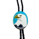 The eagle is our bird, the American mascot. It is a magnificent creature that soars above us, for all to admire. Navajo artist Calvin Desson has created his own magnificent eagle. He has a nice Kingman Turquoise stone in the background, which brings out a majestic combination overall. Calvin is an extremely talented artist who has mastered the manipulation of stone. This bolo tie has a collection of color, turquoise, jet, pristine, and shell. The eagle is not only America's symbol but is often thought of as the symbol of Native Americans. You will find the feathers of this sacred creature used in a number of Native American ceremonies. Calvin finishes the piece with a black braided leather cord and sterling silver tips.