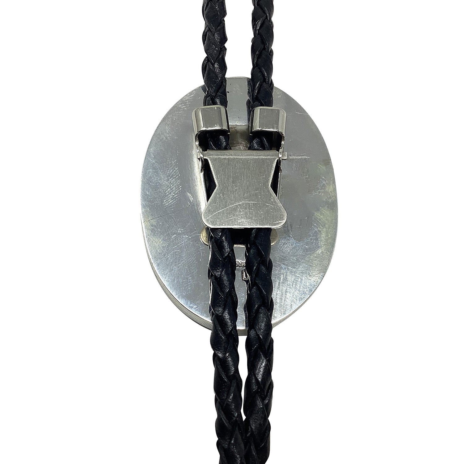Calvin has created a nice bolo tie with two multicolored tipis. He uses a nice Kingman Turquoise stone in the background, which brings out a majestic combination overall. Calvin is an extremely talented artist who has mastered the manipulation of stone. This bolo tie has a collection of color, turquoise, jet, pristine, jasper and lapis. You will find that tipis are sacred and used in a number of Native American ceremonies. Calvin finishes the piece with a black braided leather cord and sterling silver tips.