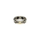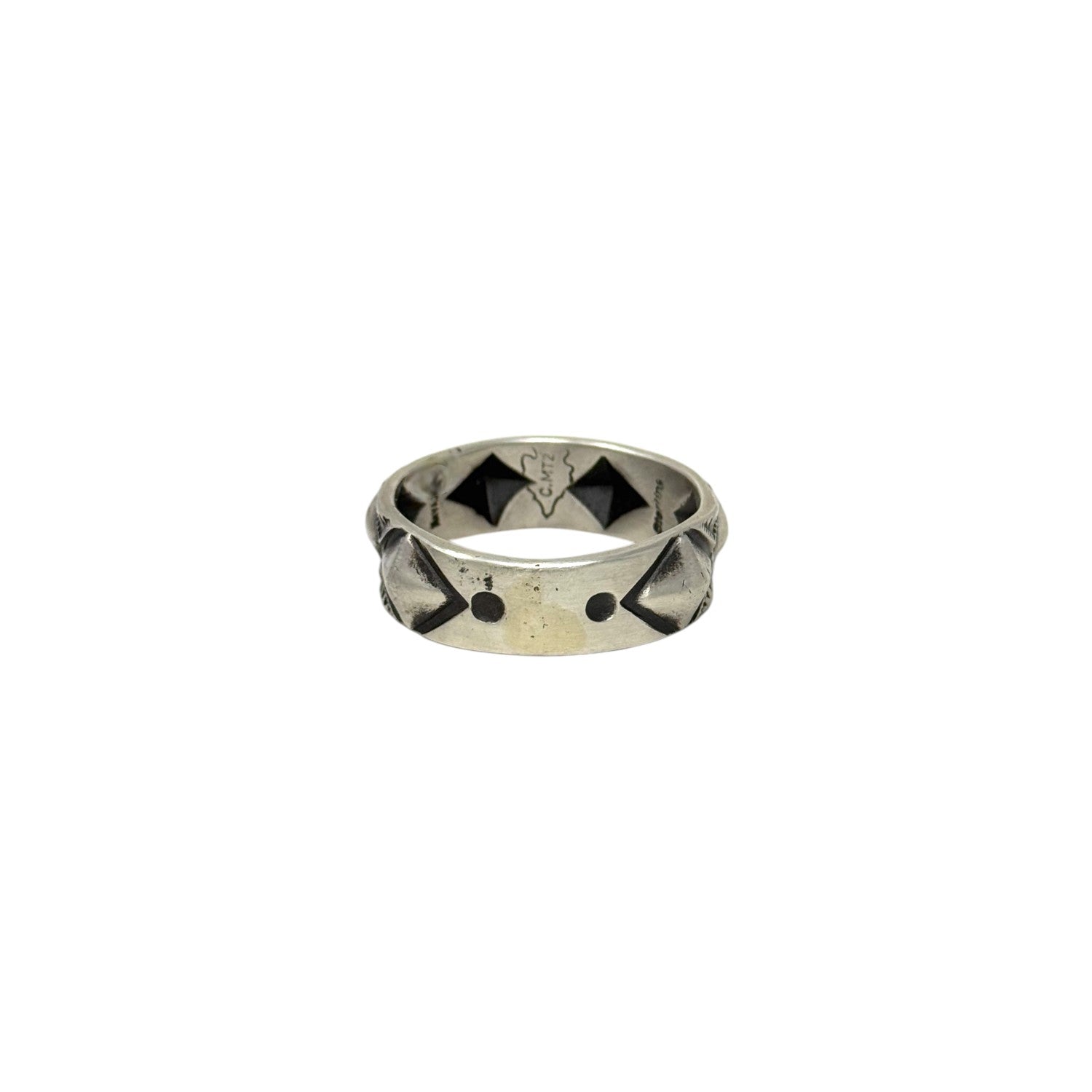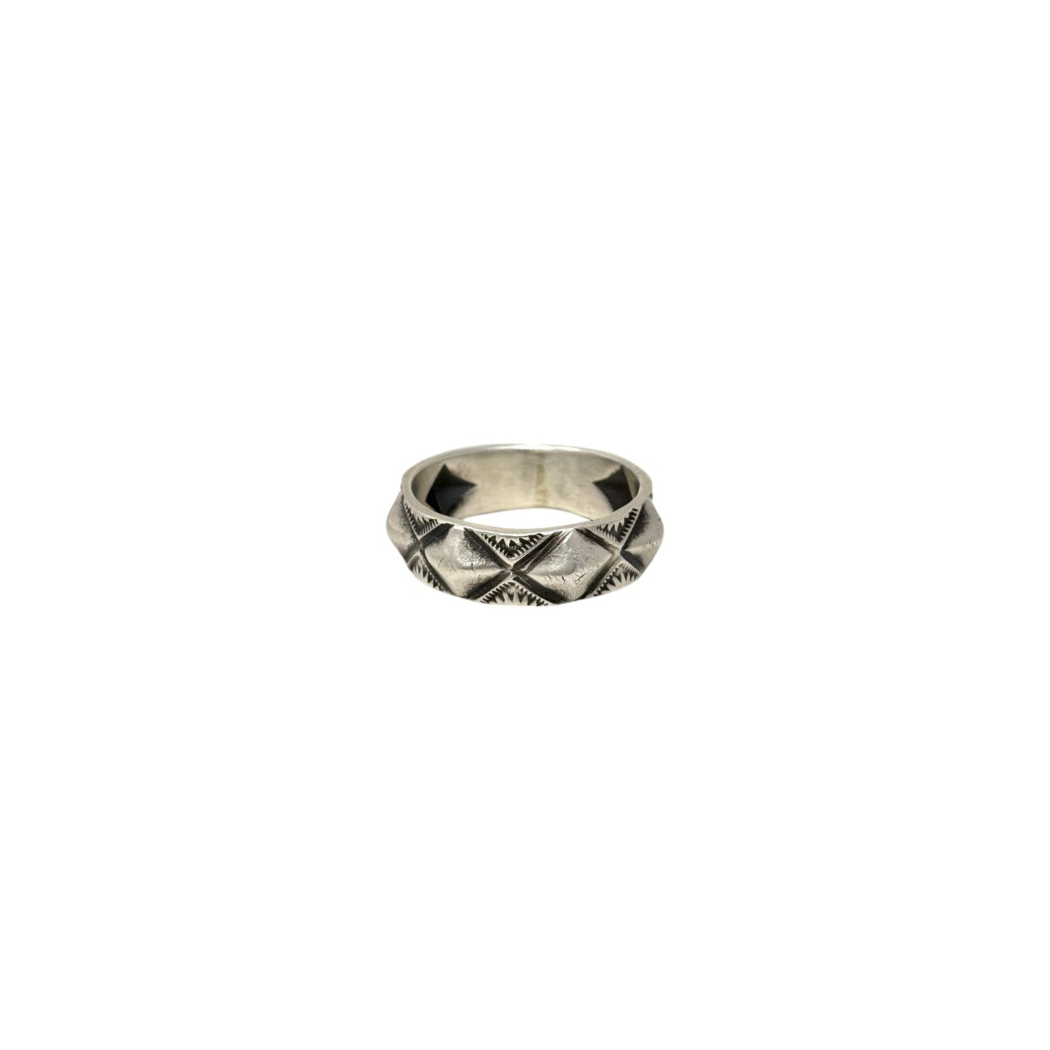 This bold and timeless ring by master Navajo silversmith Calvin Martinez showcases his signature artistry in sterling silver. The band features a striking geometric diamond pattern, deeply stamped and oxidized to highlight the intricate texture and dimension. Each raised segment reflects light with a subtle brilliance, adding visual depth to the design. Martinez’s expert craftsmanship is evident in the precision of the stamp work and the perfectly balanced proportions of the band. Comfortable for everyday wear, this ring carries a weighty presence without sacrificing ease.