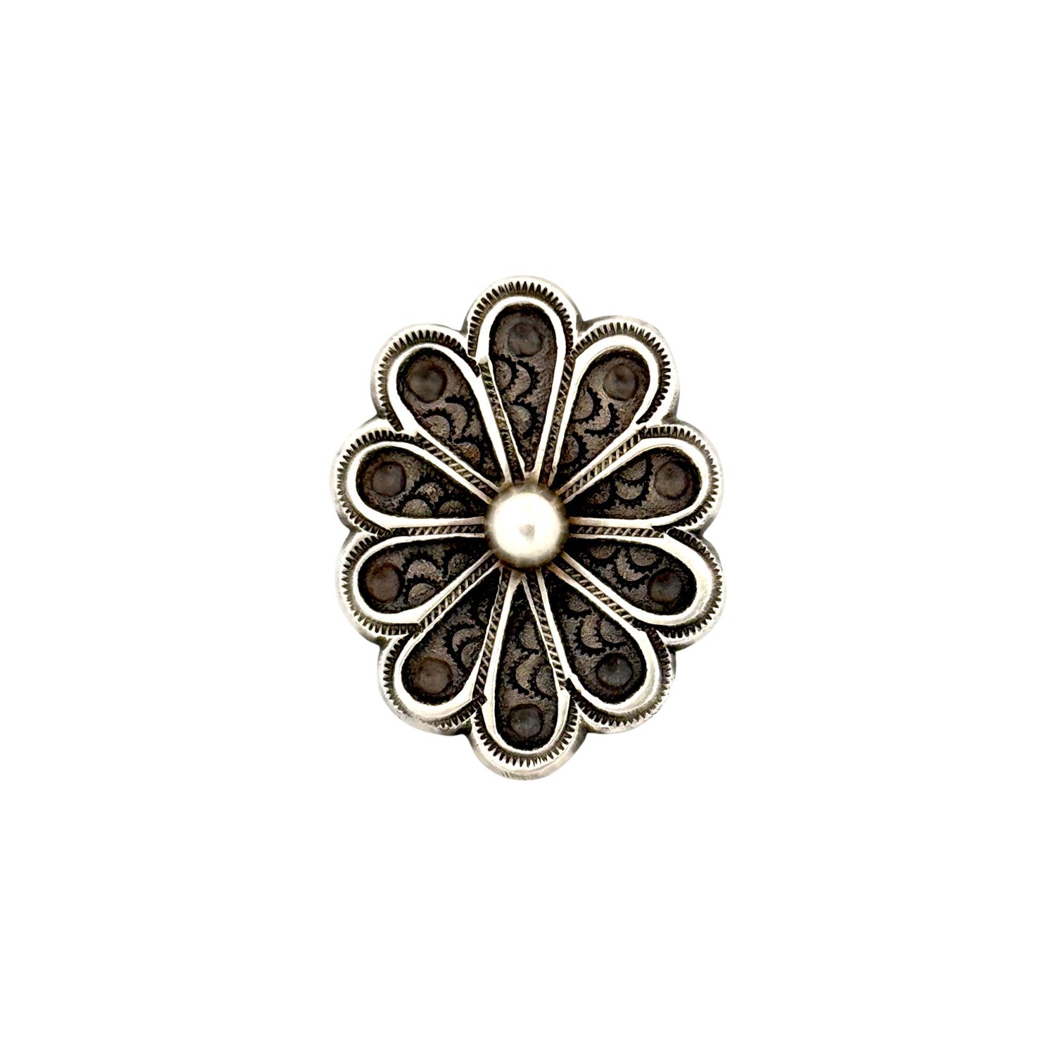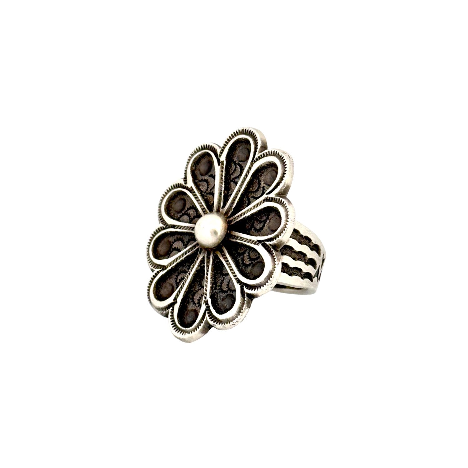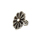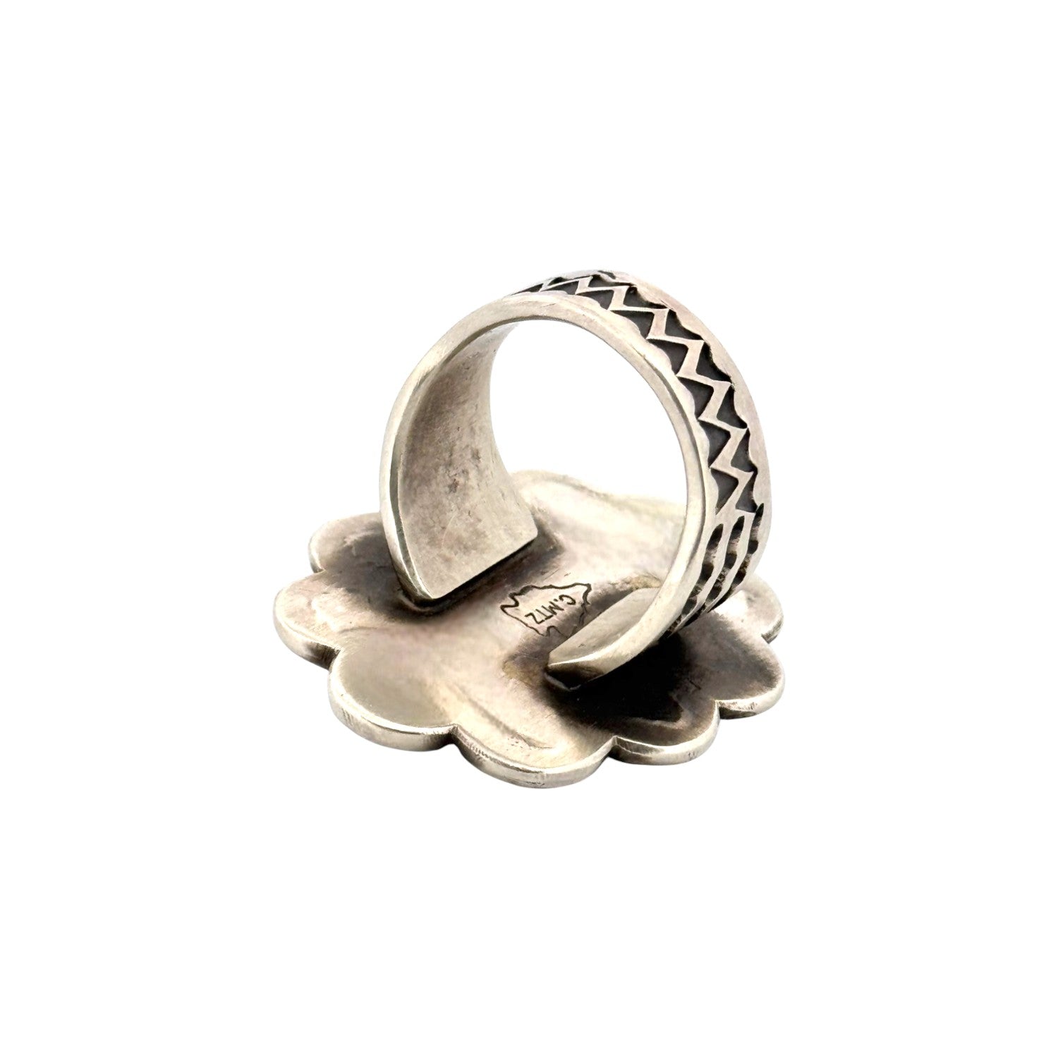 This impressive ring is a Navajo handmade creation by master silversmith Calvin Martinez. Crafted from sterling silver, it features a bold floral design with radiating petal-like segments surrounding a central domed bead. Each petal is accented with intricate hand-stamped patterns, showcasing traditional Navajo artistry and Martinez’s attention to fine detail. The oxidized background enhances the depth of the stamping, creating a striking contrast against the high-polish silver edges. Its wide, elongated shape makes it a commanding statement piece while still maintaining elegance and balance. Martinez is well known for his mastery of traditional techniques, and this ring reflects his ability to combine strength and refinement in one design.