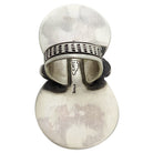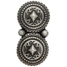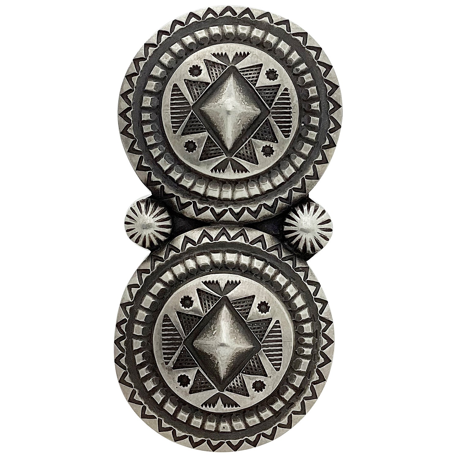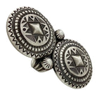 Navajo silversmith Calvin Martinez made this unique style ring, something that shows off his revival style perfectly. He takes two old style Navajo buttons to make the wide ring, creating a unique look. You will find the two buttons filled with lots of interesting stamp design. Styled silver drops separate the two buttons and create a nice transition. Calvin uses a stamped ring band that is decorated with more of his legendary stamp design. Silver goes with everything giving you a reason to wear this one all the time. A rustic brushed finish completes the ring, add this Martinez treasure to your collection.