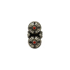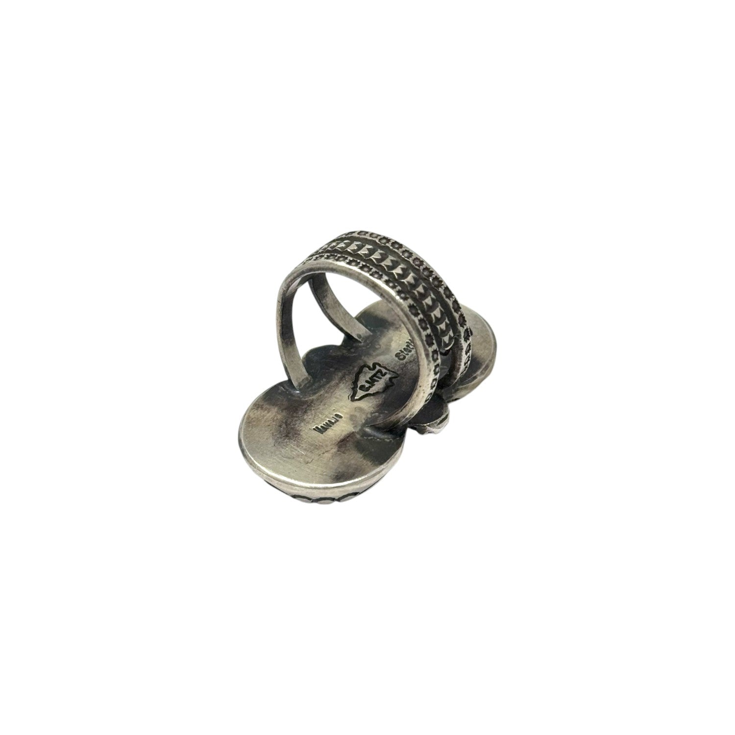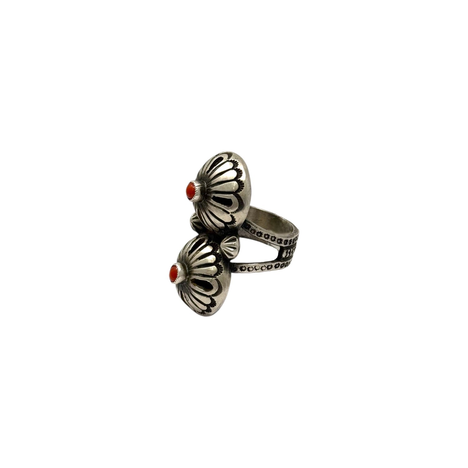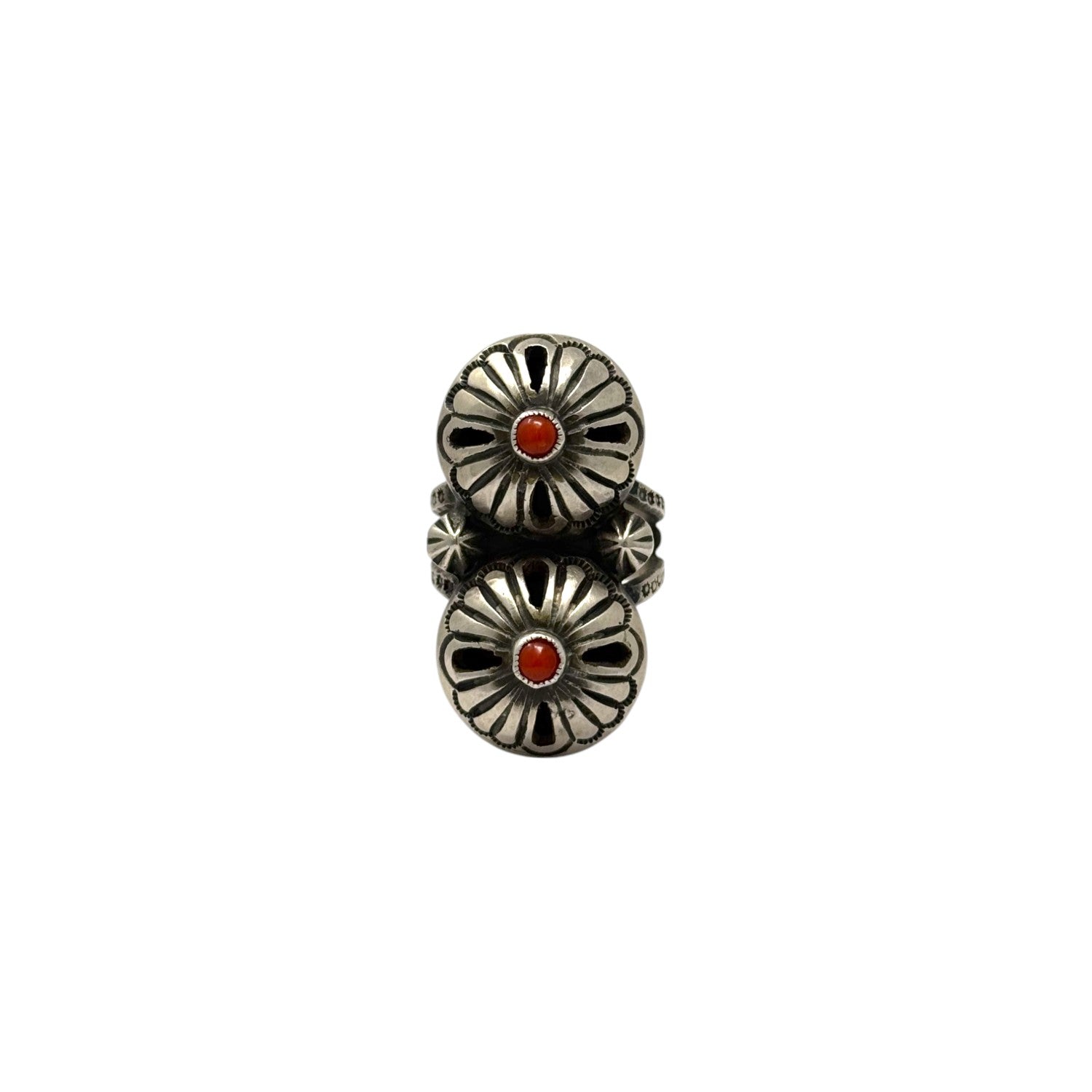 This bold, Navajo handmade ring by Calvin Martinez showcases the masterful stamp work and eye for design that defines his signature style. Crafted from sterling silver, the ring features two domed concho style medallions, each centered with a vivid red coral cabochon. The hand stamped sunburst patterns radiate outward, drawing the eye to the fiery coral stones that symbolize protection and vitality in Native tradition. The split shank band is also adorned with detailed stamp work, offering added dimension and craftsmanship. Martinez’s hallmark attention to symmetry and depth makes this piece as sculptural as it is wearable.
