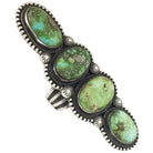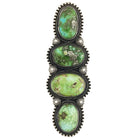 Nothing says Navajo jewelry better than size. Most places you visit the jewelry is subtle, and you find narrow bracelets, small rope chain necklaces, and small band rings. That is not how they do it Navajo Country, the jewelry here is big and meant to be seen. Navajo silversmith Calvin Martinez continues that tradition with this long four stone ring. He uses a collection of Sonoran Gold Turquoise stones that sit in a stunning silver Navajo revival setting. You will find the impressive rocks surrounded by bead wire, twisted wire, and hammered drops frame the four beautiful stones. The ring finishes with a comfortable wearing stamped ring band and an antique brushed look.
