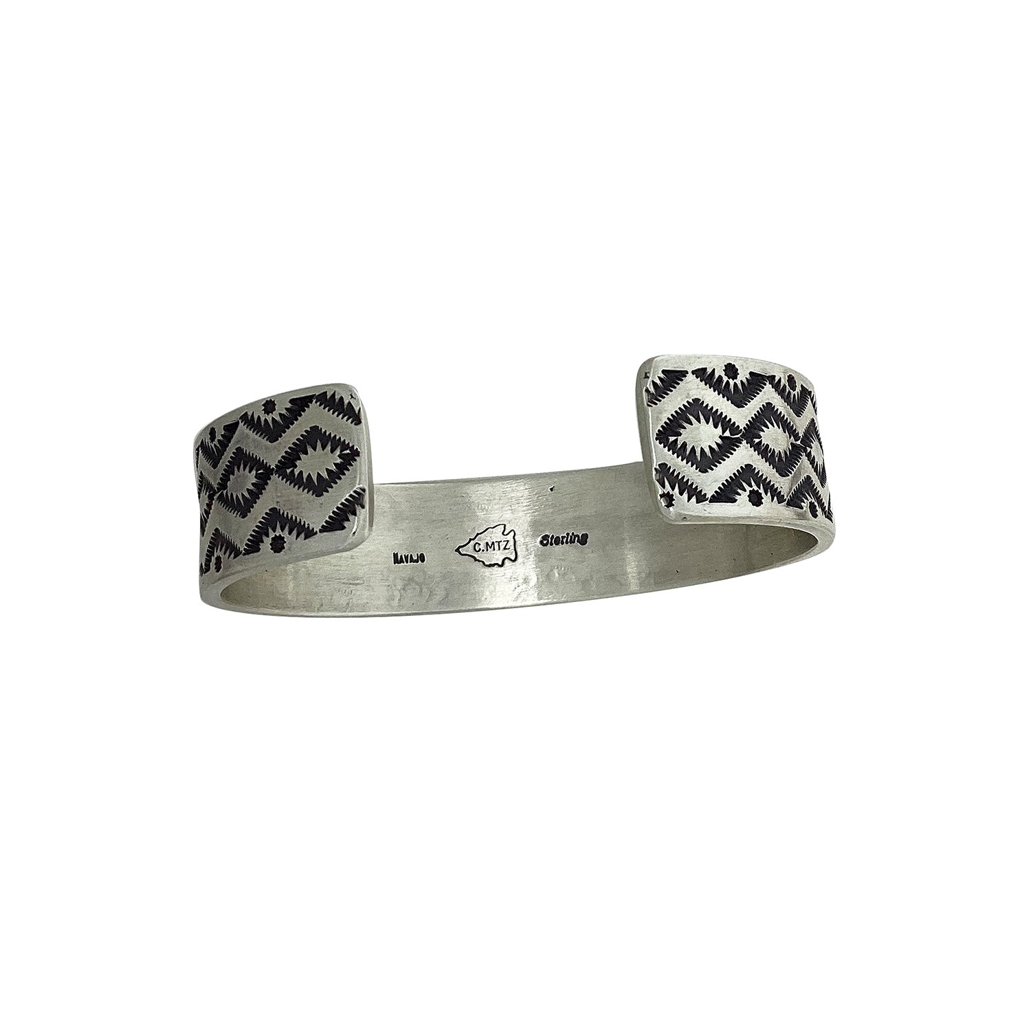 Navajo silversmith Calvin Martinez creates his silver in a workshop that he has been perfecting for decades. He has accumulated a collection of unique tools and stamps that give his work that one-of-a-kind look. Calvin is an old school metalsmith that works in the traditional ways. Early silversmiths didn't have the luxury of silver plates, and that is why Calvin continues to melt silver scrap into shapes that he can hammer into bracelets. This bracelet is one of his incredible creations that is narrow and allows you to wear them stacked with your other favorites. We have put a selection of these cuffs up on the online trading post. Each is finished with its own original stamp design. A great lifestyle piece to show your appreciation of traditional handmade.