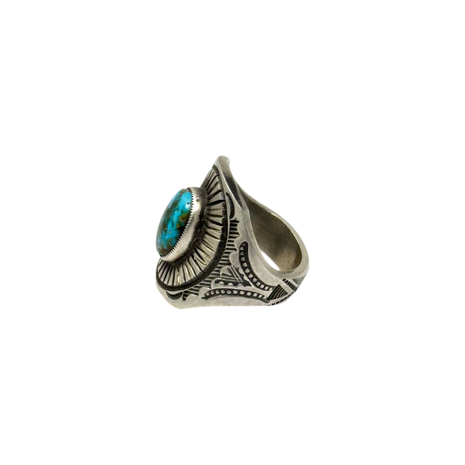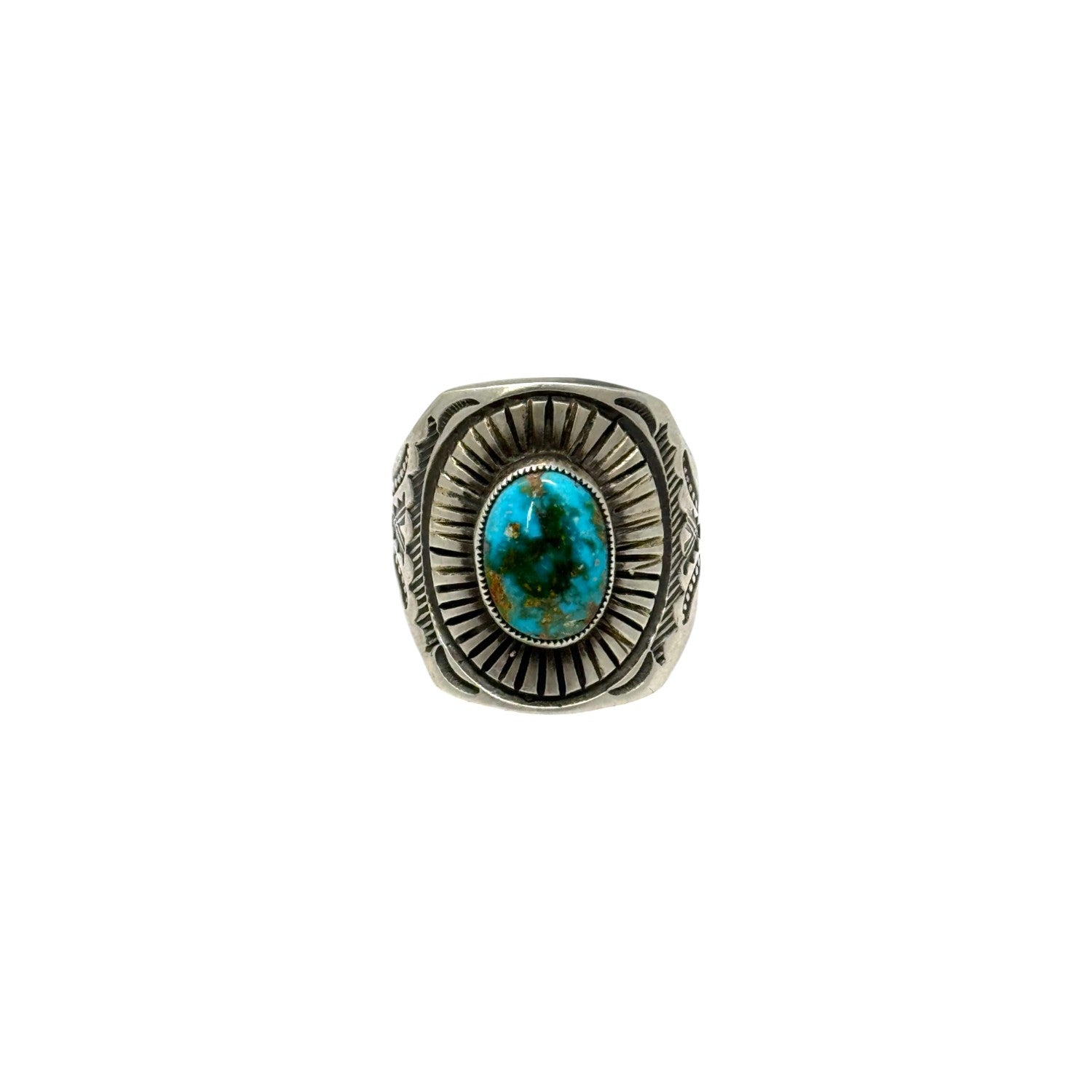 This bold and refined ring by master silversmith Calvin Martinez is a celebration of classic Navajo craftsmanship and natural beauty. Set at the center is a captivating Sonoran Gold turquoise stone, renowned for its vivid blend of golden green and robin’s egg blue with rich brown matrixing. The oval cabochon is framed by a radiating stamped sunburst design that draws the eye inward, amplifying the brilliance of the turquoise. Crafted entirely from sterling silver, the ring showcases deep stampwork along the band, each mark a testament to Martinez’s precision and artistry. The substantial weight and clean symmetry of the piece give it a confident, timeless presence.