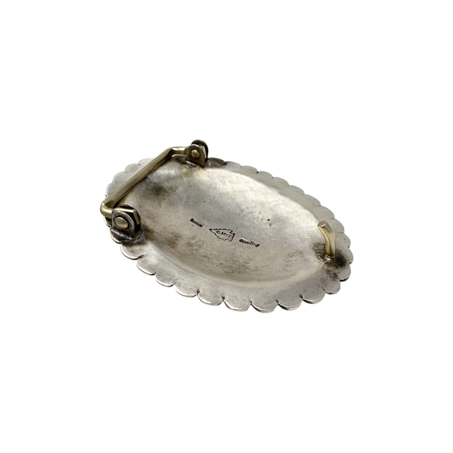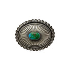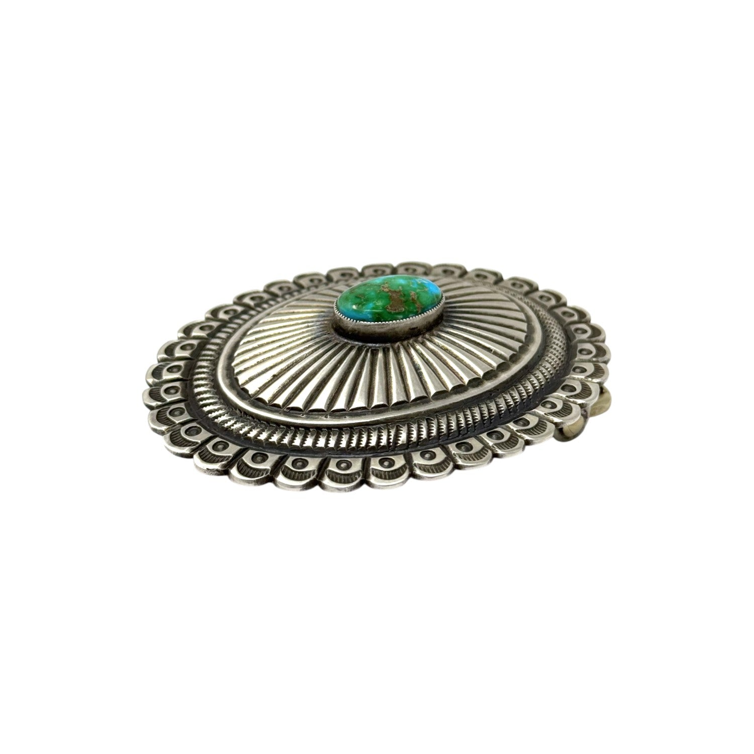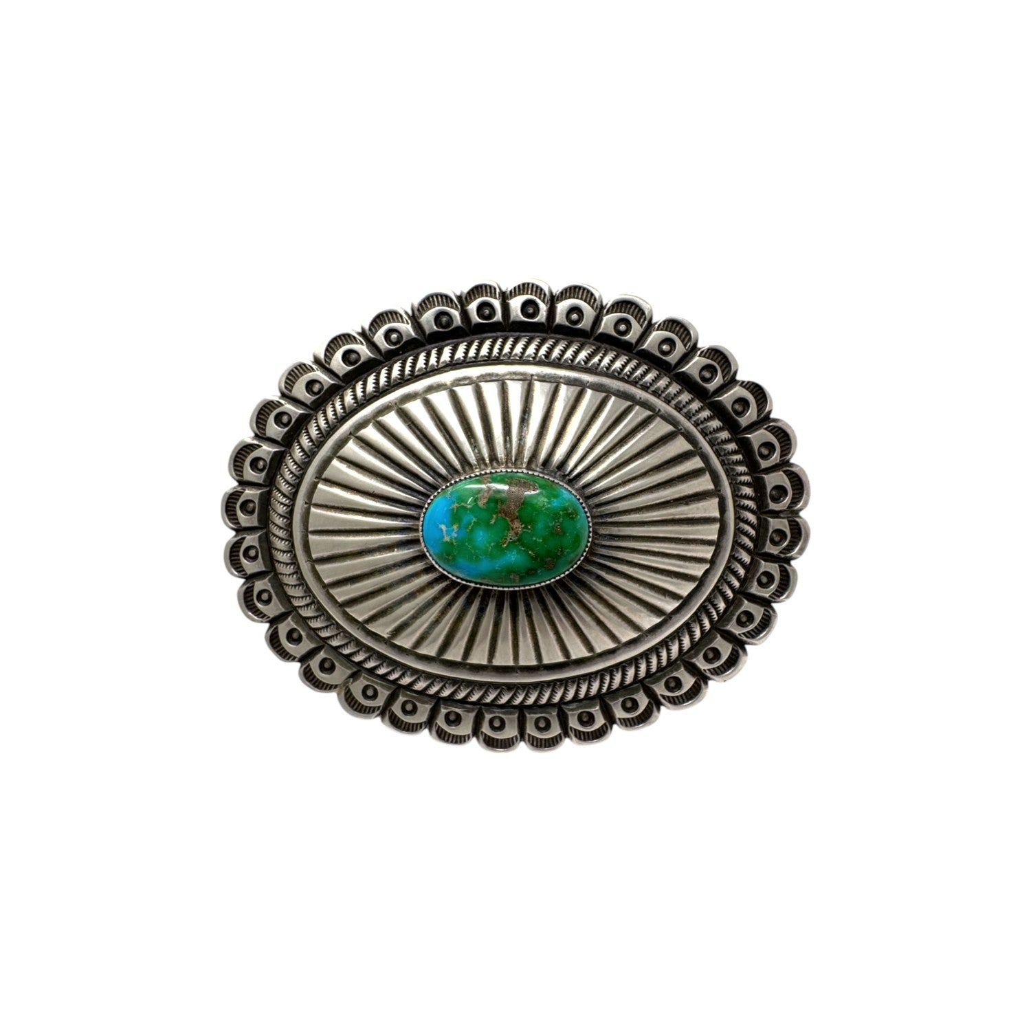 This stunning buckle by Navajo silversmith Calvin Martinez showcases the brilliance of Sonoran Gold Turquoise, set against meticulously hand-stamped sterling silver. Radiating lines flow outward from the vibrant green and gold-flecked cabochon, drawing the eye to its natural beauty and depth. The bold, scalloped edge is adorned with traditional Navajo stamp work, giving the piece a sense of movement and ceremonial grandeur. Calvin Martinez is celebrated for his masterful use of symmetry and antique revival techniques, and this buckle reflects that legacy with elegance and strength. The oxidized finish enhances each stamped detail, creating a striking contrast that highlights the depth of the design.