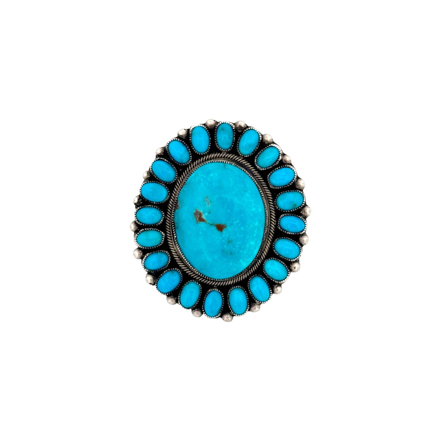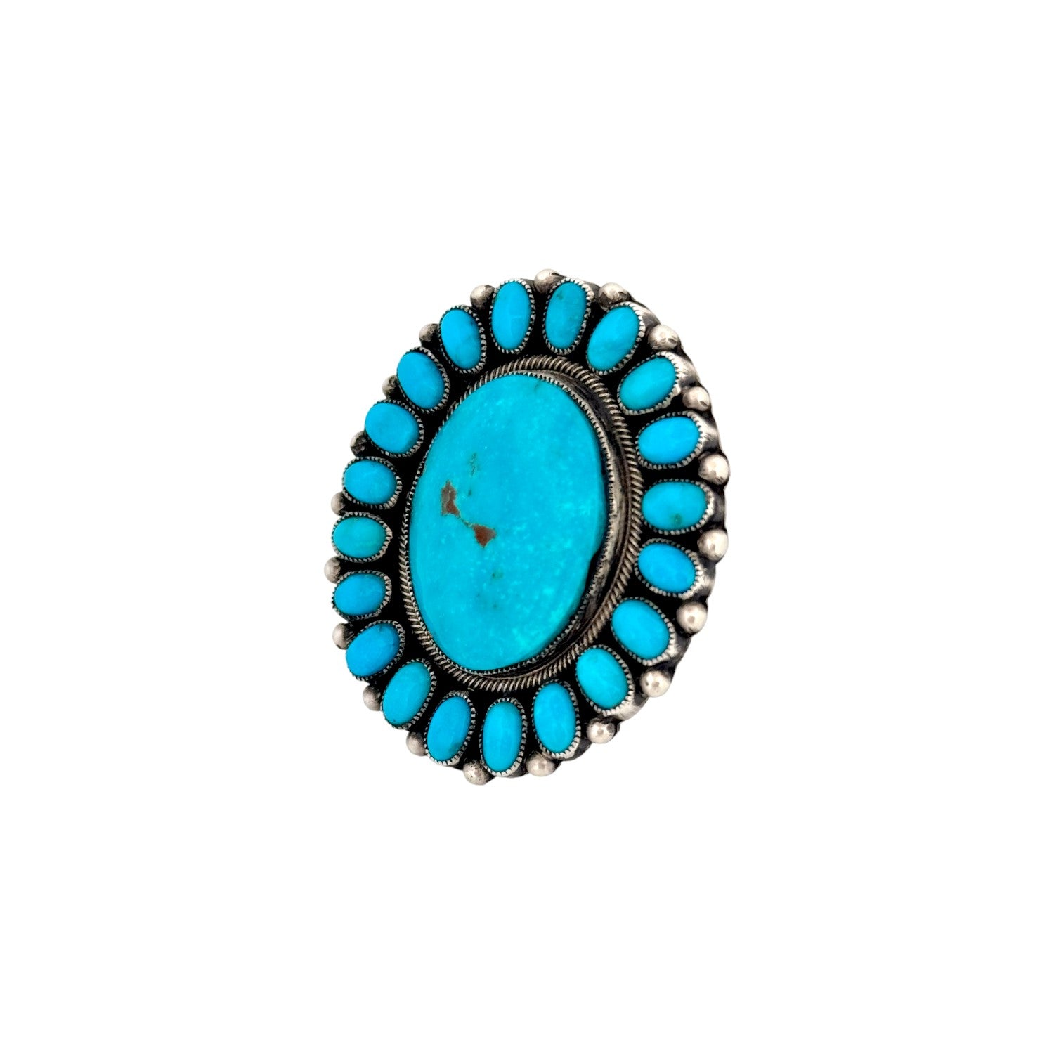 This impressive Navajo handmade ring by Calvin Martinez features a large, vibrant Fox Turquoise stone set in sterling silver. Surrounding the center stone is a beautifully arranged cluster of matching turquoise cabochons, creating a classic and bold Navajo silhouette. Detailed silver rope edging and traditional stamping enhance the design with depth and texture. The rich blue-green tones of the Fox Turquoise offer a striking contrast against the oxidized silver, showcasing Martinez’s signature craftsmanship. A standout collector’s piece, this ring exemplifies the timeless artistry and refined skill of Calvin Martinez.