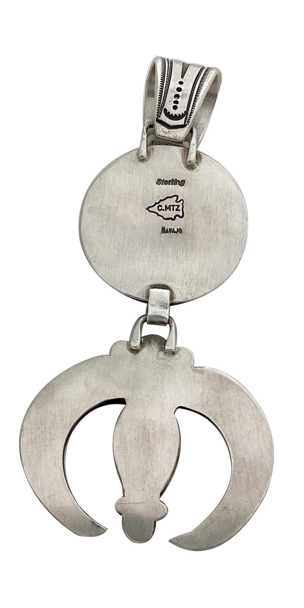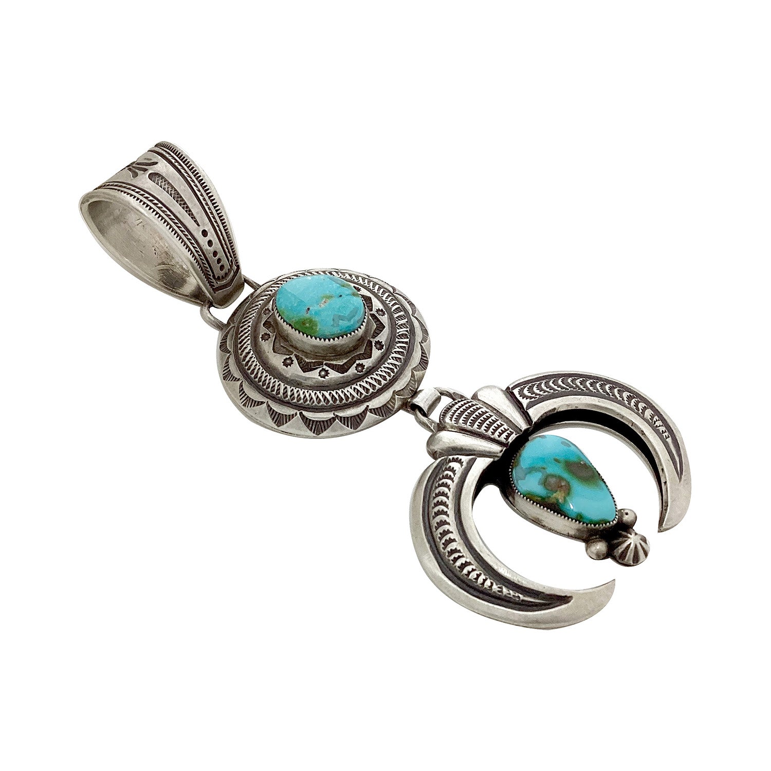 Perfection is a hard thing to find. That is why it is always nice to find some handmade art by Navajo silversmith Calvin Martinez. This amazing creation has two stunning pieces of Sonoran Gold Turquoise hanging from the center of both pieces. Calvin has surrounded the beautiful stone with lots of silver design. The rocks sit perfectly in the center of a classic naja and circular style pendant. Calvin makes his pendants with a good size bale that allows you to hang this from leather for a true Southwest style. If you have been looking for something you can wear daily to show your appreciation of Native American wearable art, well this might be it.