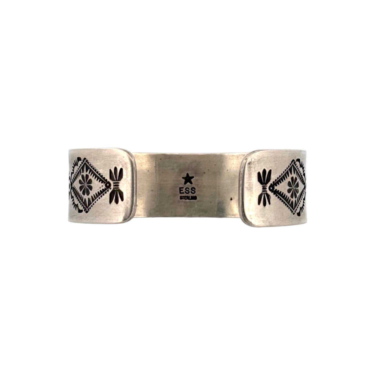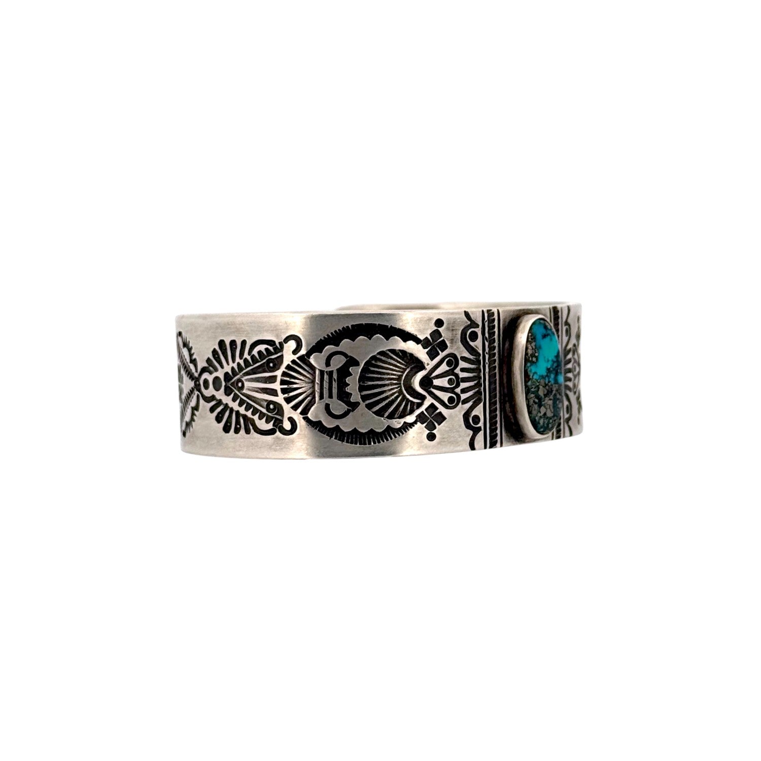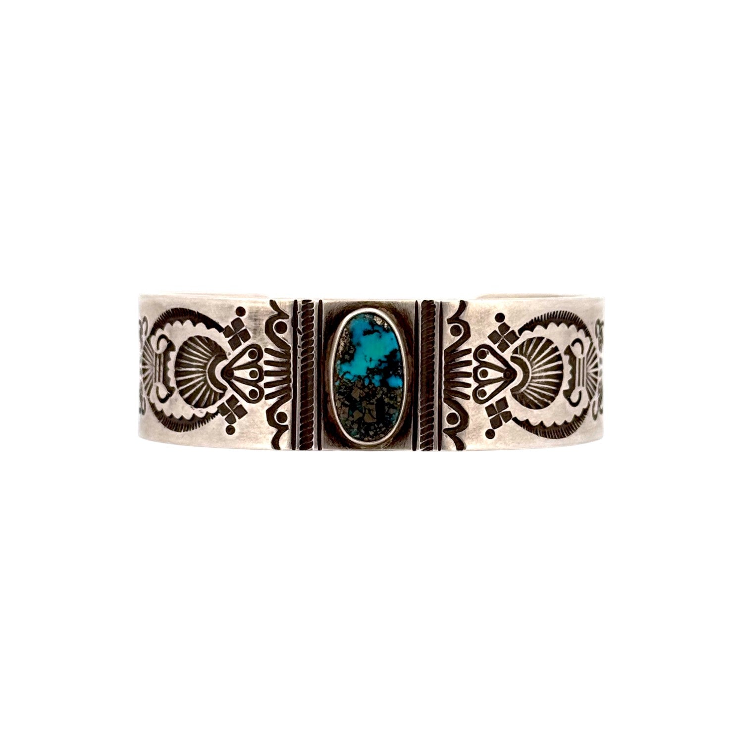 This distinguished bracelet is a Navajo handmade piece by master silversmith Edison Sandy Smith. Crafted from sterling silver, it features bold, traditional stamp work that reflects the artist’s mastery of classic Navajo design. At the center rests a striking oval of Persian Turquoise, known for its rich blue color and intricate matrix that adds depth and character. Flanking the stone are finely detailed stampings, including symmetrical patterns that evoke harmony and balance. The oxidized background enhances the precision of the silverwork, bringing out the beauty of each carefully executed design. With its wide band and strong presence, this cuff carries both elegance and strength, hallmarks of Smith’s craftsmanship.