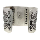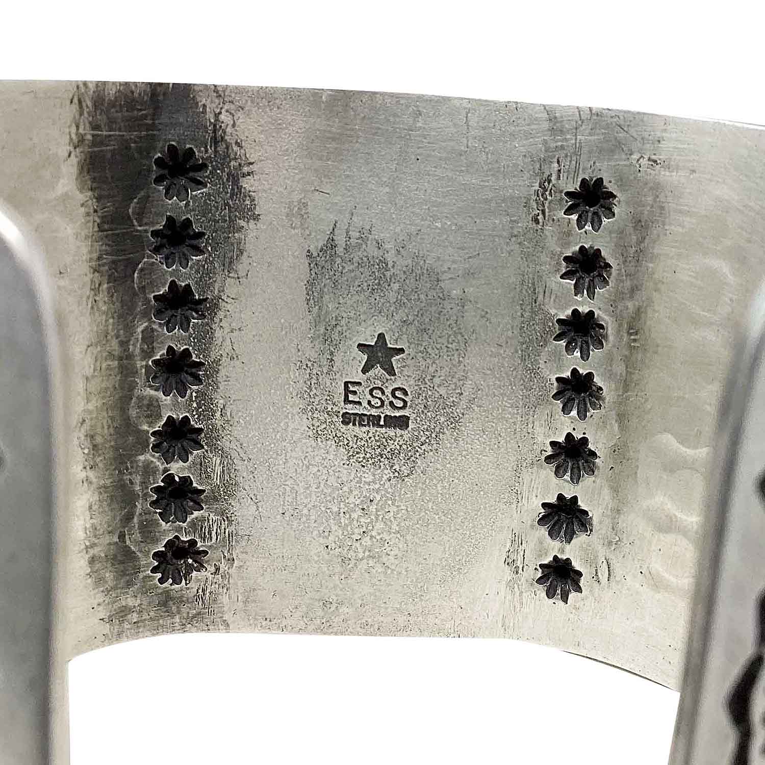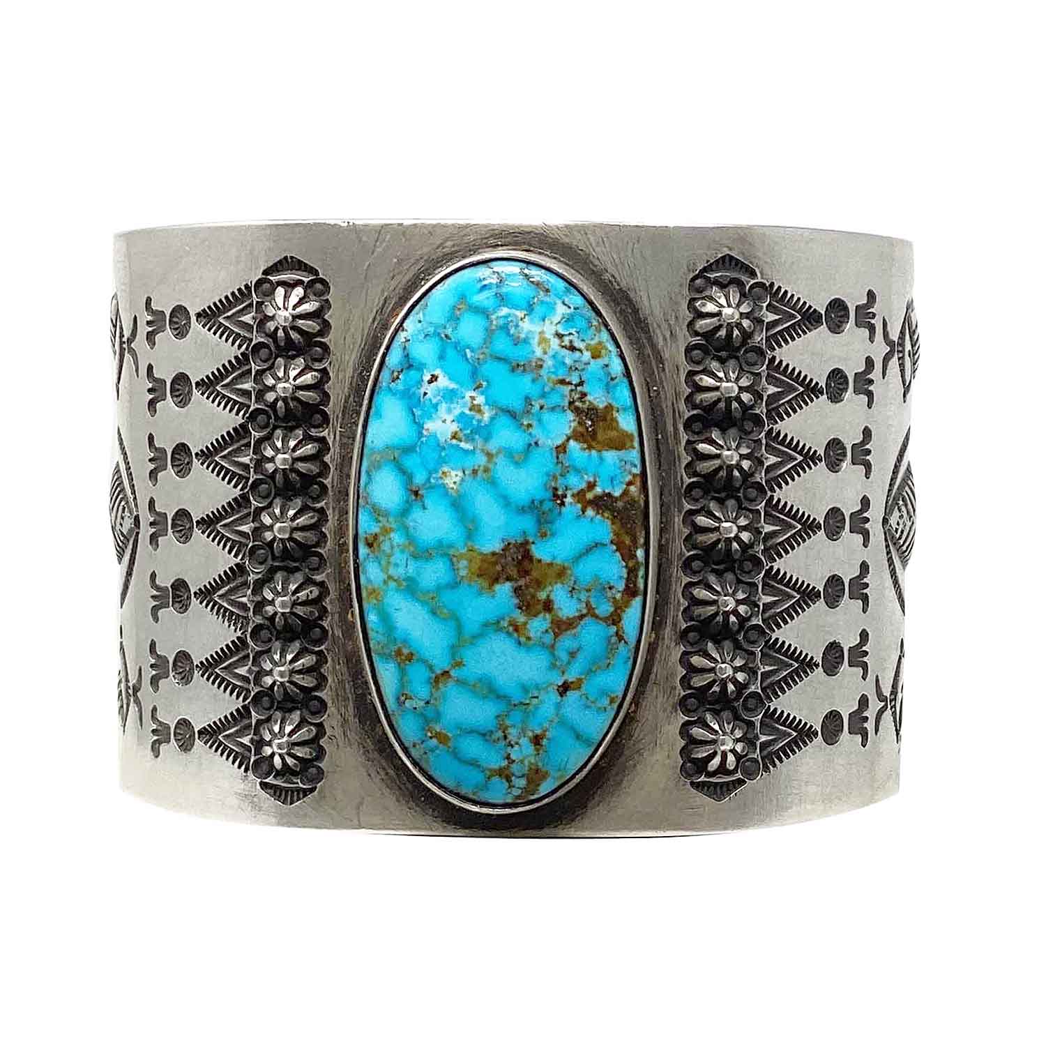 Navajo artist Edison Sandy Smith made this stunning old-style cuff. Edison has mastered the very popular repousse style, and his work is collected around the world. I think of his work like I do a Teec Nos Pos weaving, in that it is Navajo made but seems to have an influence beyond the Four Sacred Mountains. His stamp patterns are like no others you will find, and one look at the stamp designs found on this cuff and you realize immediately their uniqueness. Another attribute of this bracelet is the size; this is a big piece of silver displaying lots of amazing Edison Smith character. Set in the center of this cuff is a piece of magnificent Kingman Turquoise rock. You will find it has been filled with amazing color. A rich blue Arizona rock that shows off a web of matrix The finish of the cuff is a wonderful antique style that gives the bracelet a turn of the 19th Century look. We don't get many of these big stone and silver pieces by Edison often, so if you have wanted one to click the buy-it-know button.