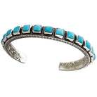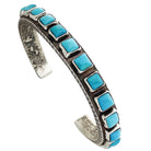 The row bracelet is a Navajo classic. It is a great way to show off beautiful stones in a traditional silver setting. This cuff is a wonderful size that will allow you to dress it up with others, or something that can be worn alone to show your appreciation of handmade art. Heavy sterling silver has been used to showcase the sky-blue cuts of Kingman Turquoise. Navajo artist Ernest Rangel crafted this bracelet using sand casting techniques giving it a real unique Southwest flavor. Check out the online trading post, we have this style in a number of colors.
