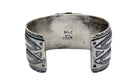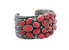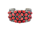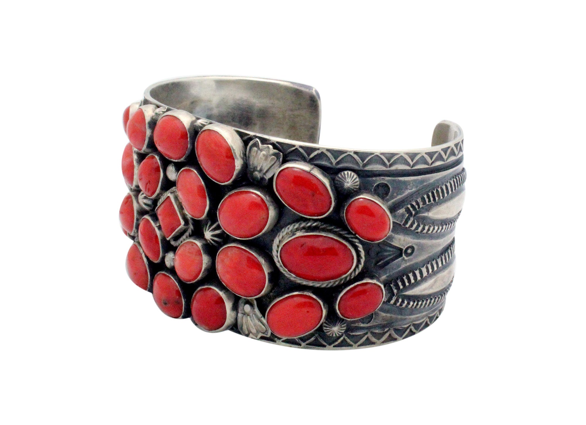 Navajo silversmith Gary Reeves made this stunning coin silver cuff. He brought this silver and coral creation to life with his hands. The bracelet is made by old techniques that require lots of hammering and heat. On each end of the cuff Gary has created large oval bump out that gives the piece a wonderful old Navajo style. You will also find stamp work, silver drops, and cutouts along with decorated edge to fill the piece with a magnificent Southwest style. In the center of the cuff is a spectacular display of beautiful red Mediterranean Coral. The stones have been set in a classic Navajo cluster pattern. All of the perfectly matched small square coral stones look fabulous against the antique brushed finished silver. Coin silver is what the first Navajo silversmiths used, and when you hold a piece of handwrought jewelry in your hands you just feel the difference.