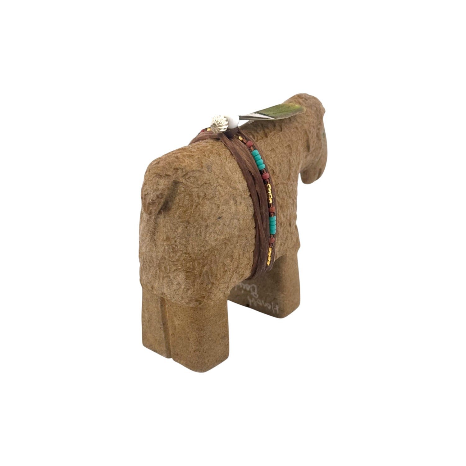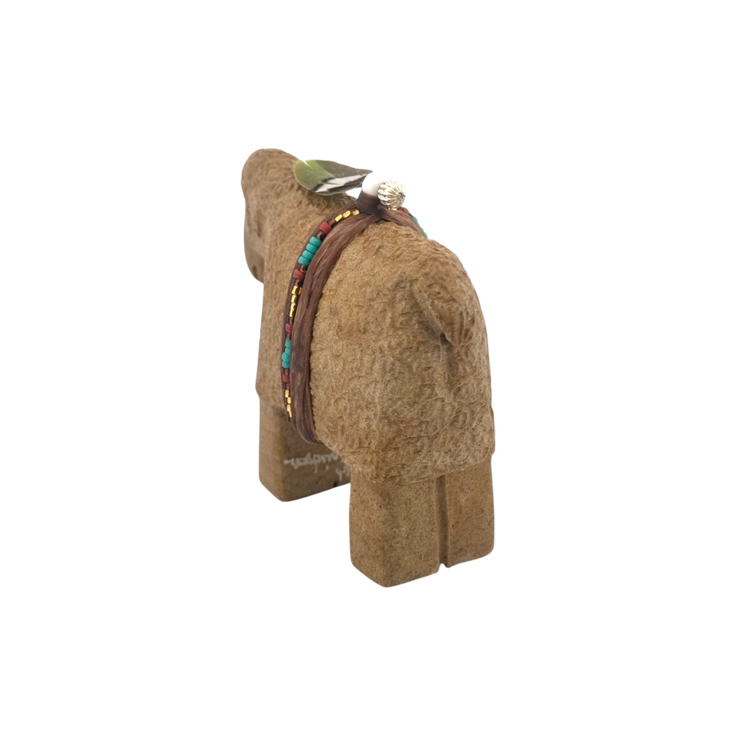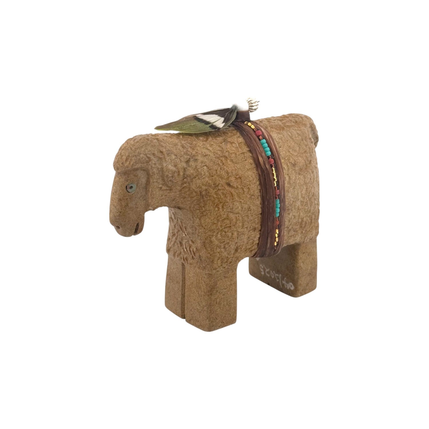 This charming Zuni handmade sheep fetish by Harold Davidson is masterfully carved from warm-toned alabaster, bringing out the gentle and grounded nature of the animal it represents. The artist skillfully uses oil paint to define lifelike details, from the sheep’s textured fleece to its expressive eyes. Adorned with a traditional offering bundle of turquoise, coral, shell, and heishi beads, this piece honors the Zuni tradition of imbuing fetishes with blessings and symbolic meaning. The sheep represents abundance, community, and nurturing energy, making it a meaningful addition to any collection. Davidson’s attention to detail and reverence for his craft are evident in every curve and carving. This fetish is not only a work of art but also a vessel of cultural heritage and spiritual symbolism. A perfect display of artistry that blends natural beauty with traditional Zuni beliefs.