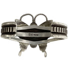 Navajo silversmith Herman Smith makes gorgeous pieces of wearable art. Plus, he comes up with some very unique designs that look so good in silver. This is a signature look for him. He does the butterfly in lots of different styles like earrings, concho belts, barrettes, and this popular cuff. It begins with the large, stamped butterfly that showcases two deep blue Kingman Turquoise stone for the body. Around the head you will find twisted wire antennas, silver bead eyes, and a stunning mirror polish. Herman uses thick pieces of silver to make the butterfly and bracelet shank, one that compliments his style perfectly. Look over the online Trading Post for more amazing Herman Smith creations.