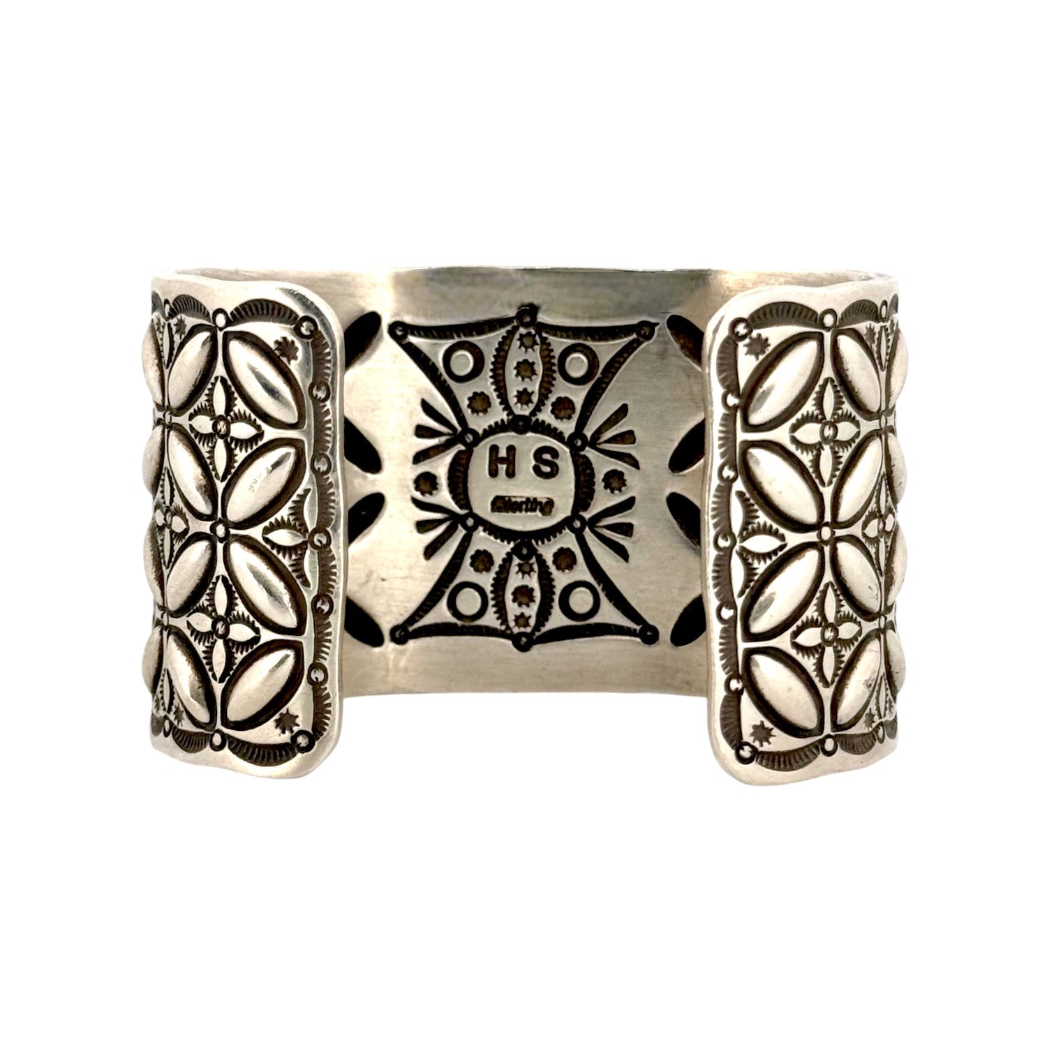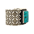 This bold bracelet by renowned Navajo silversmith Herman Smith showcases exceptional craftsmanship and traditional design. Handcrafted in sterling silver, the cuff features a striking rectangular Waterweb Kingman Turquoise stone, celebrated for its vivid blue hues and intricate black matrix. The stone is framed in a finely detailed bezel with twisted rope accents, enhancing its natural beauty. Surrounding the centerpiece, the silver cuff is adorned with deeply stamped patterns in repeating geometric motifs, adding both texture and dimension. Herman Smith is well known for his mastery of classic Navajo stampwork, and this bracelet is a testament to his artistry. Substantial in weight and presence, it carries both cultural significance and timeless elegance.