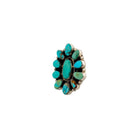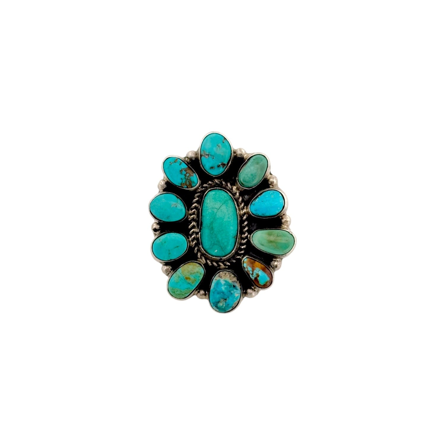 This Navajo handmade ring by artist Geraldine James showcases a vibrant cluster of multi-turquoise stones set in beautifully crafted sterling silver. At the center, an elongated turquoise cabochon is framed by a halo of smaller turquoise stones, each displaying unique shades of blue and green with natural matrix patterns. The varied turquoise creates a lively and organic composition that highlights the natural beauty of each stone. Detailed silverwork and traditional cluster styling reflect the skill and artistry characteristic of Navajo jewelry making. This striking ring is a timeless statement piece that celebrates the rich color and craftsmanship of authentic Navajo handmade jewelry.