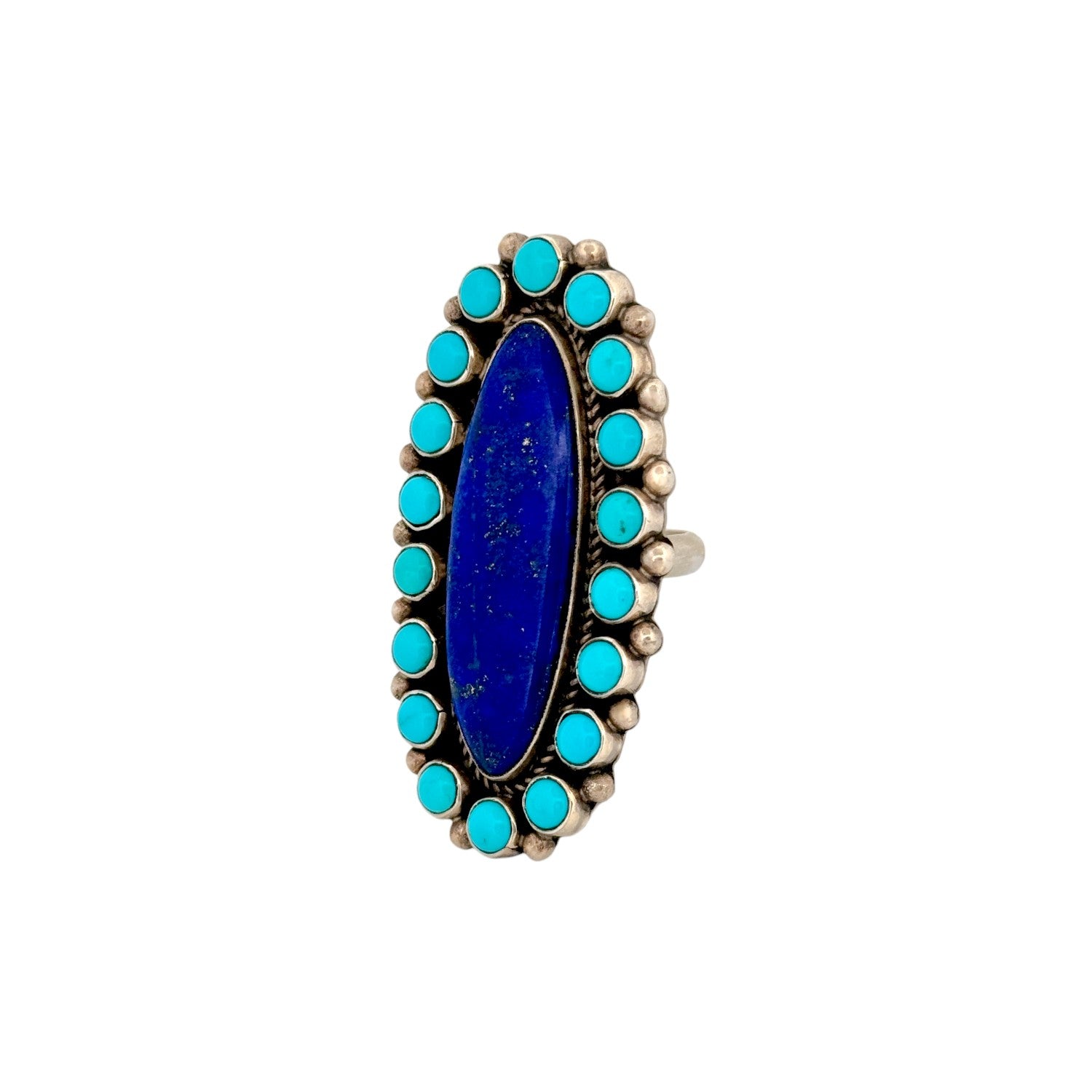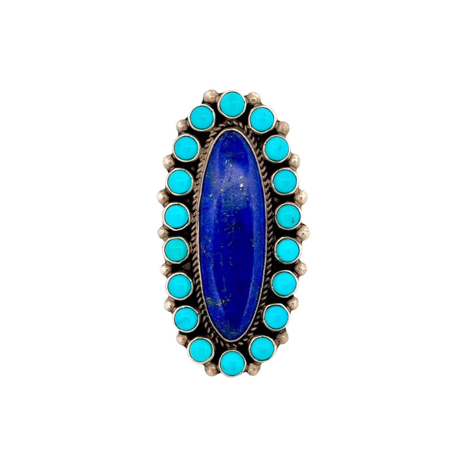This Navajo handmade ring by Geraldine James features a striking combination of Sleeping Beauty turquoise and deep blue lapis lazuli set in sterling silver. The elongated lapis lazuli center stone creates a bold focal point, beautifully framed by a halo of bright Sleeping Beauty turquoise cabochons. Subtle silver bead accents and twisted rope detailing add texture and depth to the elegant design. The vivid contrast between the sky-blue turquoise and rich lapis gives the ring a powerful, balanced presence. Distinctive and refined, this ring is a stunning example of skilled Navajo silversmithing and stonework artistry.