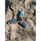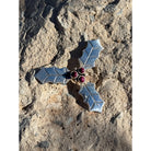 This elegant Navajo handmade pin by Lee Charley features a beautifully sculpted holly design crafted from polished sterling silver. The three leaves are shaped with clean, graceful lines and detailed veining, showcasing Charley’s refined silversmithing skills. At the center sit three rich purple spiny oyster shell cabochons, adding vibrant color and creating a striking focal point. The combination of smooth silverwork and bold shell accents gives the piece both festive charm and timeless Southwestern character. Perfect for holiday wear or year-round collectors, this pin is a testament to Charley’s artistry and craftsmanship.