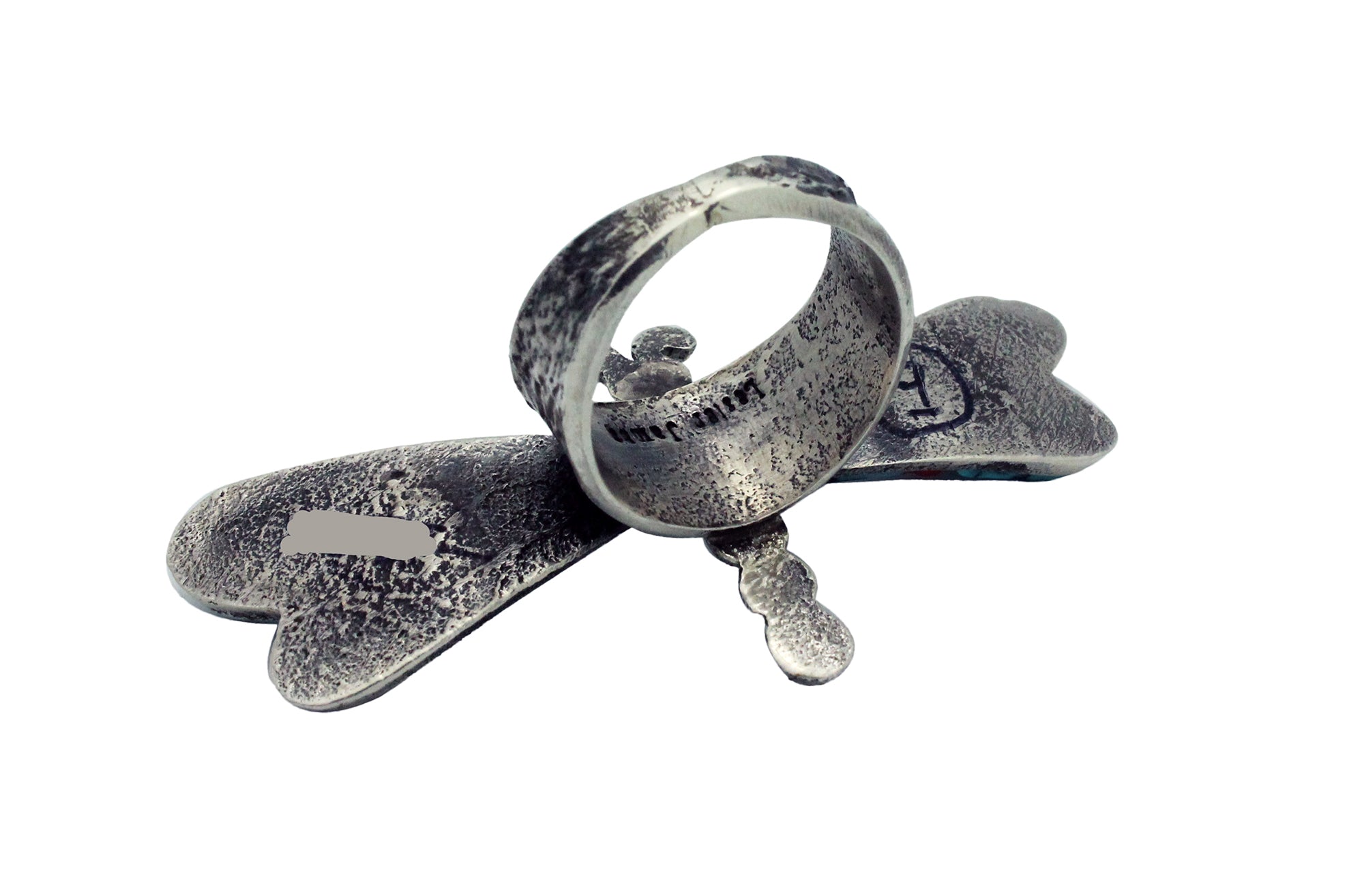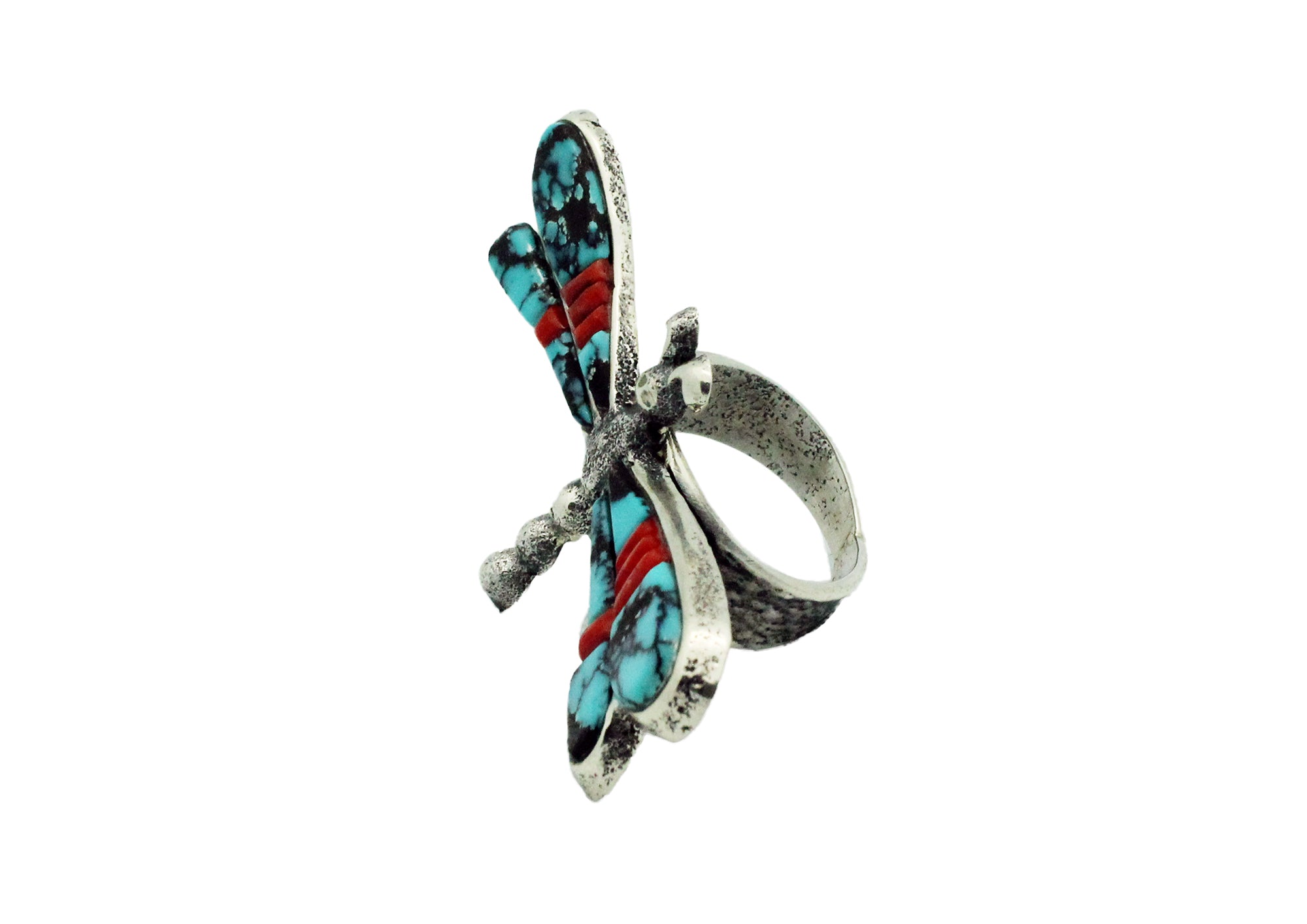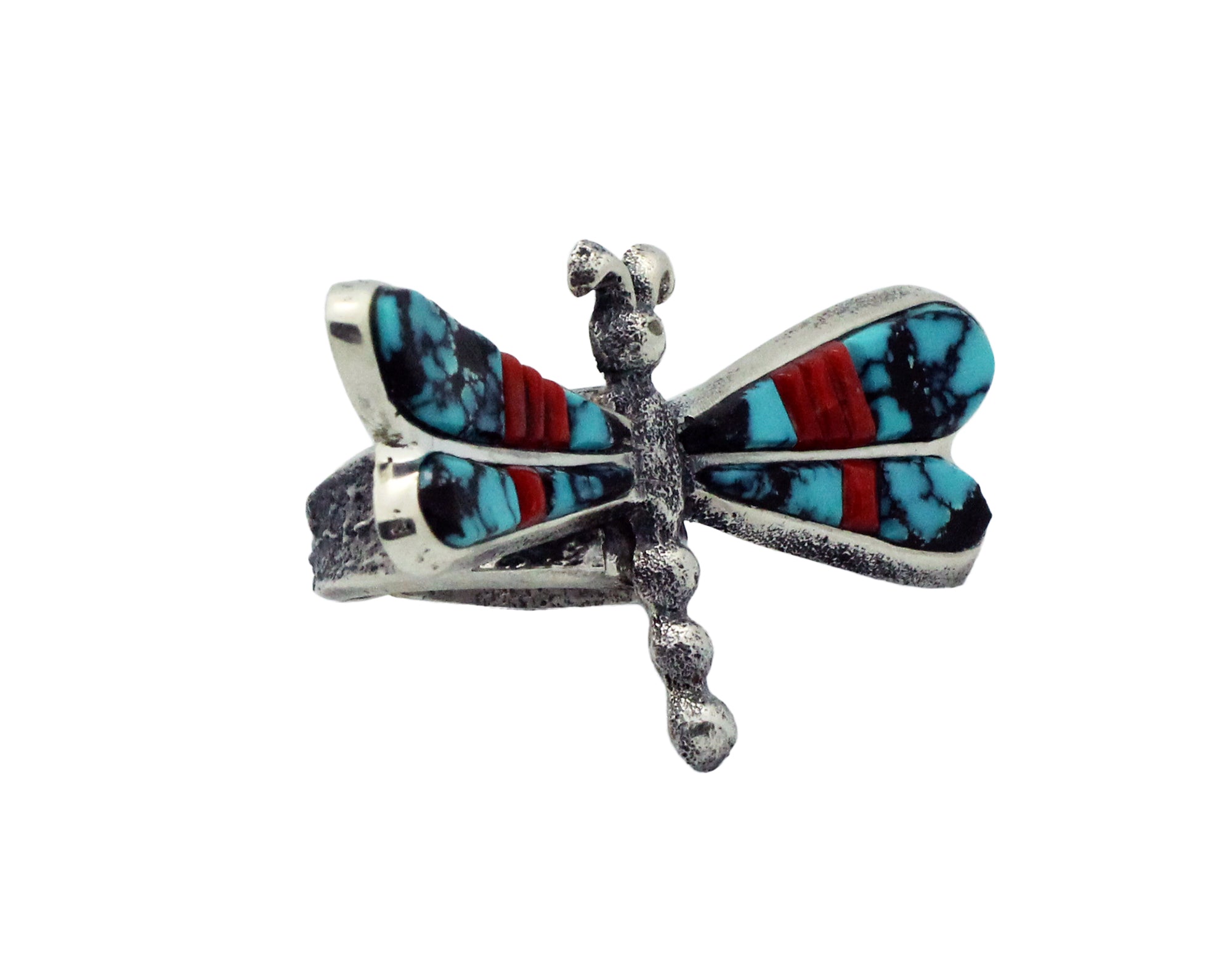 Lester James, Ring, Dragonfly, Turquoise, Coral, Silver, Navajo Handmade, 9