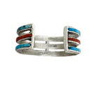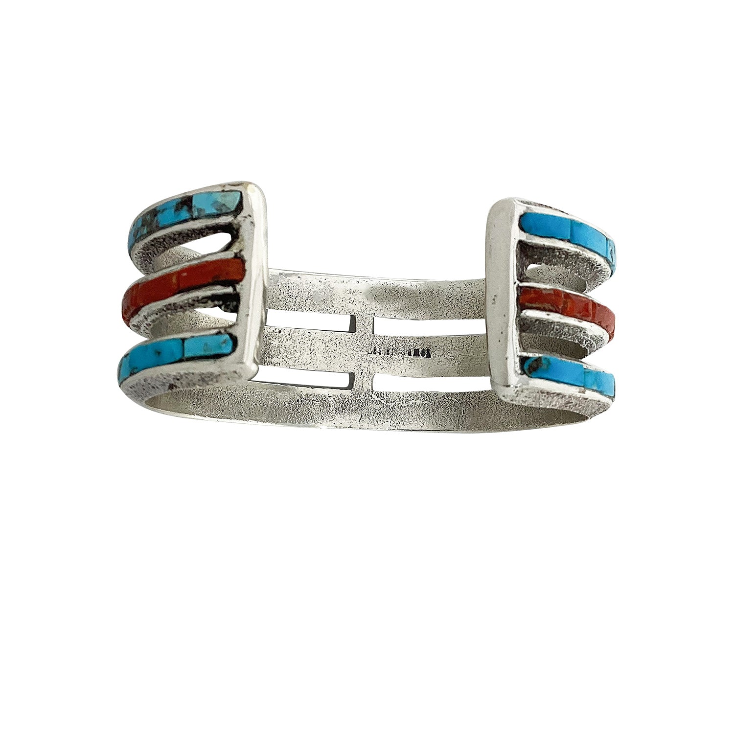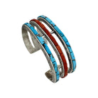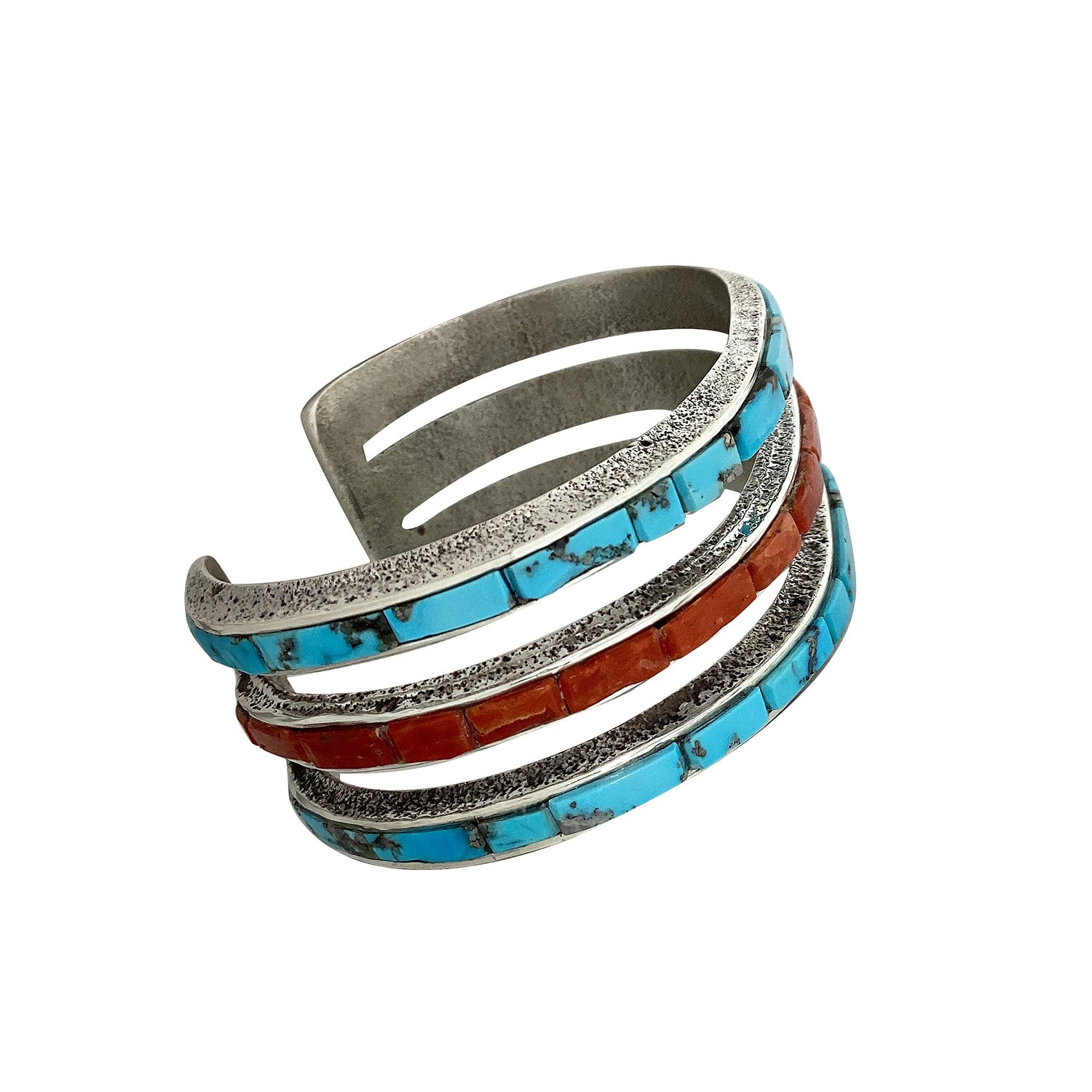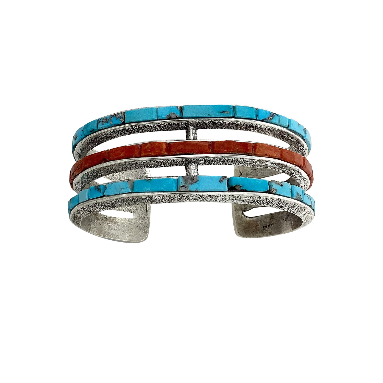 Navajo artist Lester James creates the unique and wearable. He learned more than technique from Navajo artist Aaron Anderson. You can see that Lester always wants to try new looks that begin with his tufa carving. This time Lester has carved three channels that spread across a heavy and wide bracelet. He has filled them with a dark blue with black matrix Kingman Turquoise and some dark red Coral. The stones are all perfect matches and have been inlaid in a cobble stone style. We have had a few of these inlay designs by Lester, each with its own look. Make sure you check out the online Trading Post for more of Lester's unique work.
