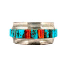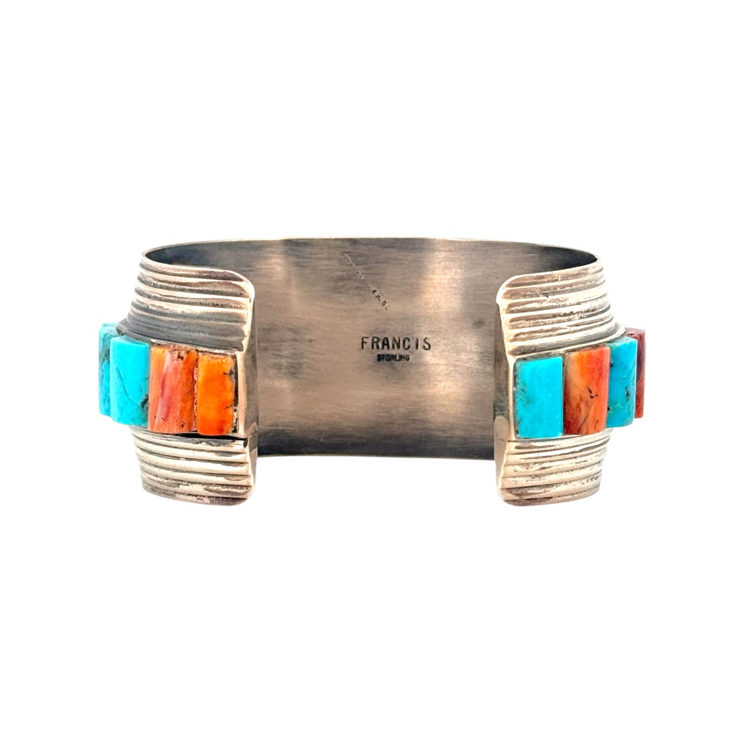 This vintage Navajo handmade bracelet by Melvin Francis exemplifies a refined balance of traditional artistry and modern Southwestern style. Made from sterling silver, the cuff features a striking multi-stone inlay design with alternating panels of vivid Kingman turquoise and fiery spiny oyster shell. The inlay is design by Lester James meticulously hand-cut and fitted, showcasing the artist’s precision and eye for harmony in color and texture. Each stone displays natural matrix patterns, making this piece truly one-of-a-kind. The bracelet’s ribbed silverwork adds a sophisticated structural element, enhancing its bold and contemporary aesthetic, elegant and substantial, it embodies the craftsmanship and heritage of both Melvin and Lester silversmithing.