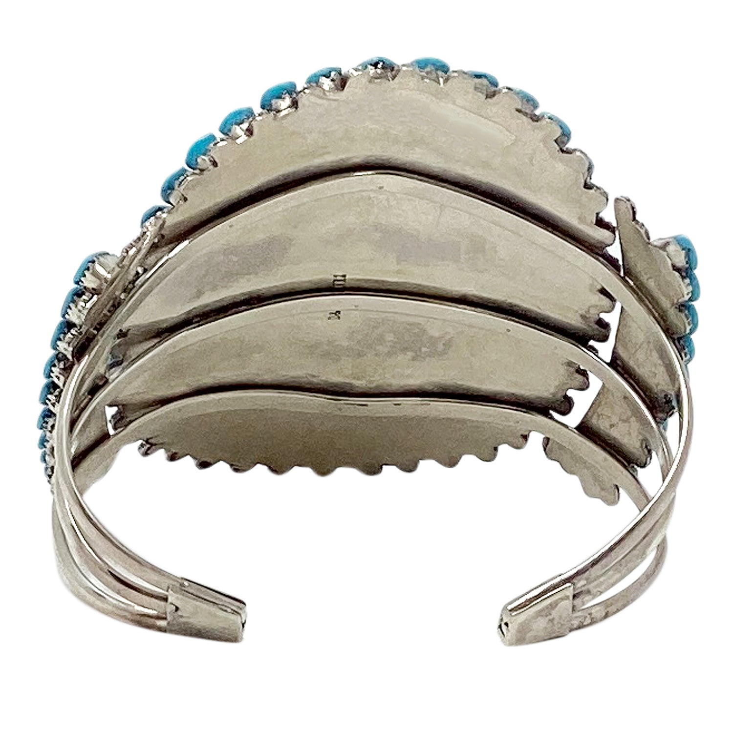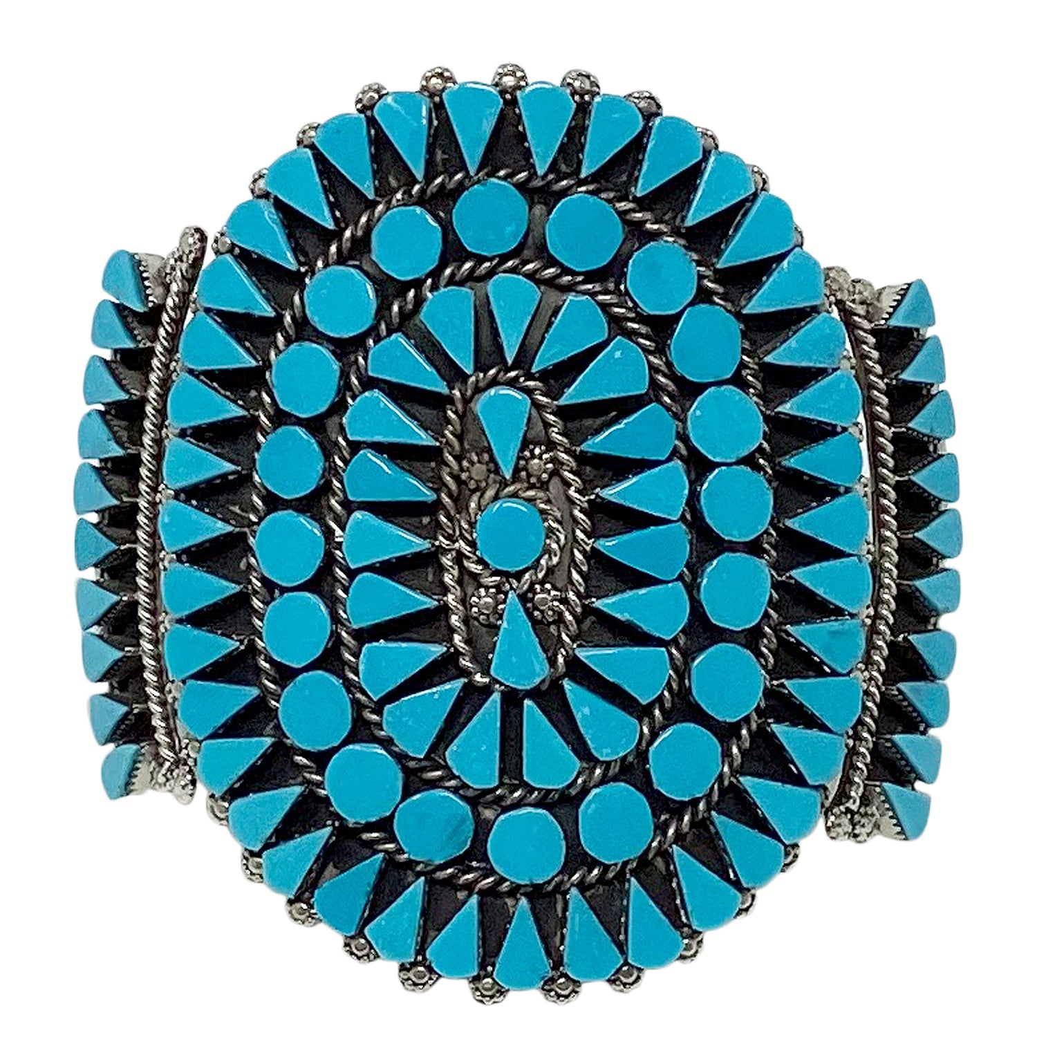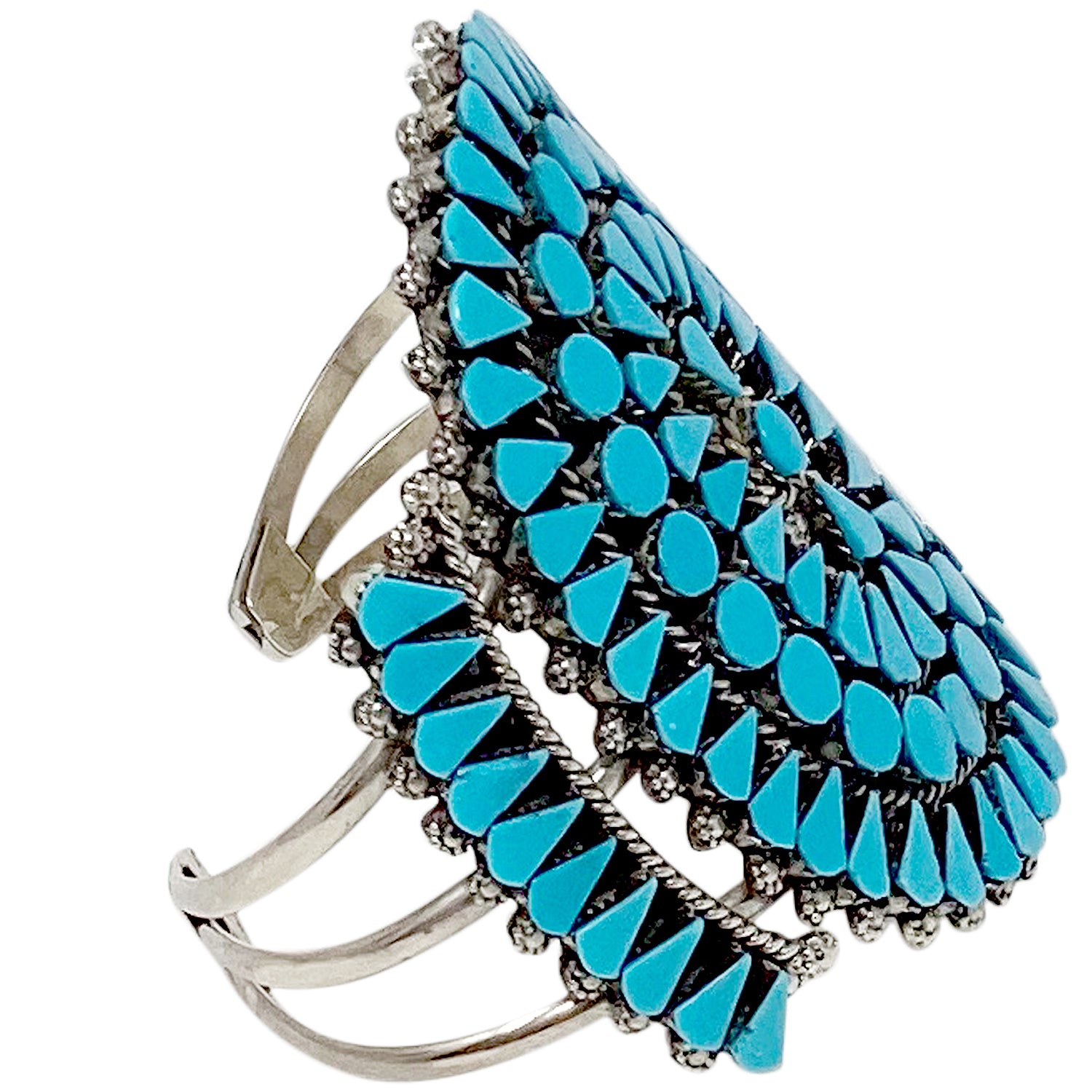 This classic Zuni cluster bracelet is a beautiful example of needlepoint lapidary work. Merlinda has created a spectacular five row cluster piece that is surrounded on each end by a row of needlepoint stones. She has mastered this Zuni style stone cutting. The turquoise is beautiful blue Sleeping Beauty Turquoise that radiates gorgeous color. Surrounding the stones you find a combination of twist wire and silver drops, adding to the beauty of the piece. This is a fantastic piece that will show your appreciation of Zuni stonework. Plus, this will look fabulous on gives you lots of options because it can be worn daily, dressed up or down.