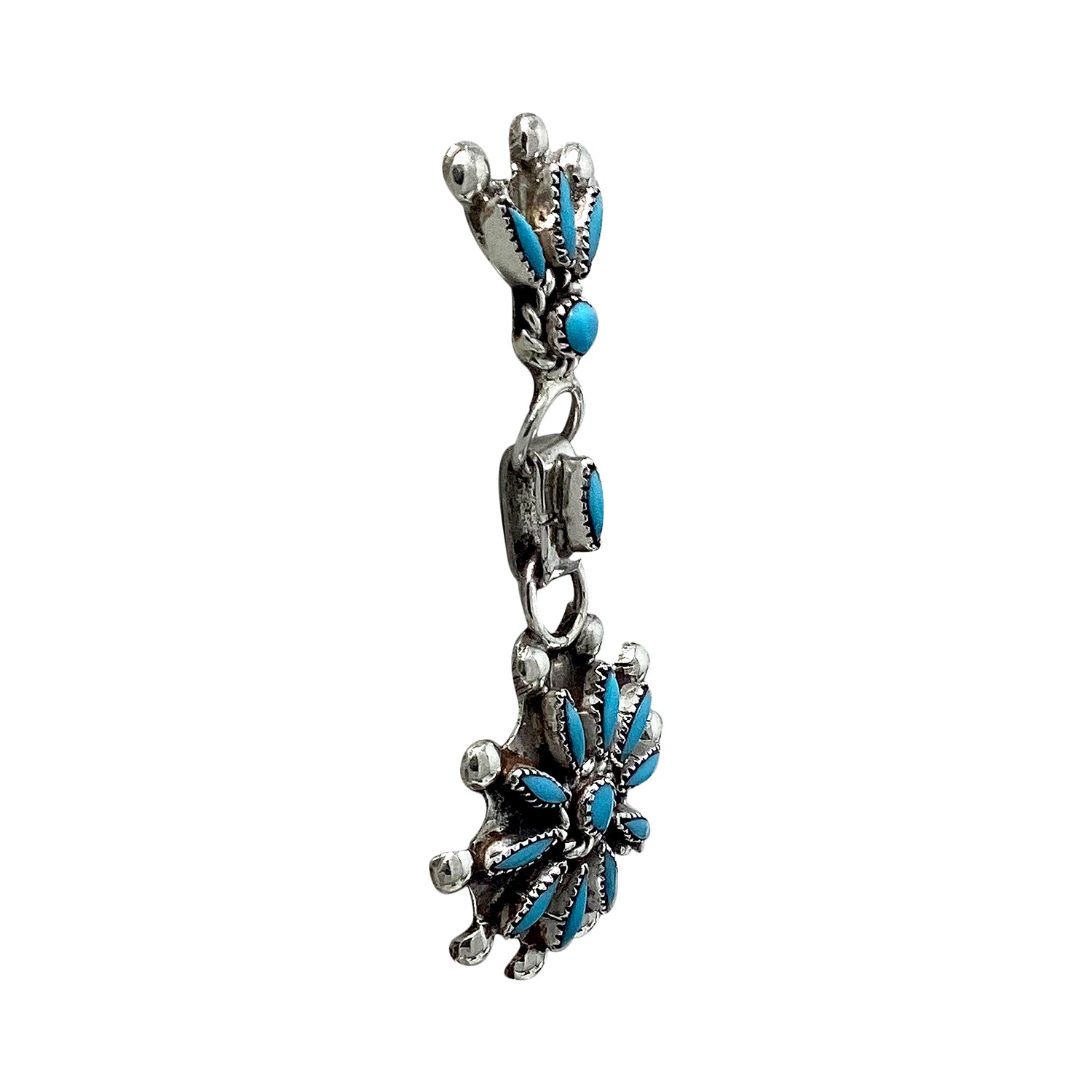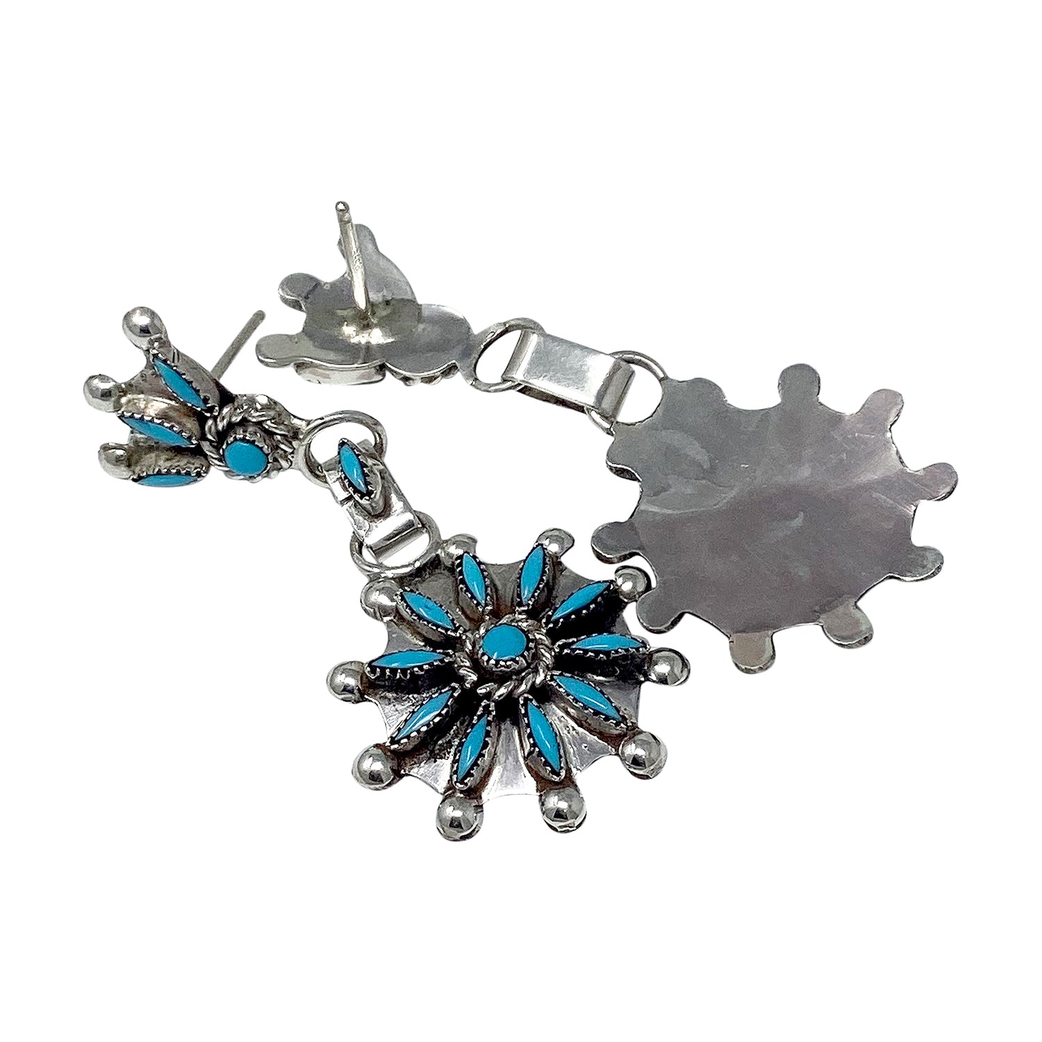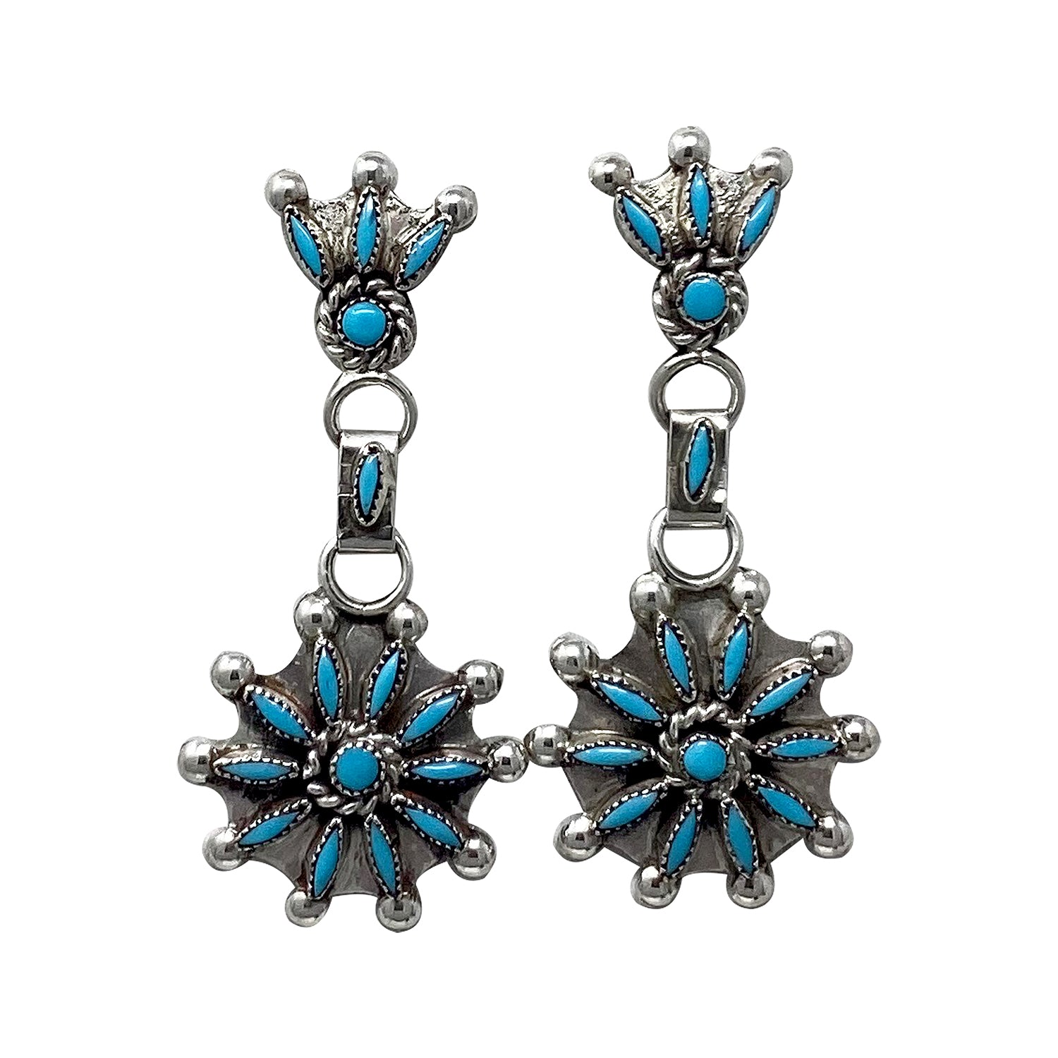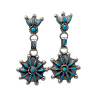 Zuni artist Merlinda Chavez made these stunning needlepoint and petit point earrings. She uses a gorgeous blue shade of Sleeping Beauty Turquoise stones. When you first take them out of the box you will be blown away by how light weighted the earrings are and to be able to wear them comfortably as an everyday earring. They begin with a small cluster of stones that leads into a link that holds the medium circle cluster, and you will find the dangles decorated with more stones. You will love your new Zuni treasure.