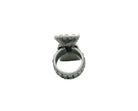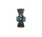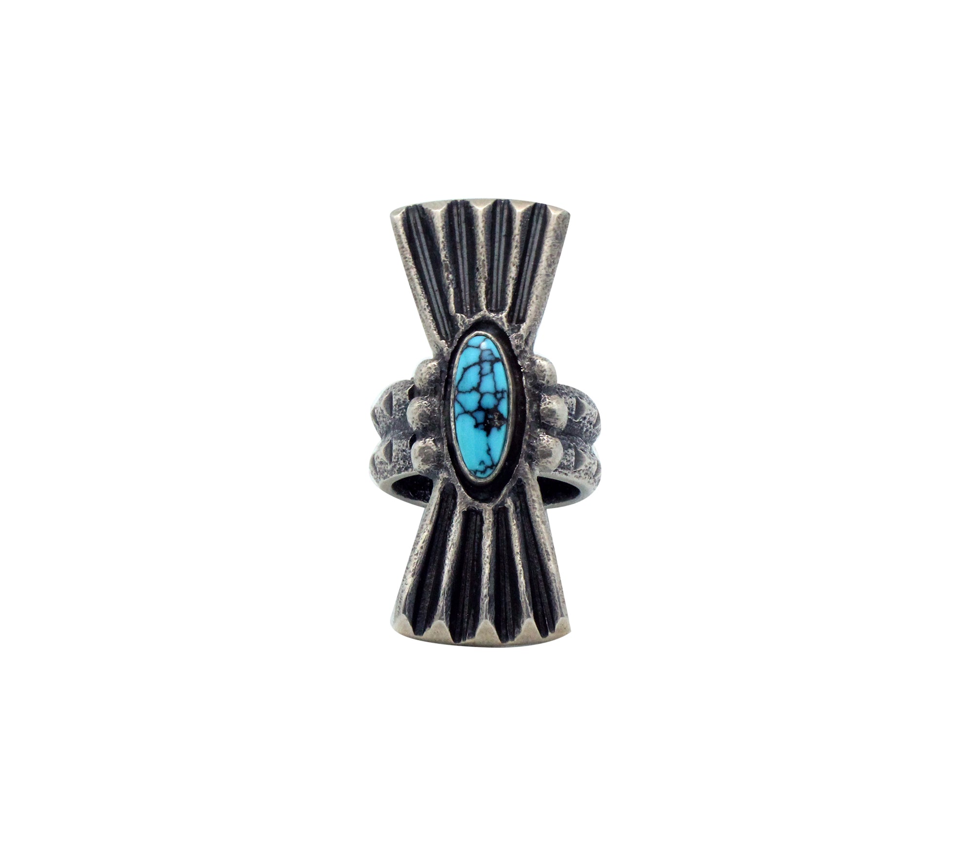 Legendary Number Eight Turquoise from Nevada has been used in Navajo silver since the 1920s. However, some would argue that this blue and black Number Eight is harder to get your hands on then Lander Blue Turquoise. You just don’t find this stone unless you come across a piece of old jewelry. This stone came out of a circa 1950s squash blossom necklace that needed to be modified. Navajo artist Monty Claw has taken the stone and set it in a bow style carved ring. The color is incredible and looks right at home in this old style creation.